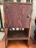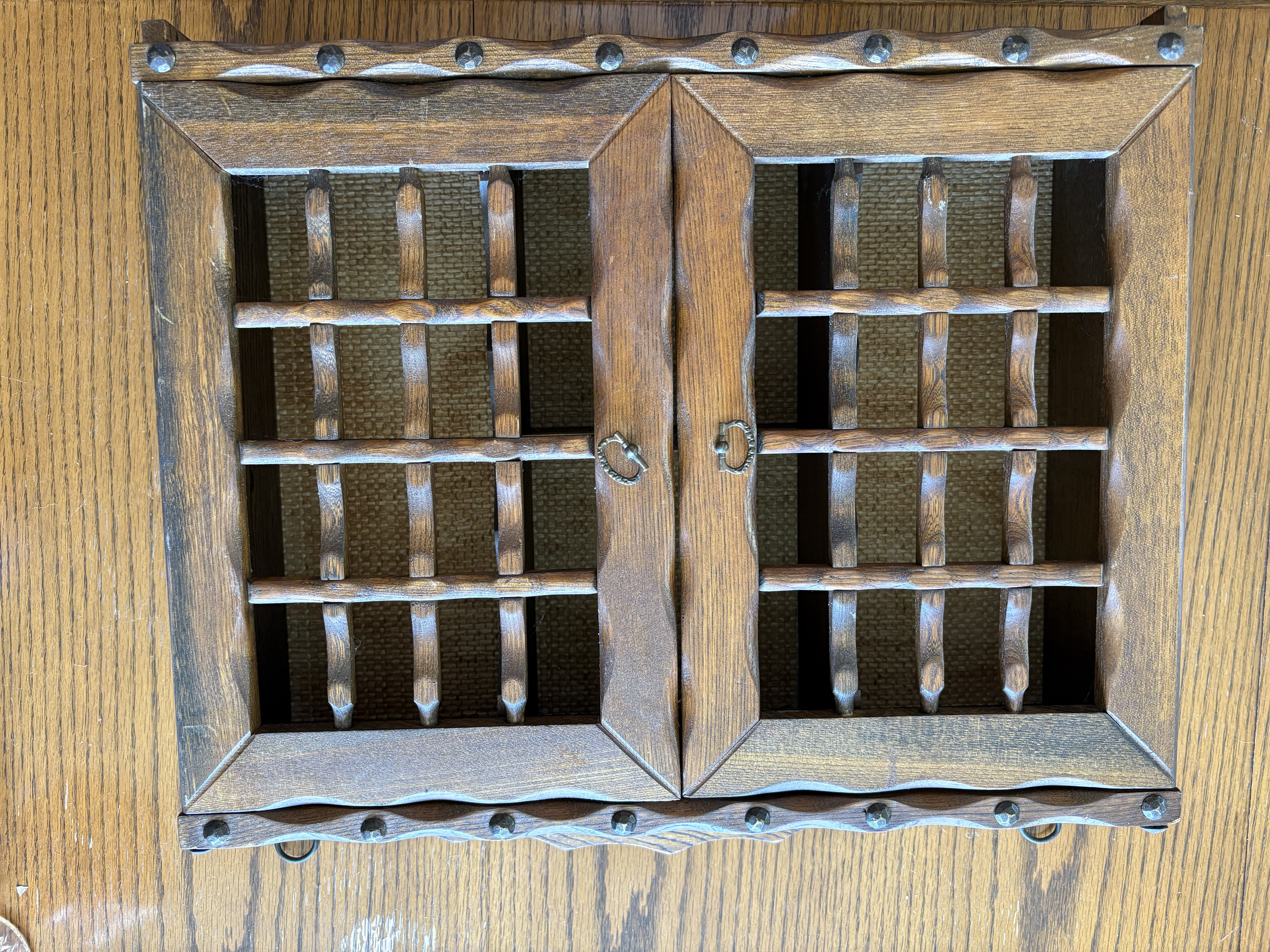 The iron-studded scalloped trim and hand-hewn appearance also suggest influence from Mexican folk furniture or Spanish Revival wall décor, which was especially common in California and the Southwest.
