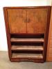 Small hanging curio shelf. Not sure of wood, as I’m a beginner. It’s dark in color has the old around the bottom and top. See photo please let me know how to correctly name these.