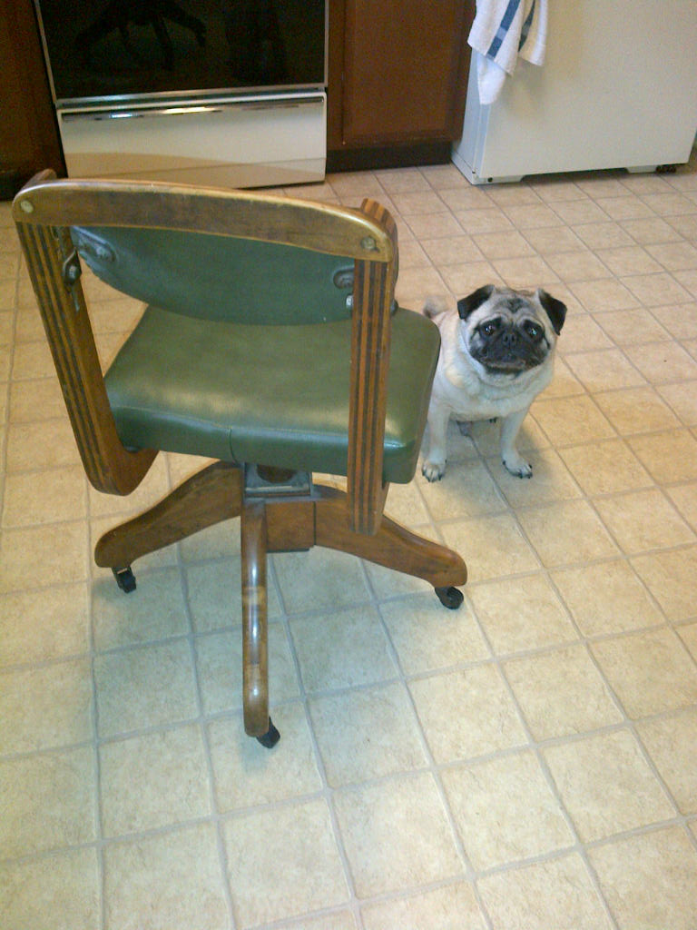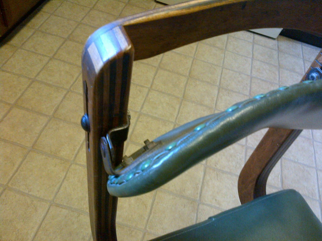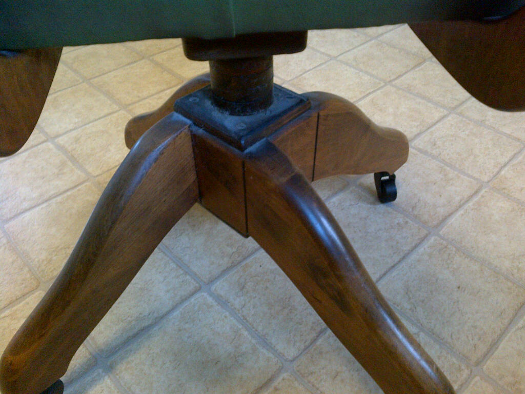Small desk chair, four legs with iron wheels and adustable back rest. Green leather padding on seat and back.