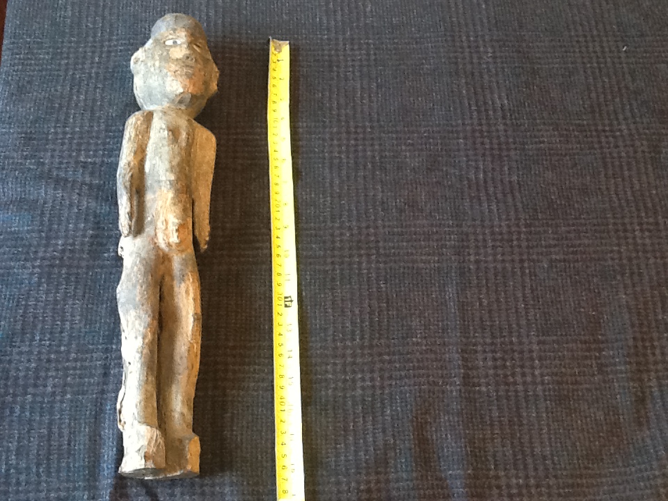 This figure used to belong to a retired foreign service employee that spent most of her career in West Africa. As a result, this figure was purchased at least 25 years ago and was on display or in storage since then. It is, approximately 16 inches in height, with glass eyes, a round receptical in the top of the head, has pierced ears and has a lot of insect damage. There appears to be residue in the round receptical. It does not stand on its own may may have never been intended to do so.