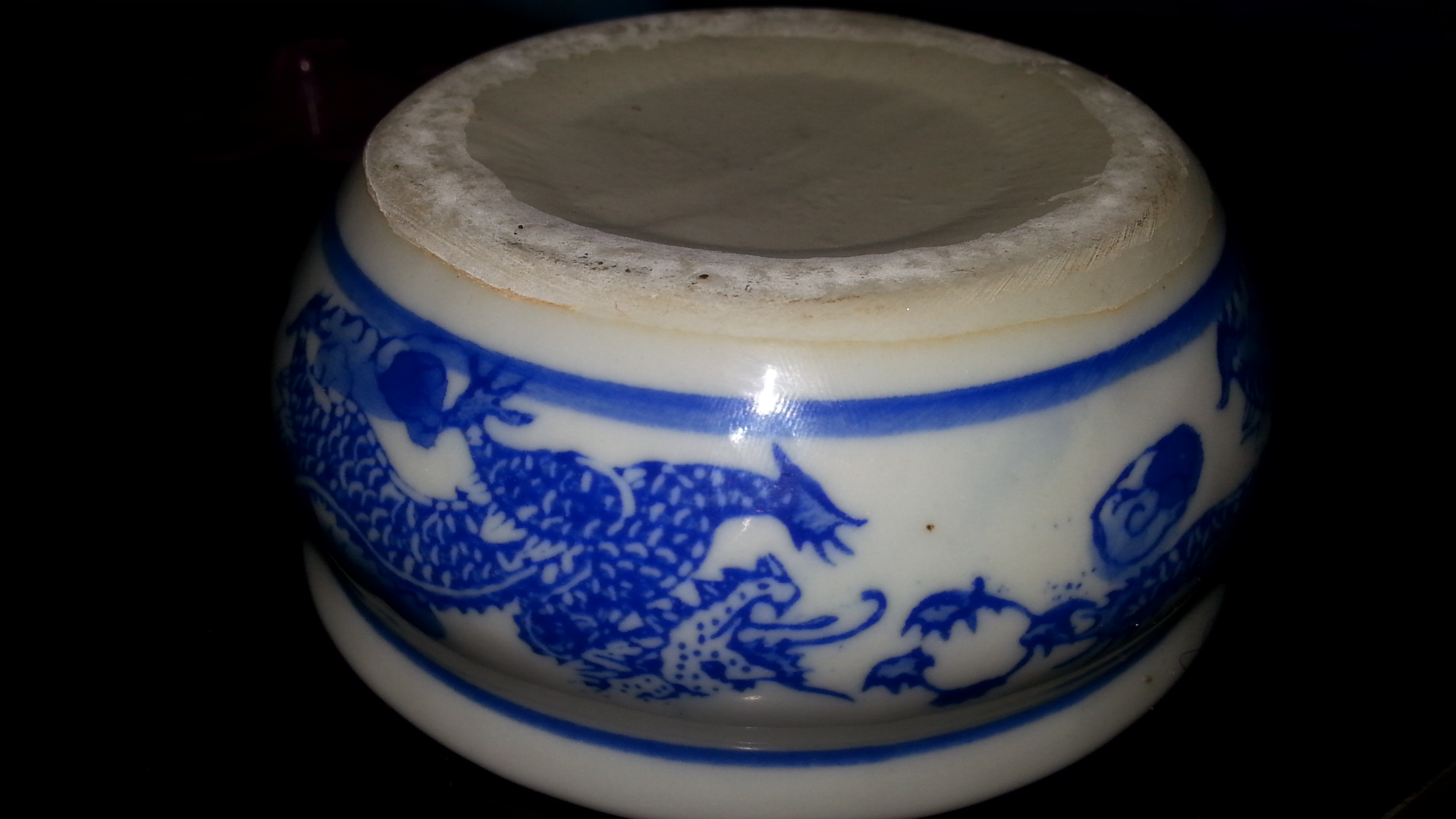 This is a small bowl like a trinket bowl. It has 3 blue dragons around it. There are no markings on bottom. The bottom is unglazed. The clear glaze goes over the design and over the lip. It stops about half way down the inside of bowl. It is uneven. The inside of bowl is unglazed everywhere else. There is an orange colored rim around where the glaze stops. There are 2 blue lines that outline the dragons. One on top and one on bottom. The top lip is outlined with blue lines. The clay is white and on inside u can see a swirl in the clay. I need to know when and who made this.