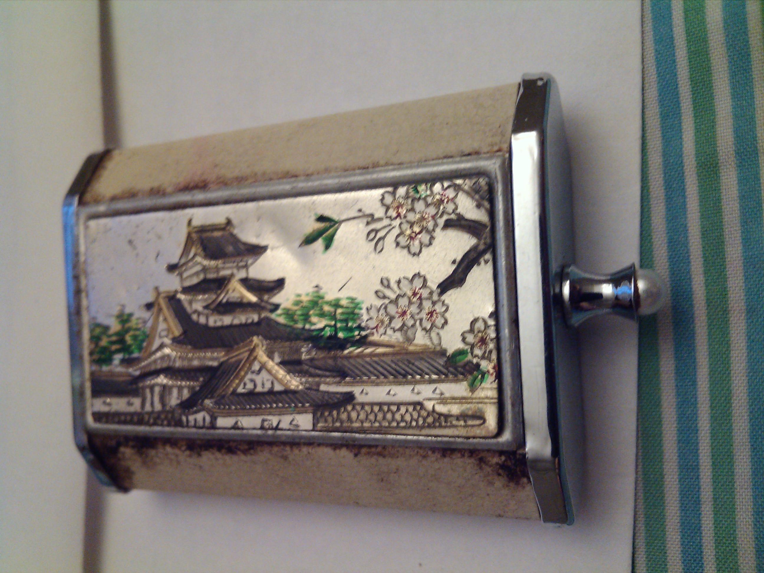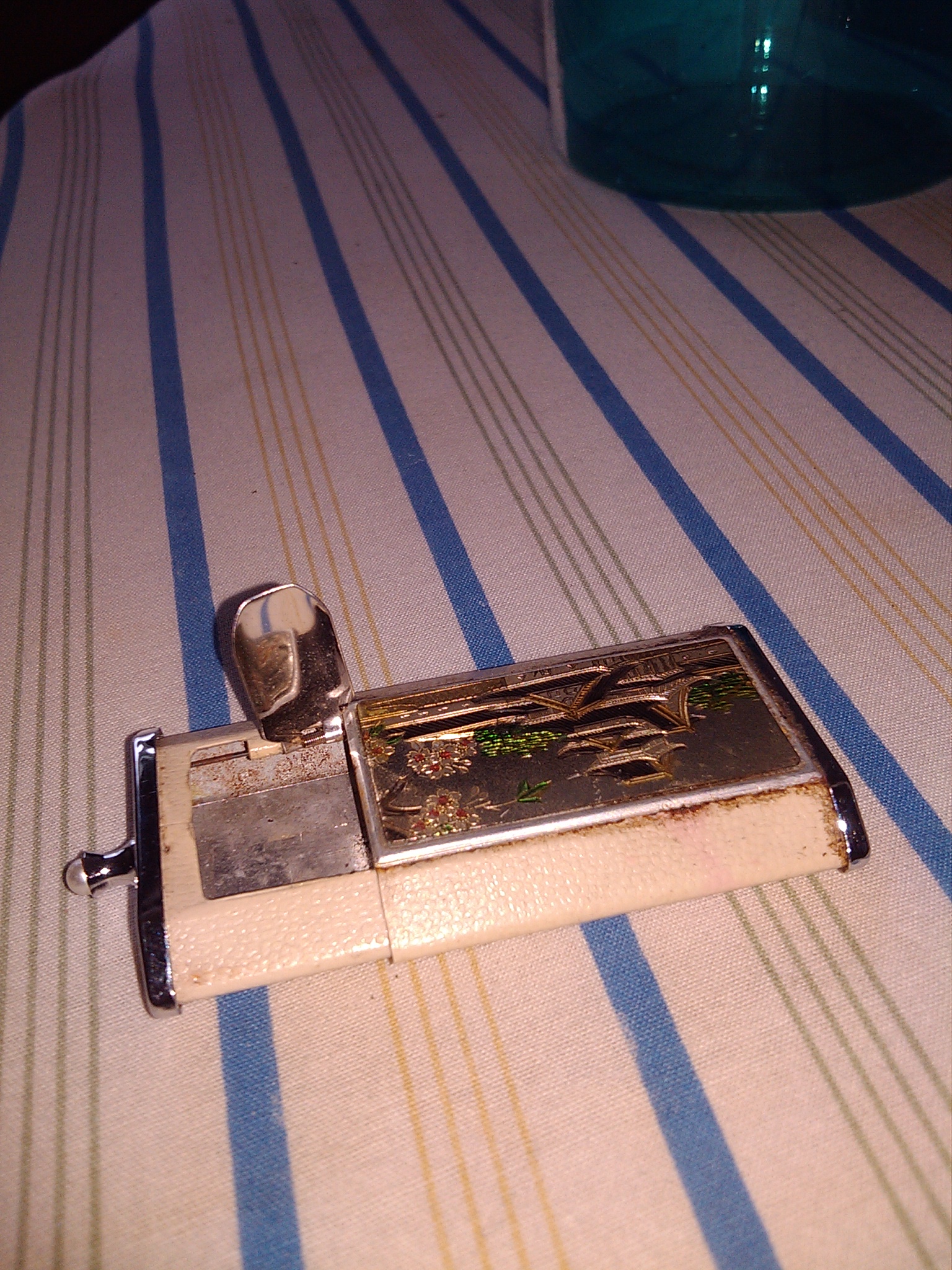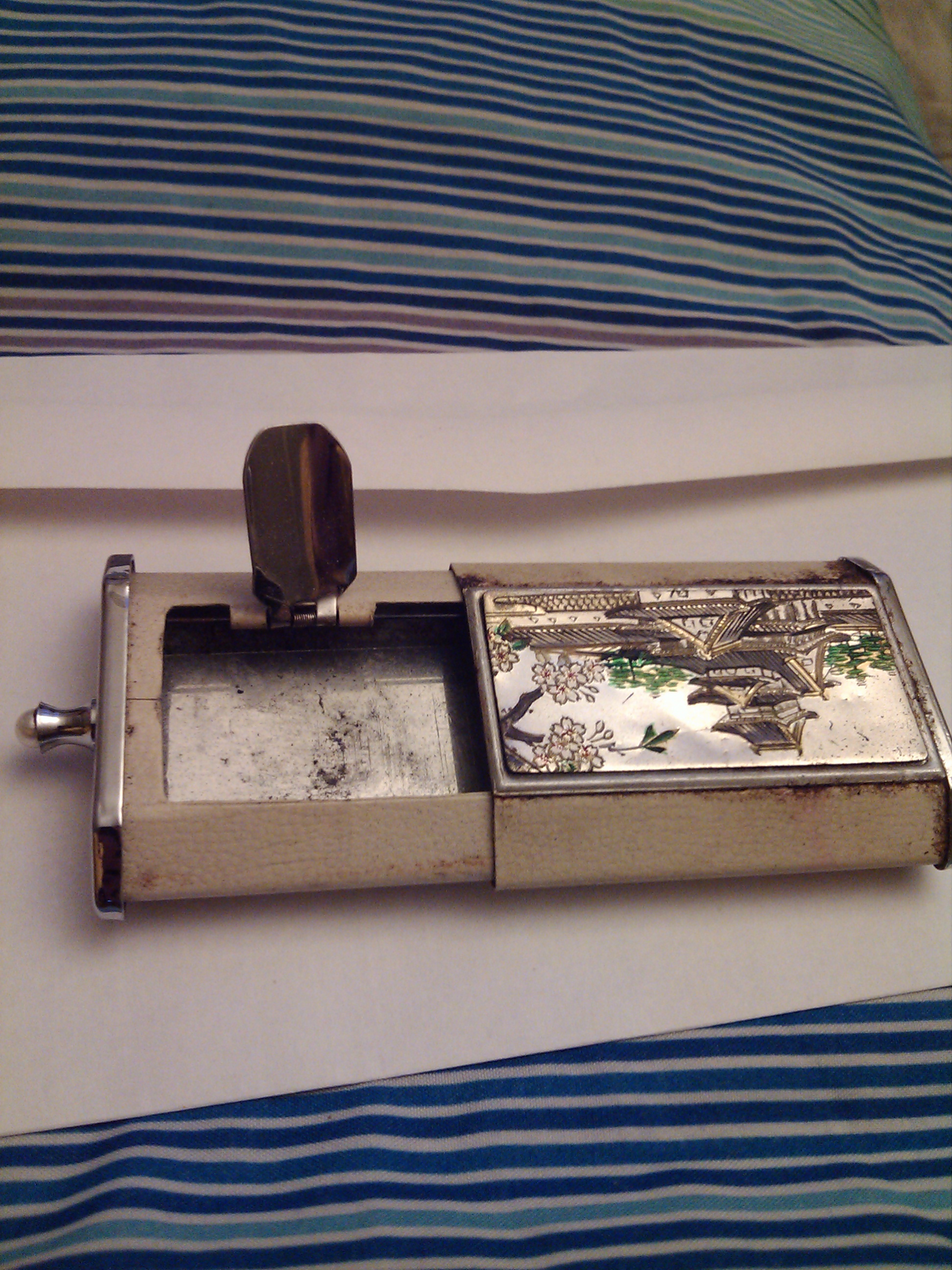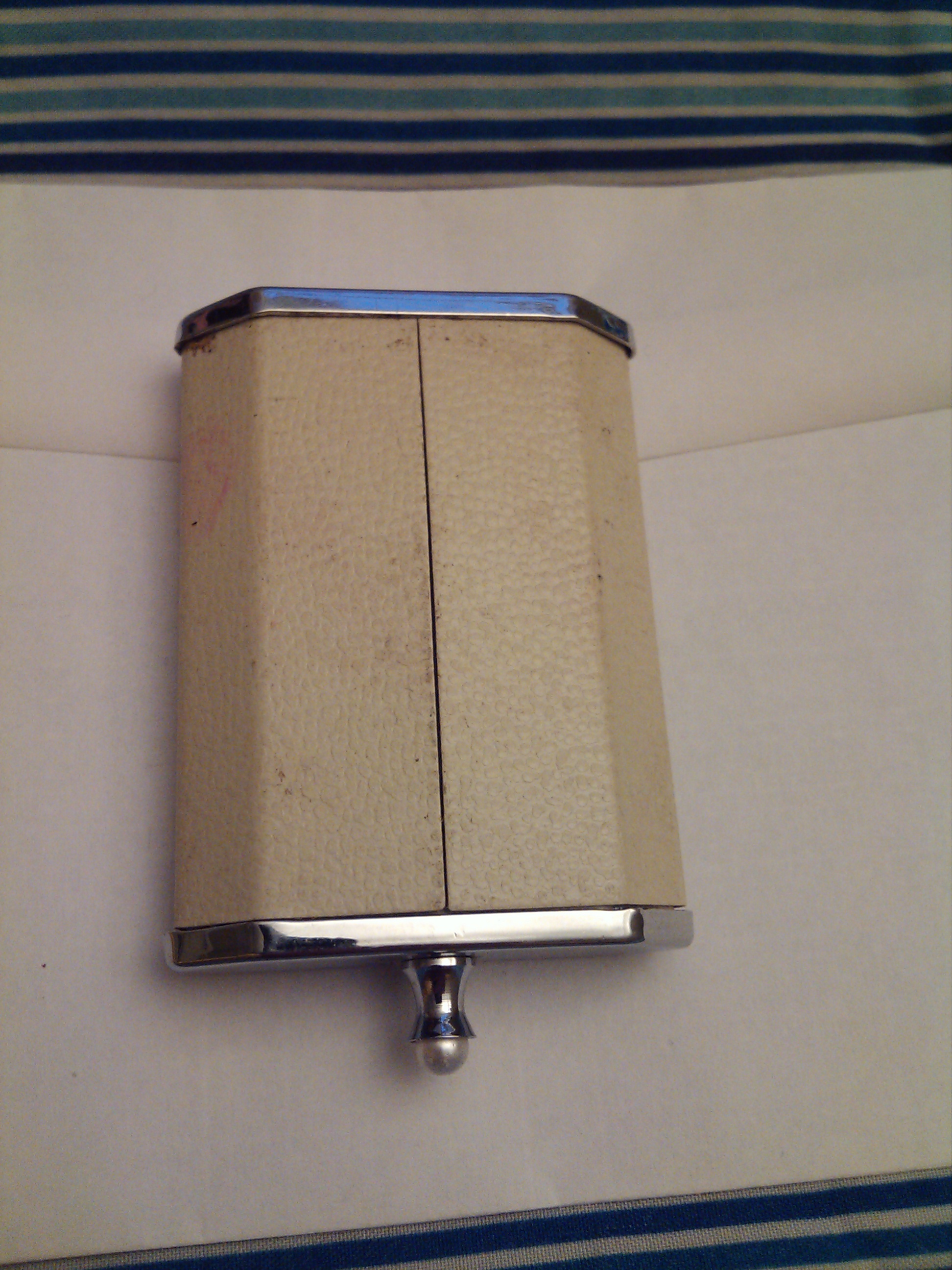 This little box has a slide out drawer and a metal piece pops up. It has a pearl on the handle and is made from metal and leather.
