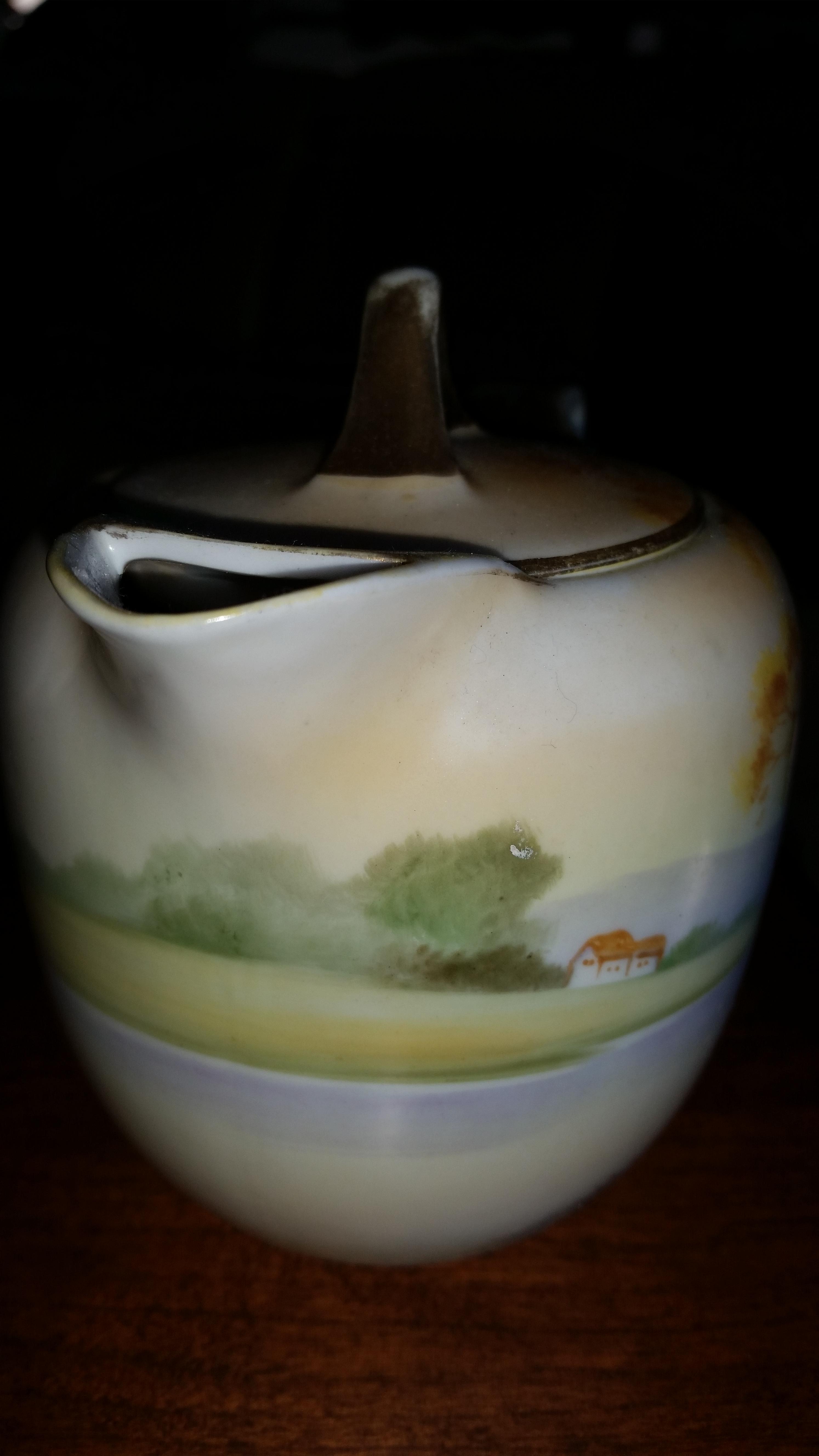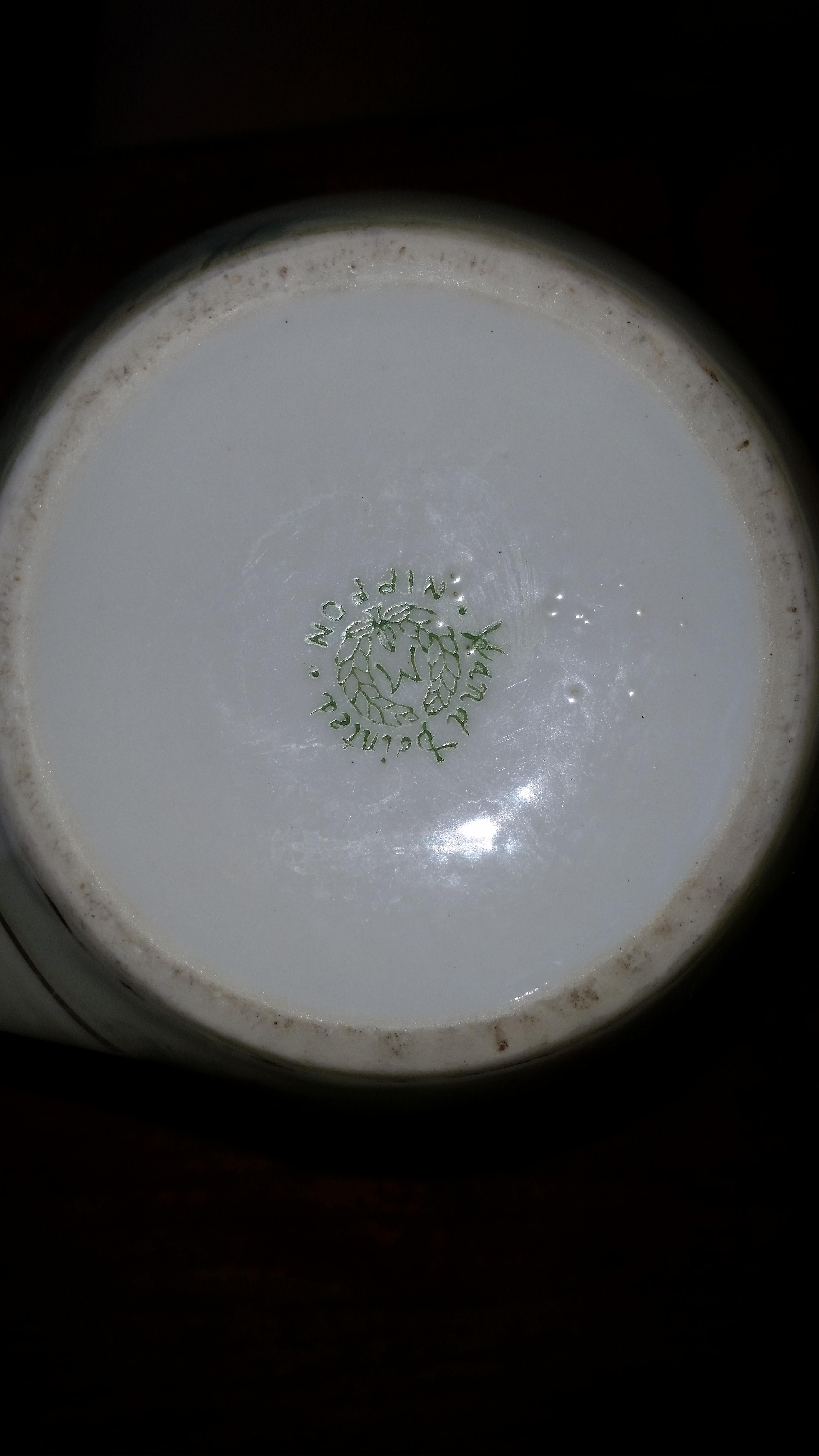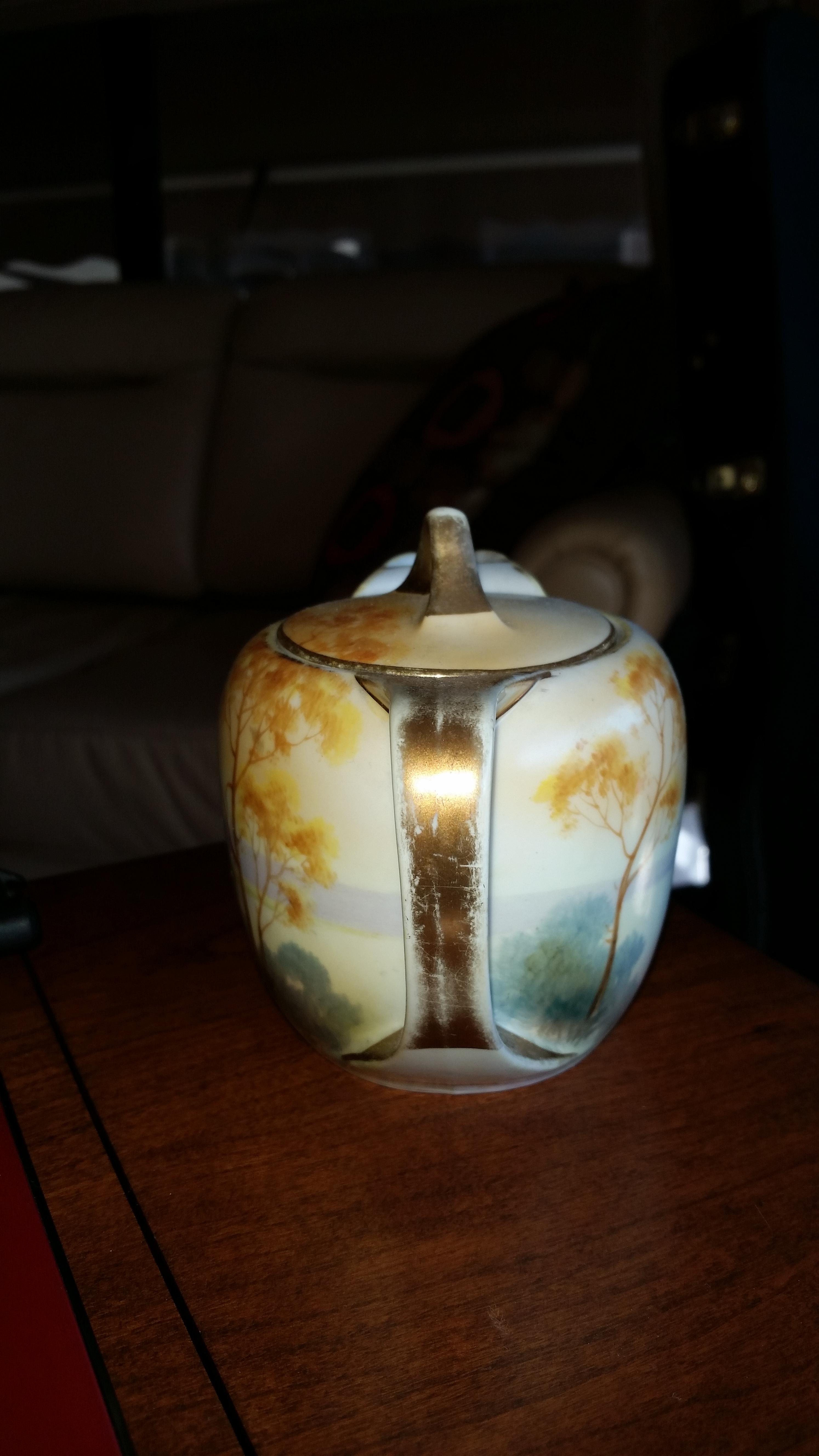This was a gift. It says Nippon Hand Painted on the bottom. The painting on the lid and pot line up. I really don't know anything ele about this item except that I love it.