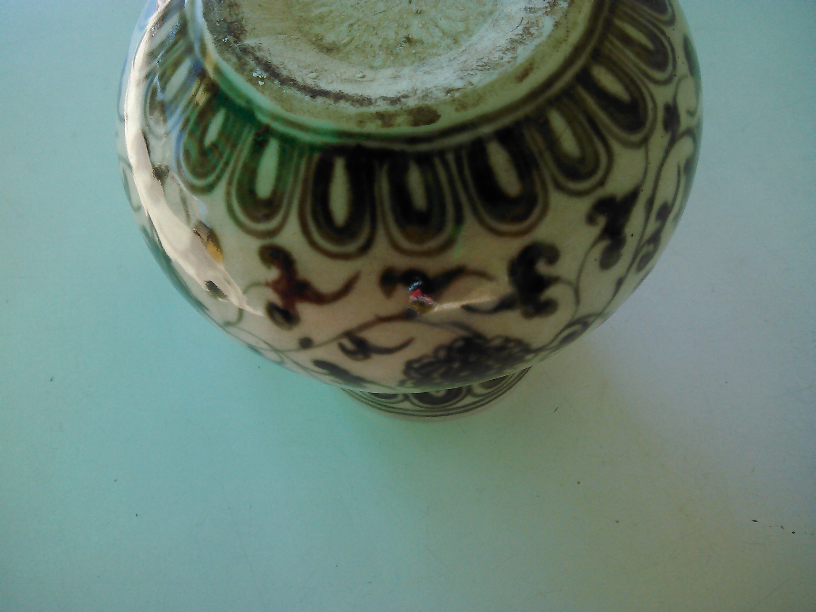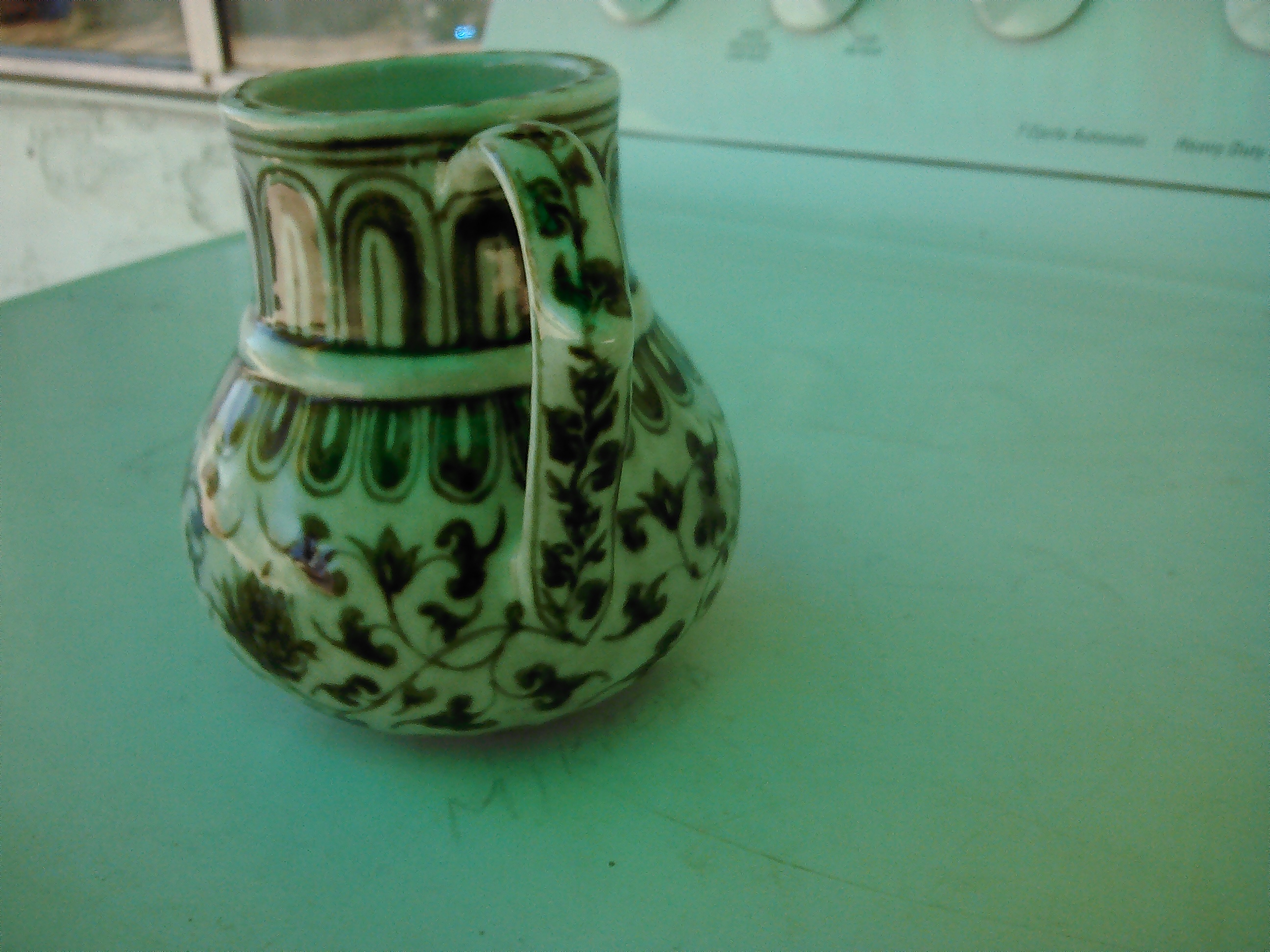 its very dark blue almost black has a just polished look so its shines. I found one very similar to my jug listed in the british museum as a ming jug. Its 13 cm tall and 33 cm wide