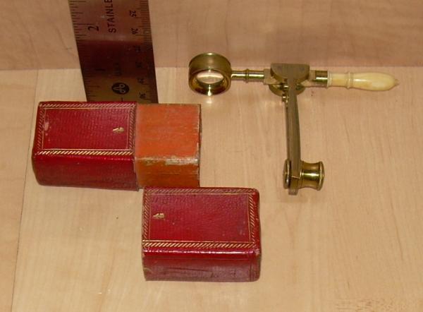 This brass tool has a small magnifying glass on one side and a bone handle on the other. The glass and handle fold up into a frame with a screw that seems to be designed to attach to something. It fits into a red leather-covered cardboard telescoping box. I do not find any sort of makers' marks on it. It might be some sort of jeweler's loupe.