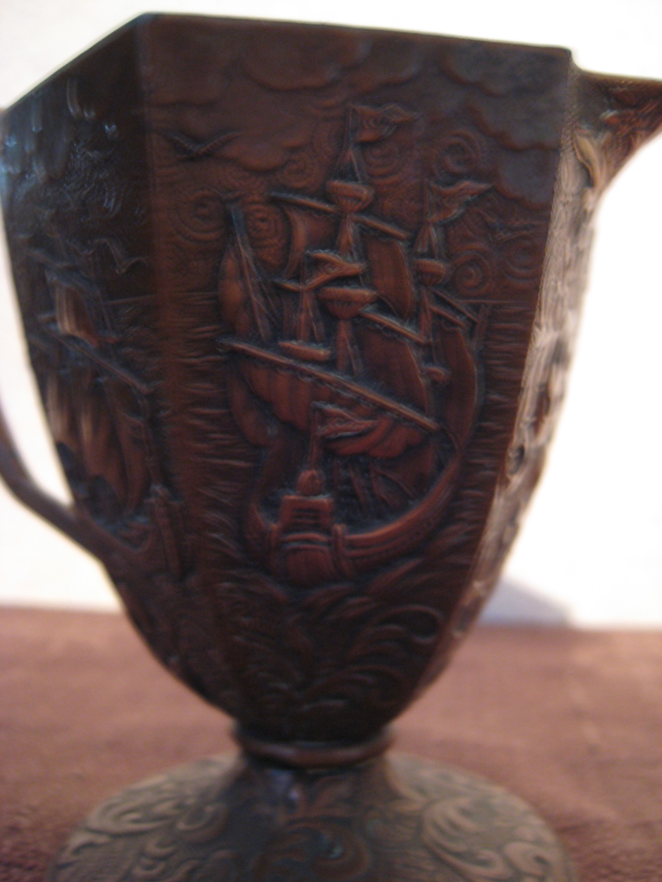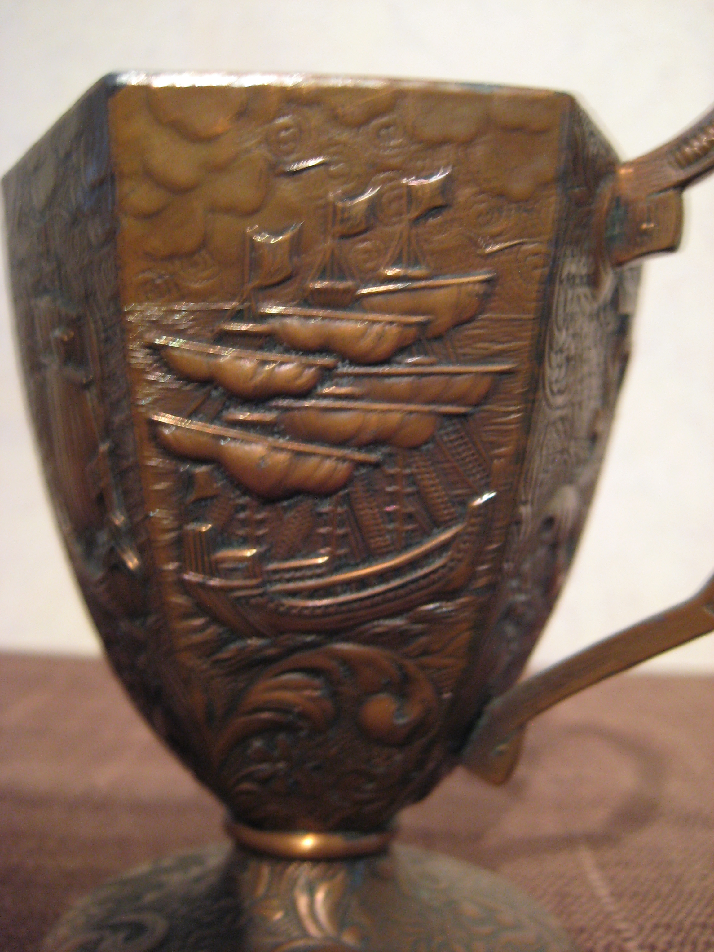 small pitcher, creamer? It has 6 sides each with a different design 4 with ships, 2 with waves. Looks like copper over heavier metal. I got it from my grandpa but I don't know anything about it.