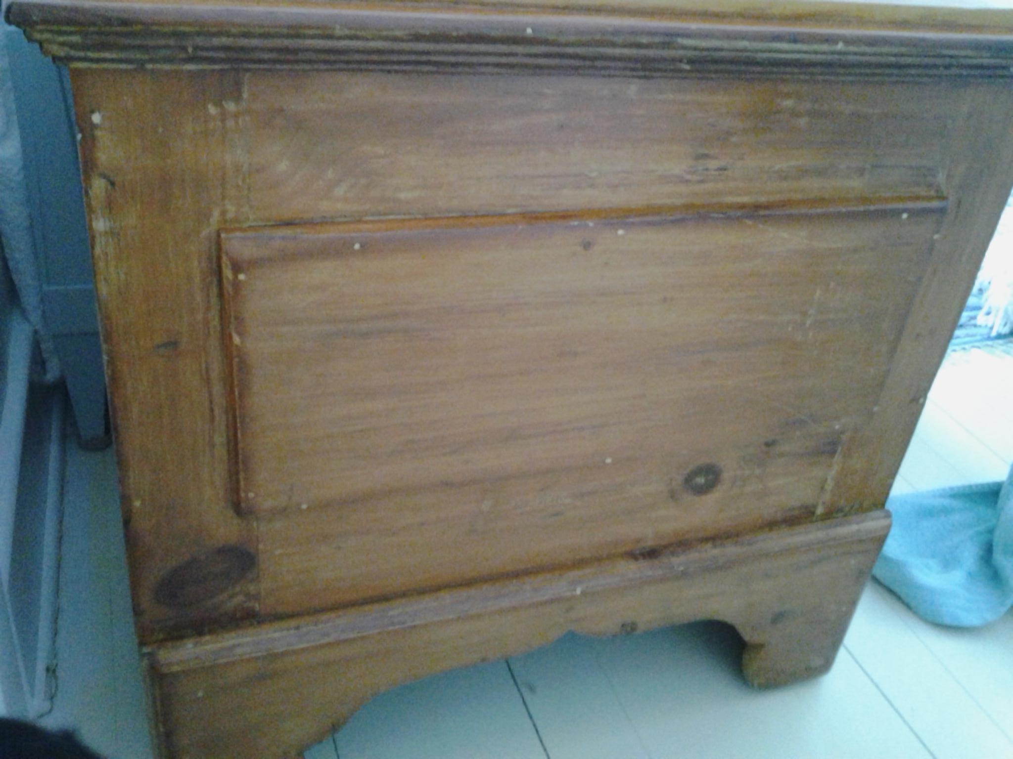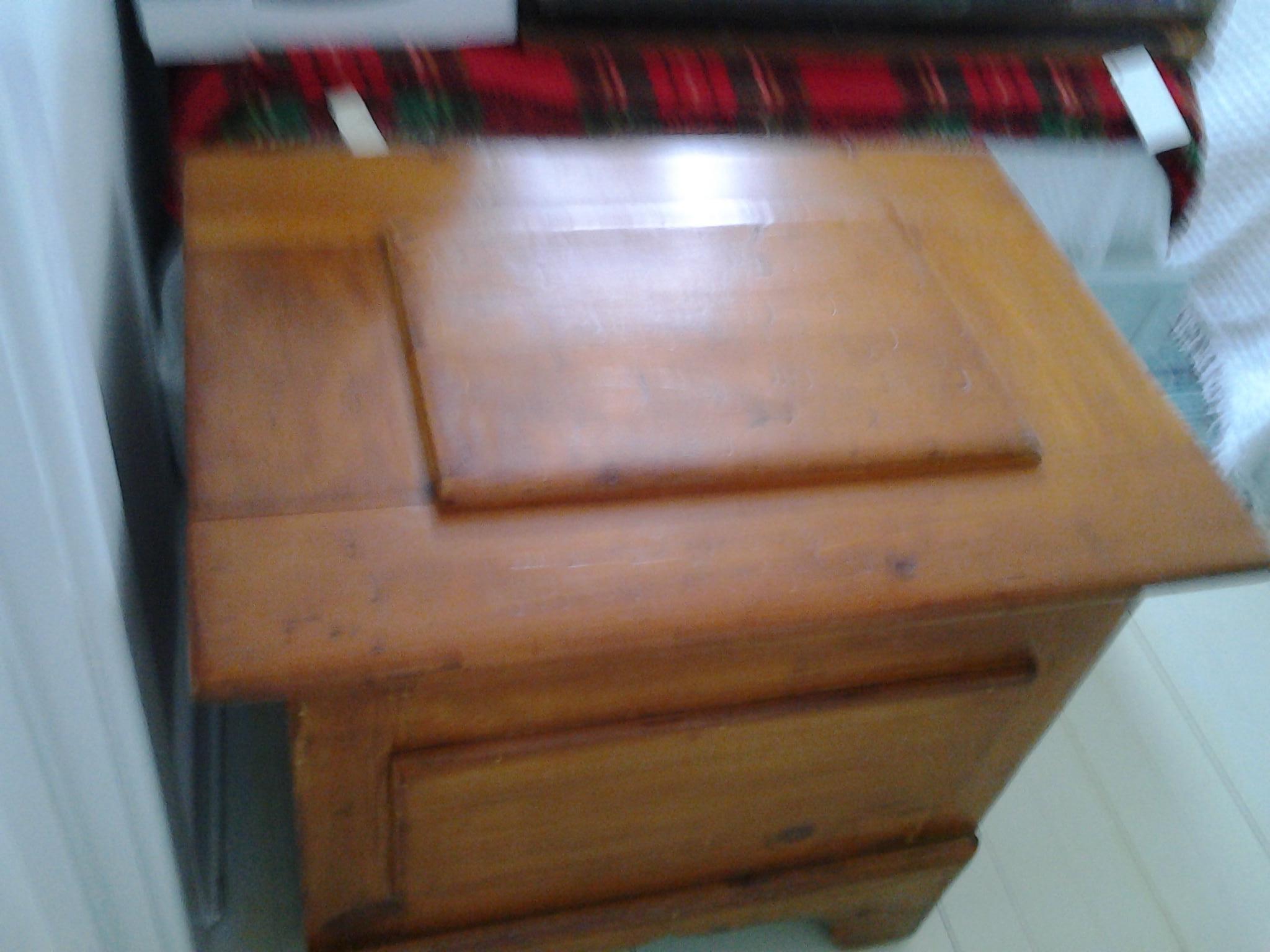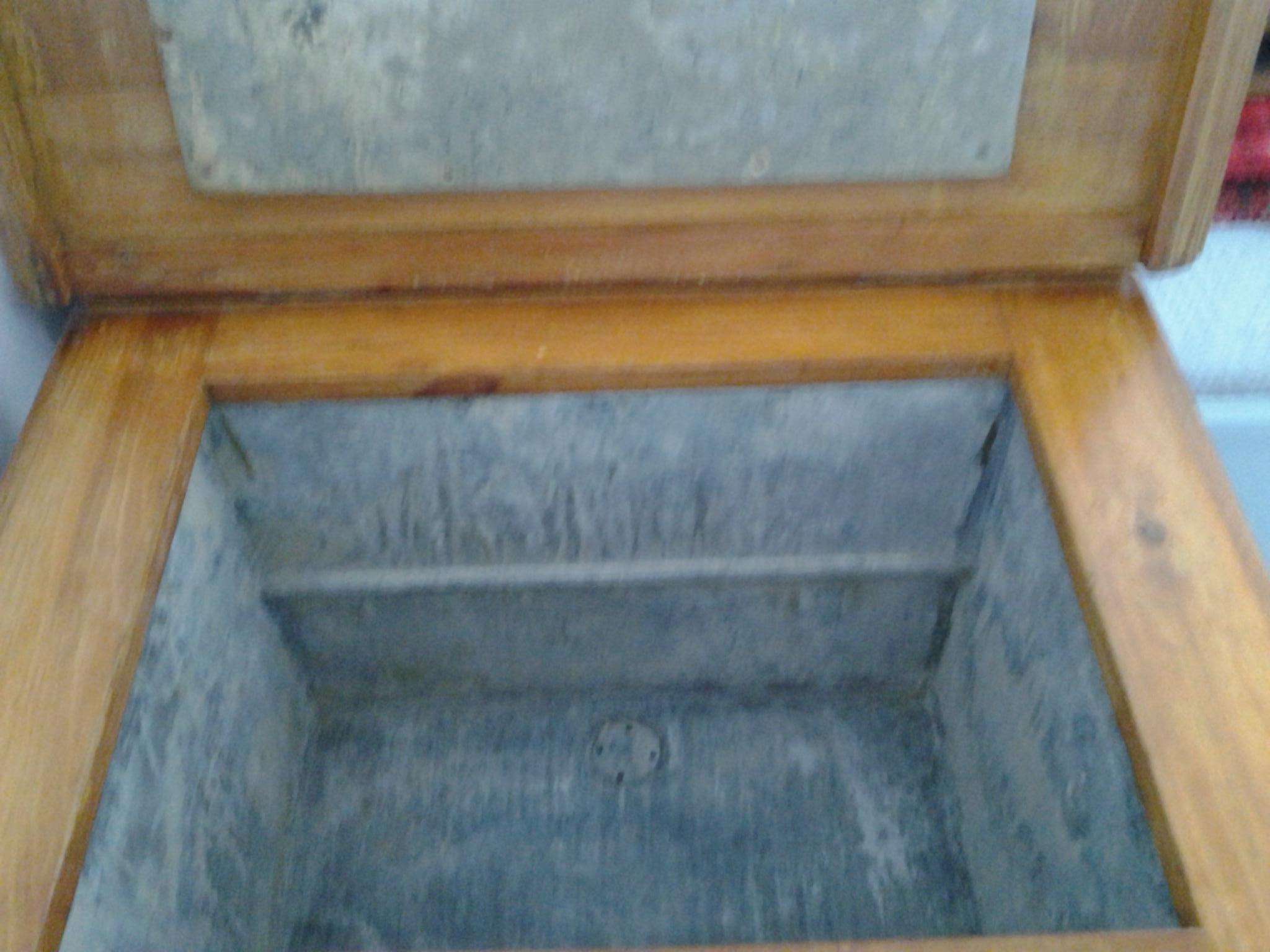 This small ice box measures approx 26" in height x 27"wide x 20" deep on the outside.  The inside tin box which appears to be original measures 18"x13".  There is a drain in the tin box that goes through the bottom of the box.  It has also been refinished at some point since there is evidence of gray paint still on the bottom of the piece.