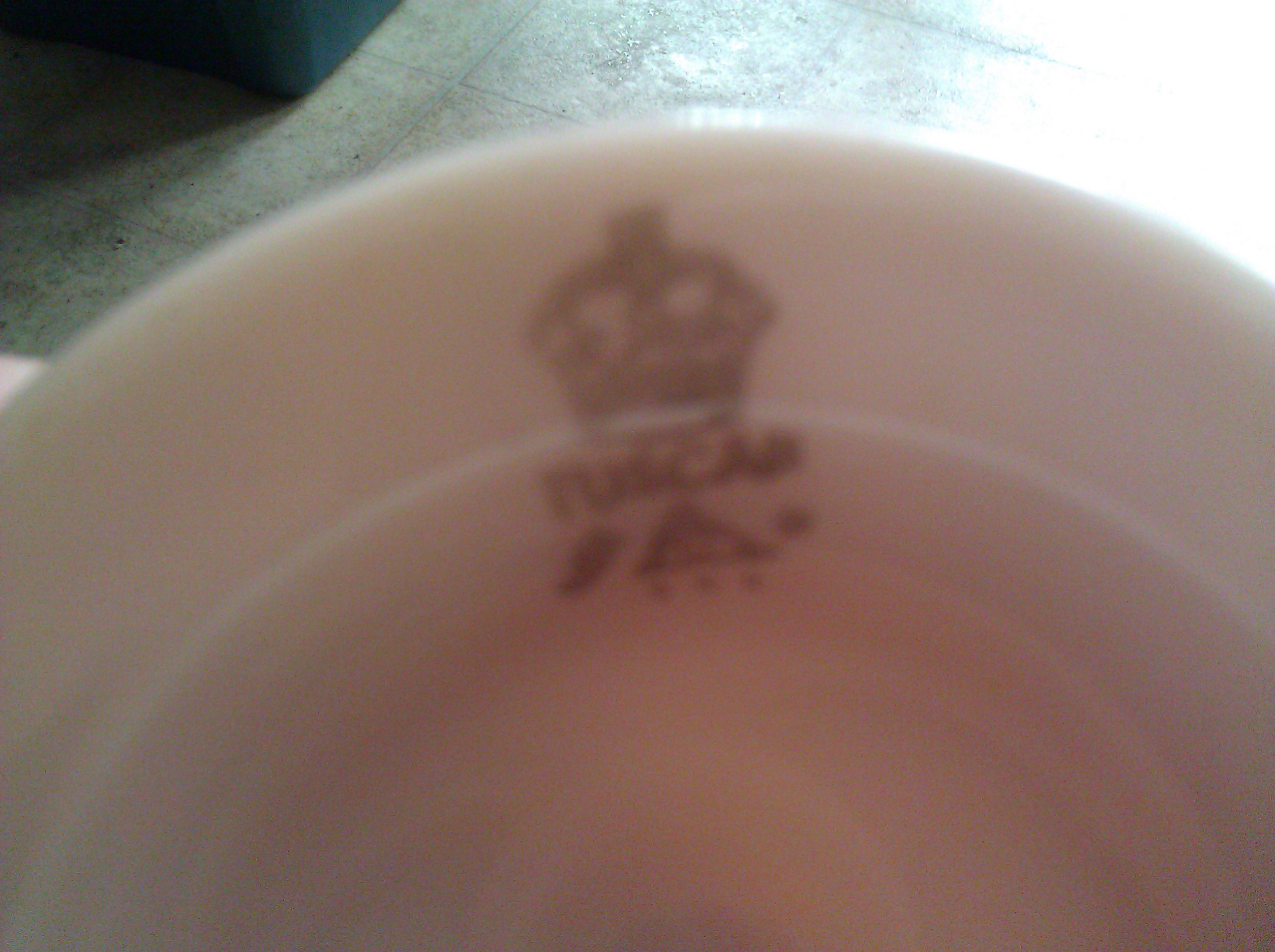 its pink and has gold trim and gold flowers etched into it all over and it has tuscan stamped on the bottom with a crown stamped under the name