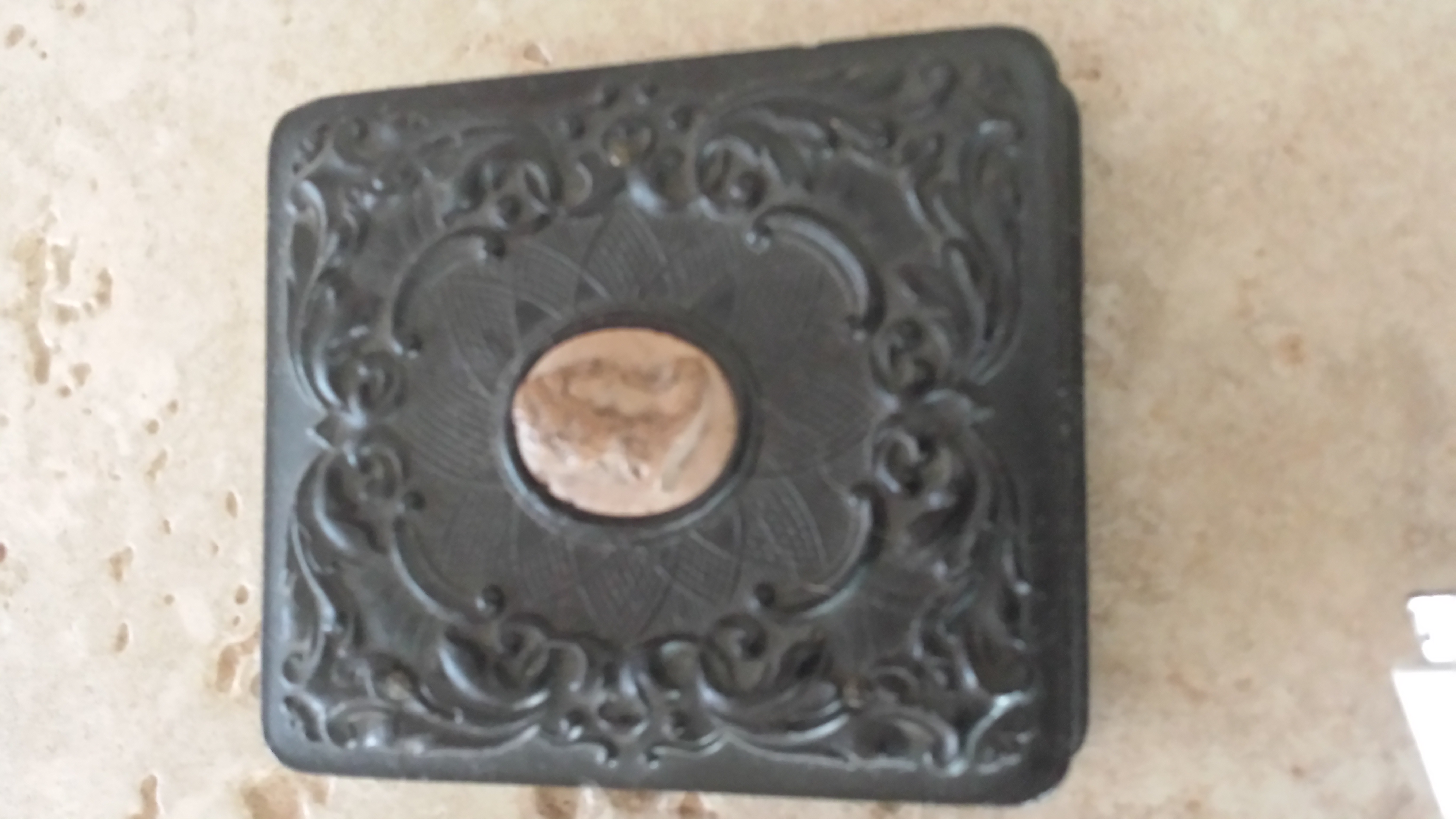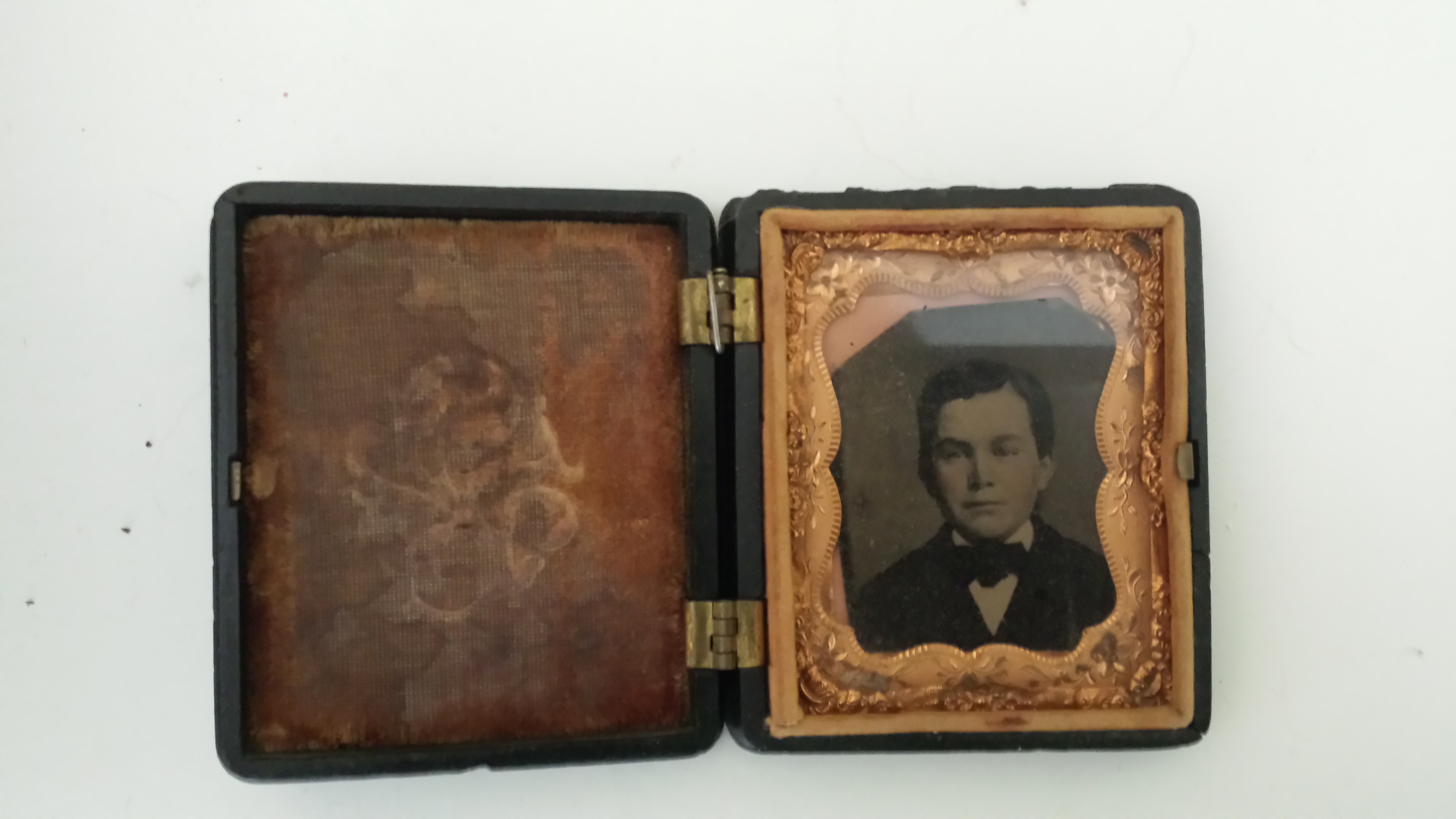 Description Wooden tintype portrait box with cameo on the front panel.