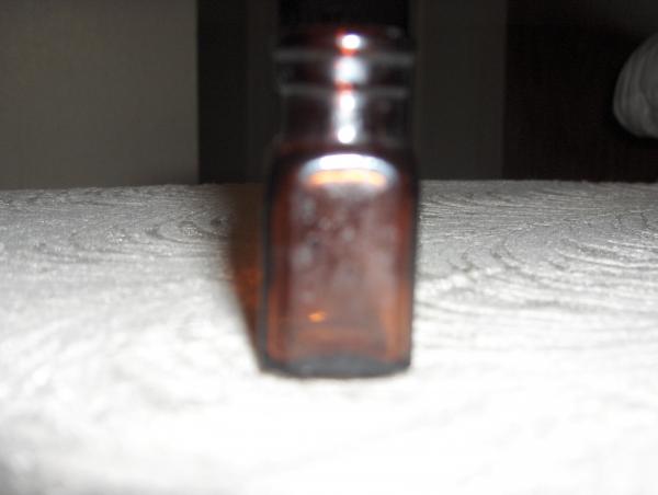 Small square brown glass bottle, there is a symbol on the bottom of the bottle,