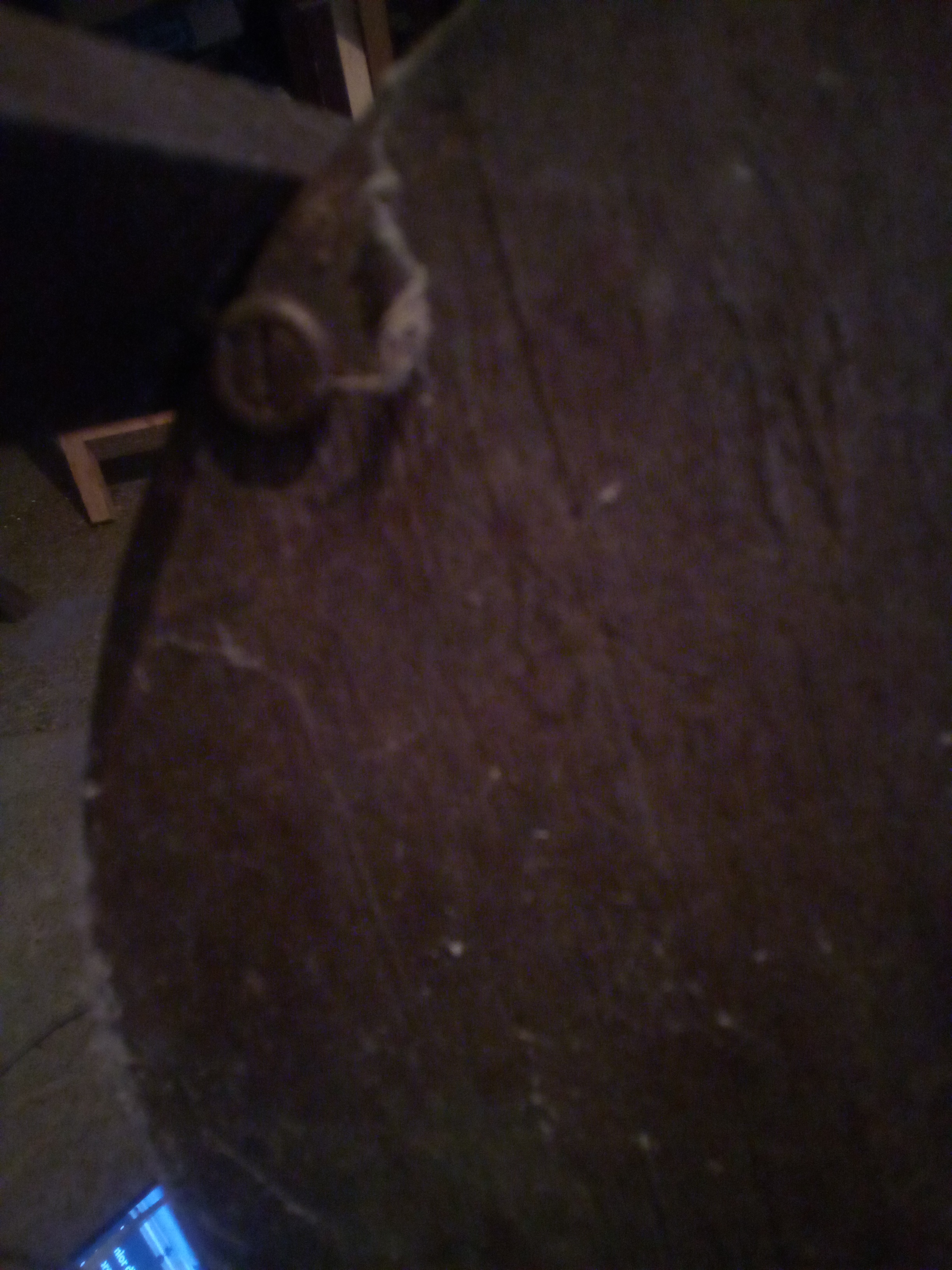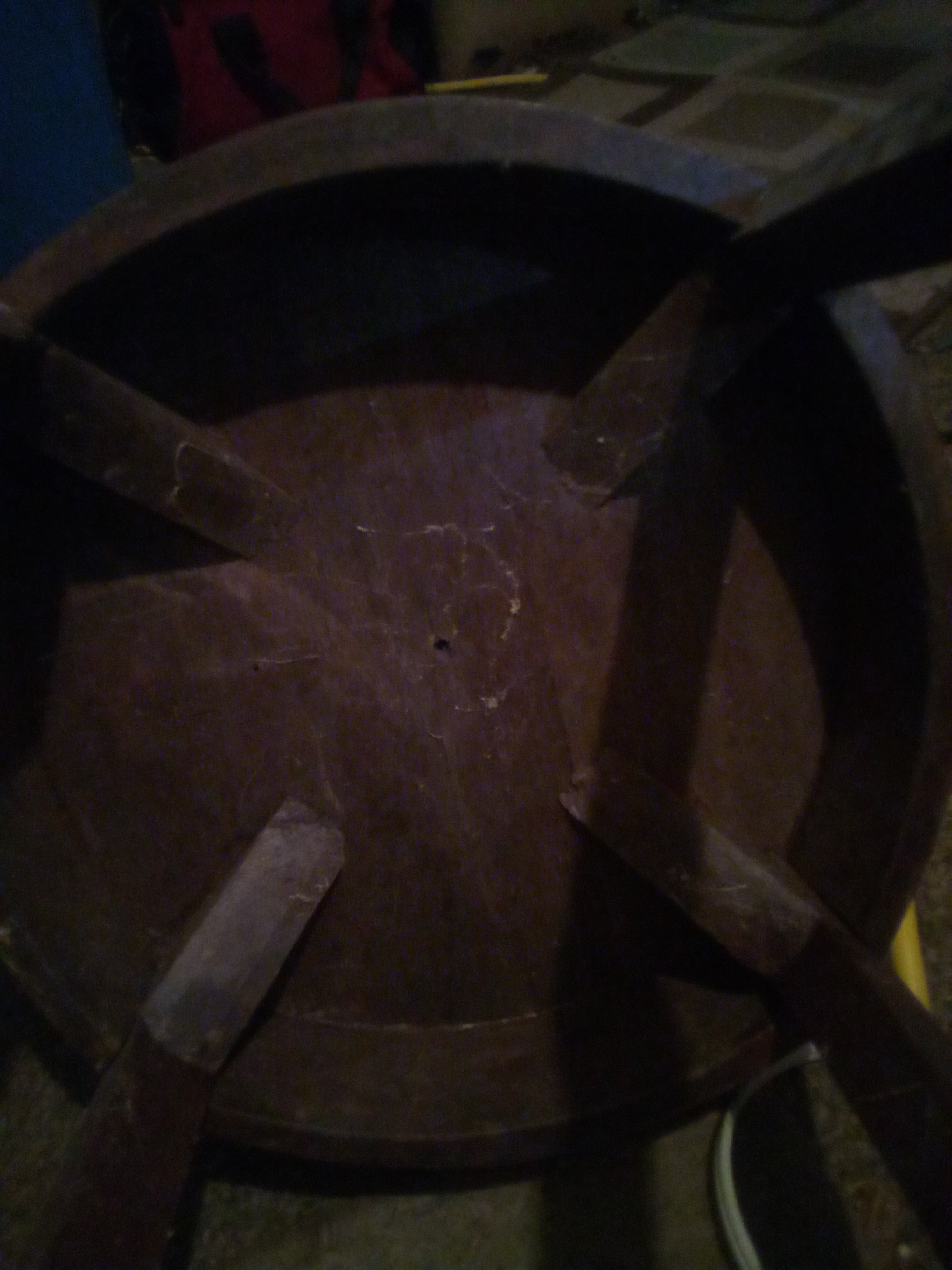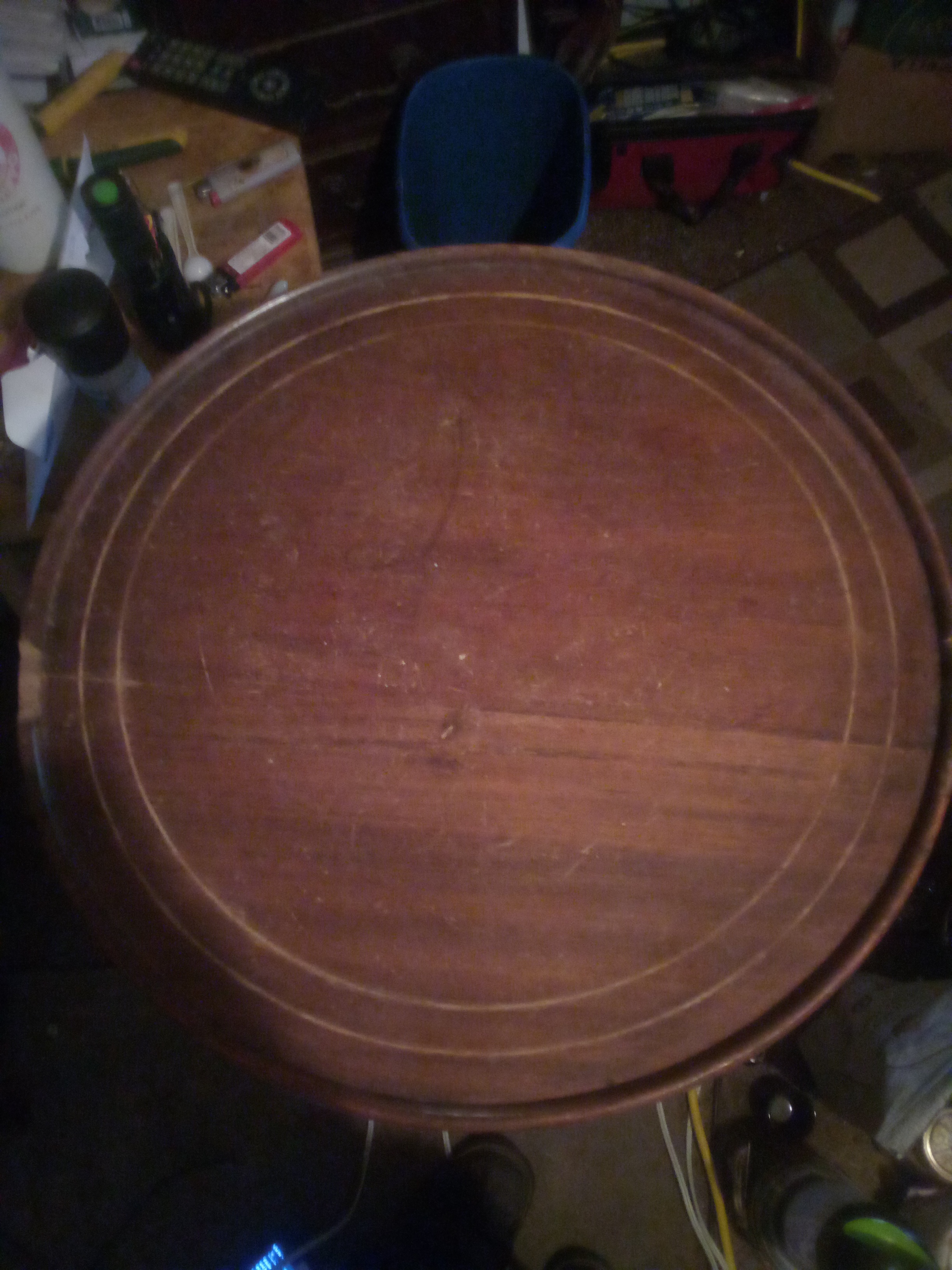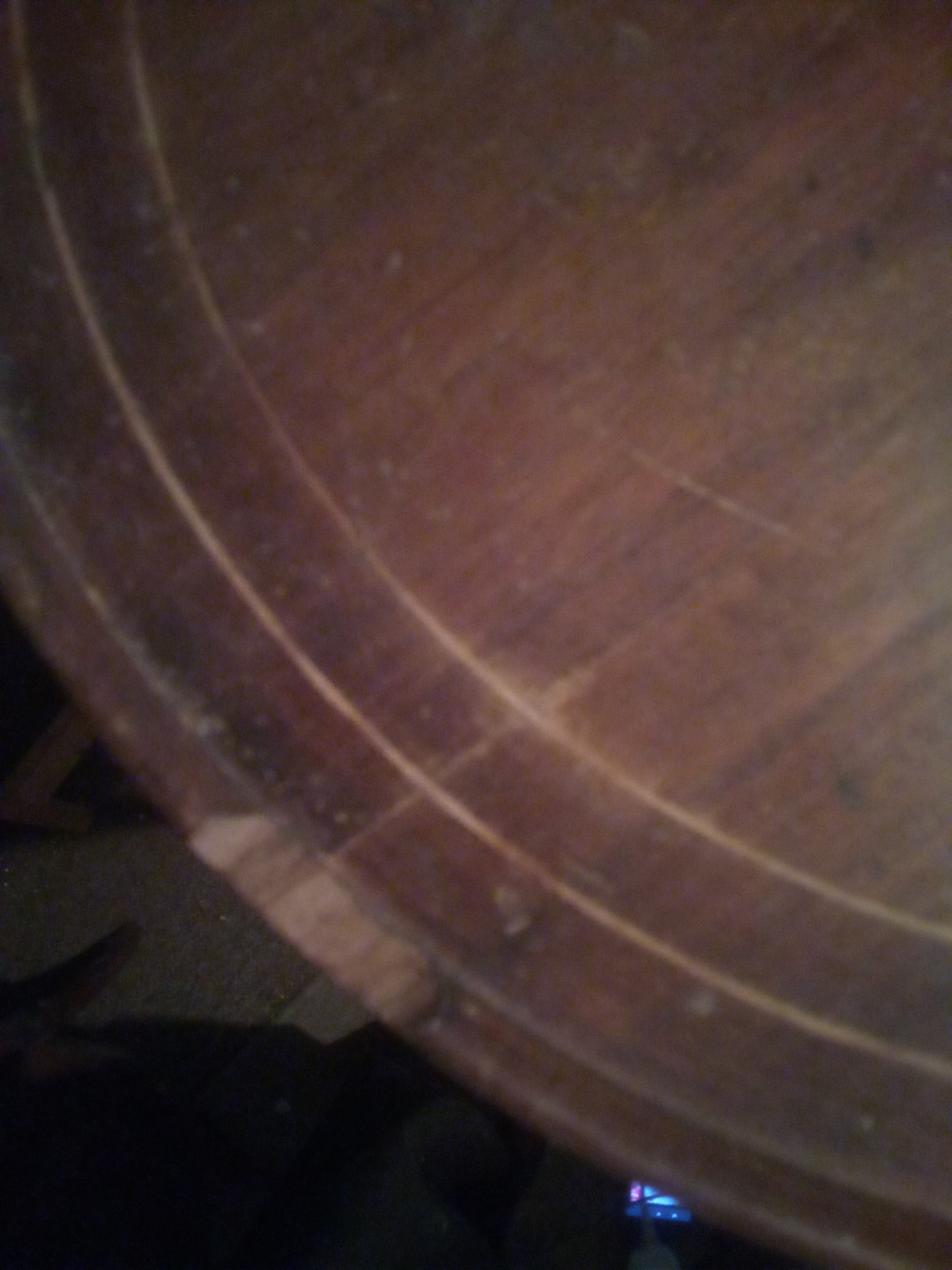 The Table has a 1" Diameter Chip in the top edge and then the start of a small crack. Also in the top 2 Circles Inlaid of a different wood. It has edges around both Platforms.