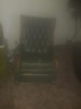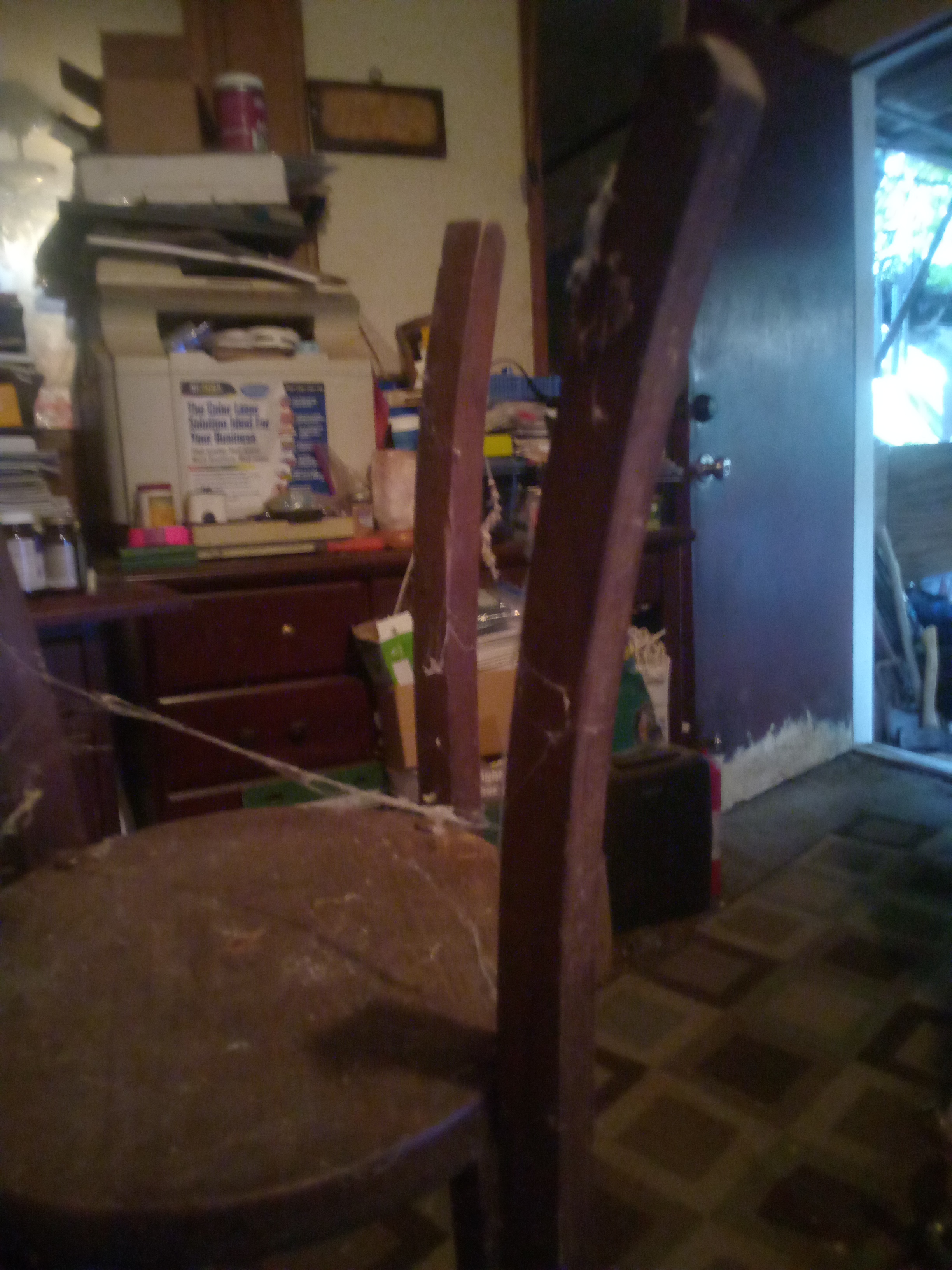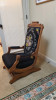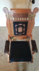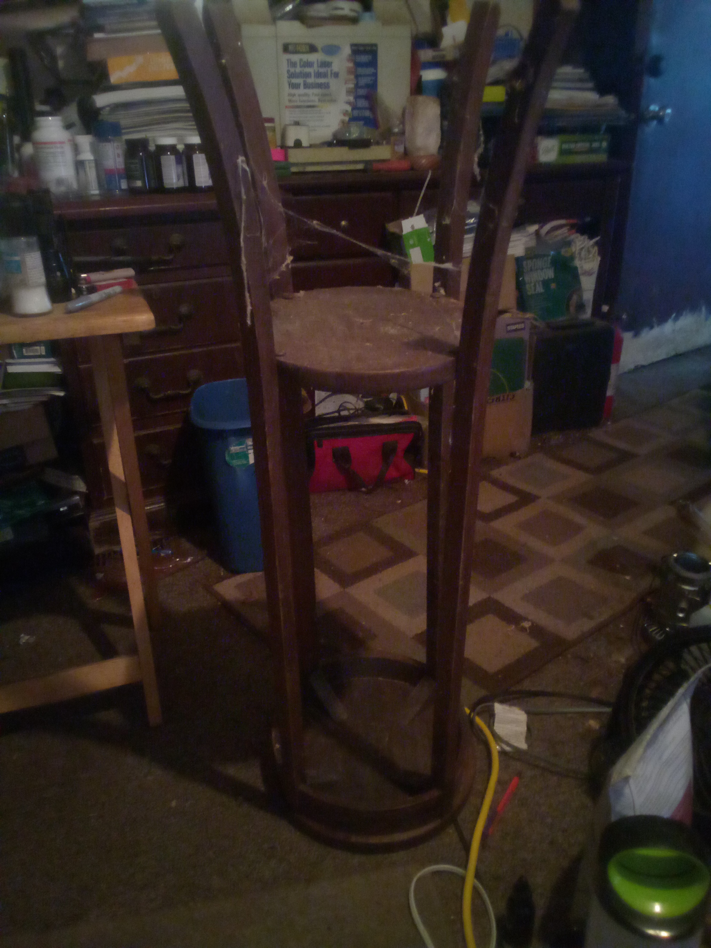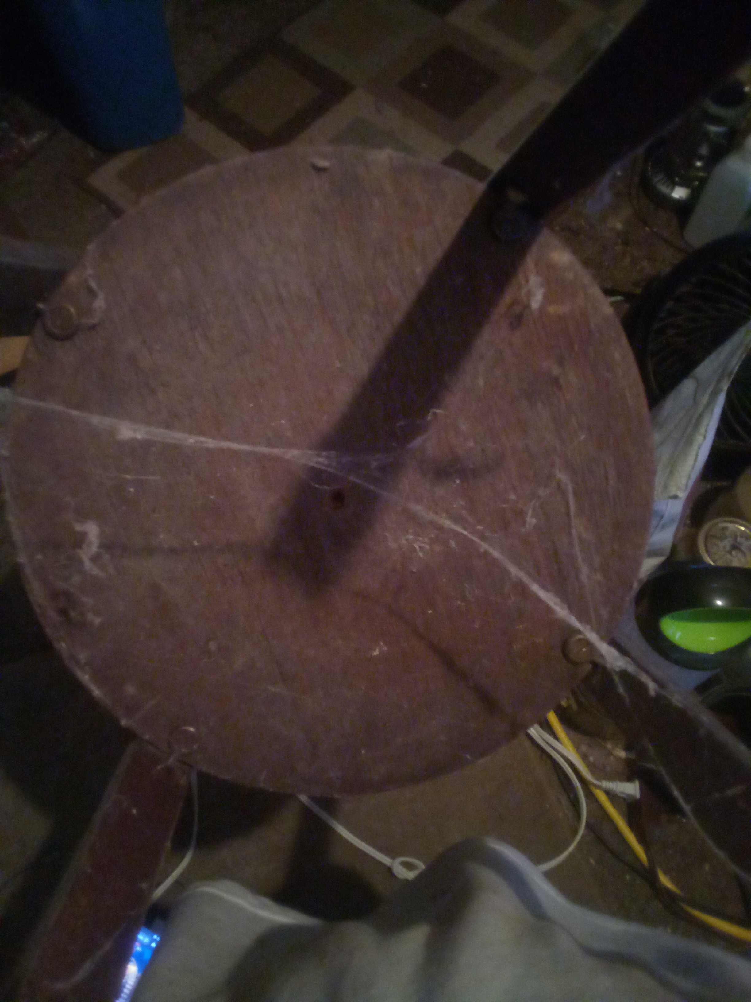 The Table has a 1" Diameter Chip in the top edge and then the start of a small crack. Also in the top 2 Circles Inlaid of a different wood. It has edges around both Platforms.