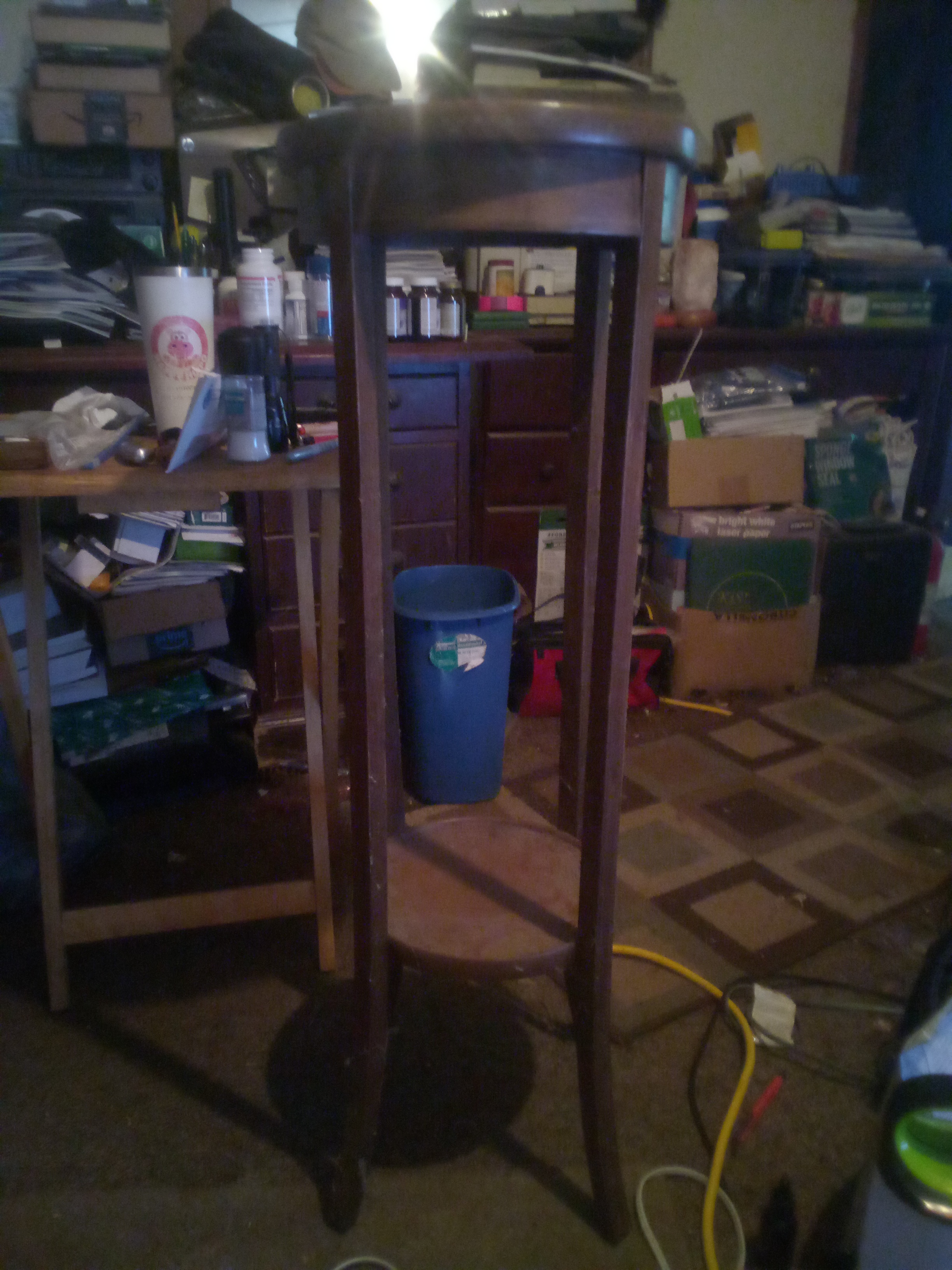 Physical Description: This small two-platform table features a unique design with two circular platforms, each measuring 8 inches in diameter. The table stands approximately 3 feet tall. It is constructed from two different types of wood, which adds visual interest. The top edge of the table has a 1-inch diameter chip, and there is a small crack beginning to form. Notably, the table includes two circles inlaid with a different wood on the top surface, enhancing its aesthetic appeal.