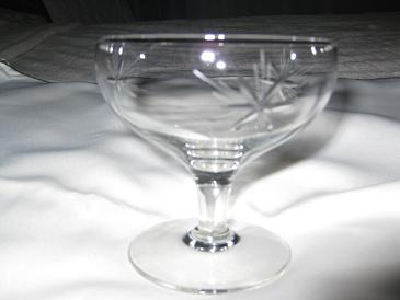 water glasses and sherbet cups are plain except for 3 stars etched or hand done. we were told they were done by hand because they are deeper than the etched items 7 water and 6 sherbet cups