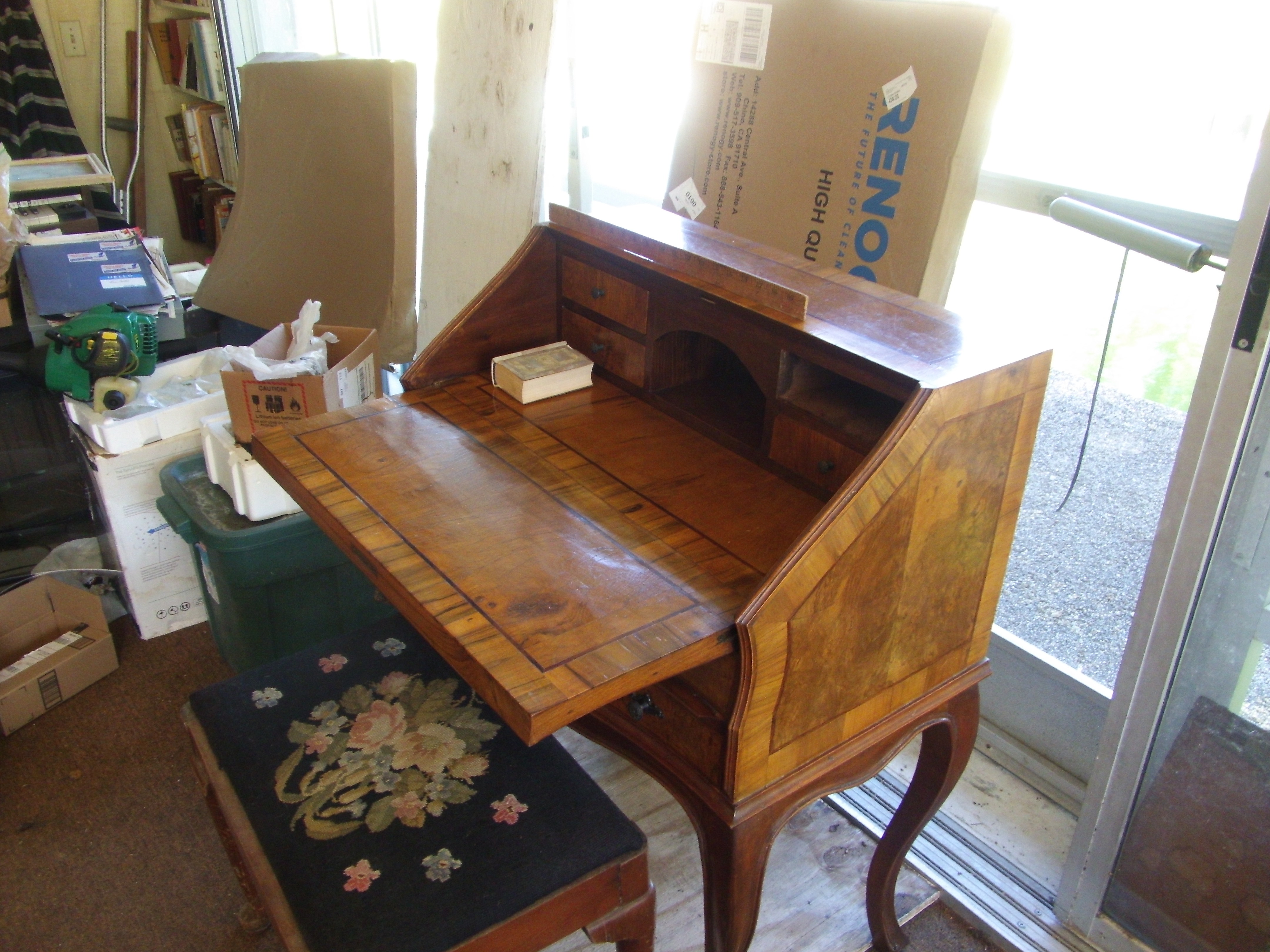 Thanks for looking, this is a very nice desk with some interesting woodwork and swirly grained wood inlays. The previous owner is a Hungarian lady, no other history available.