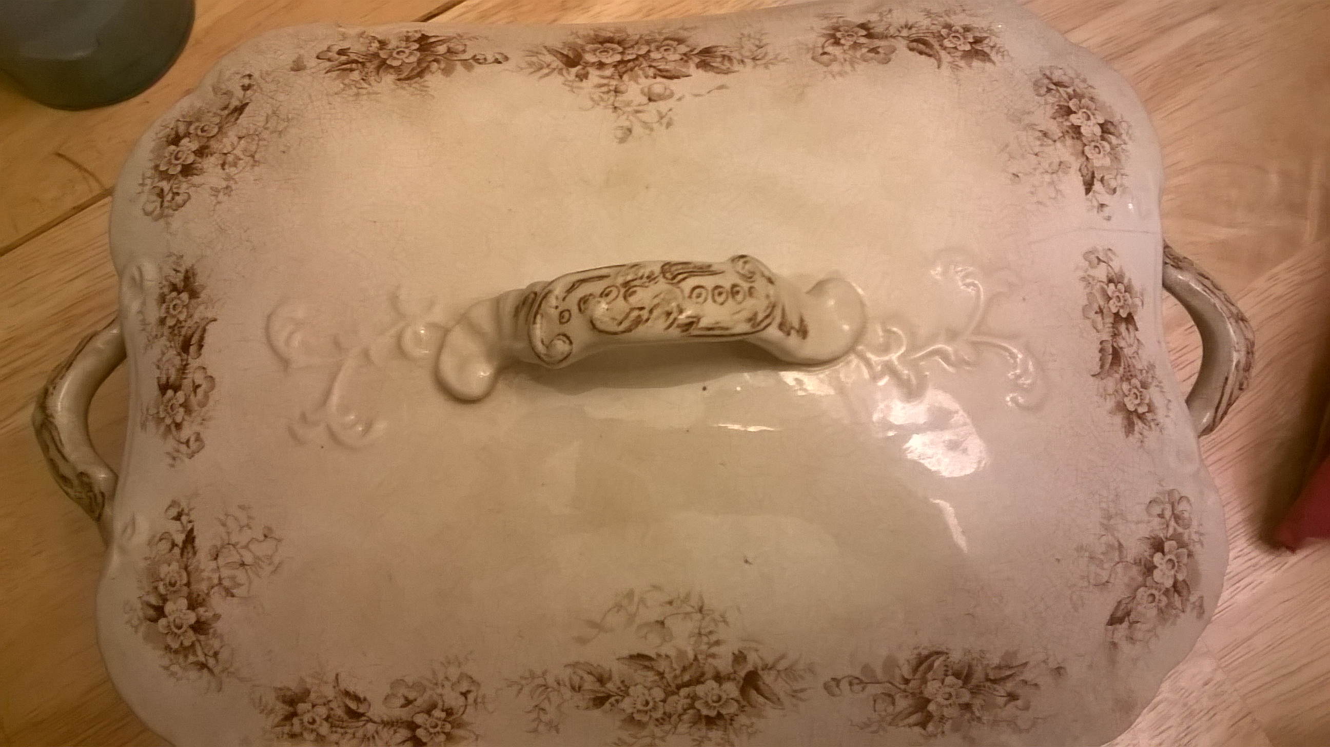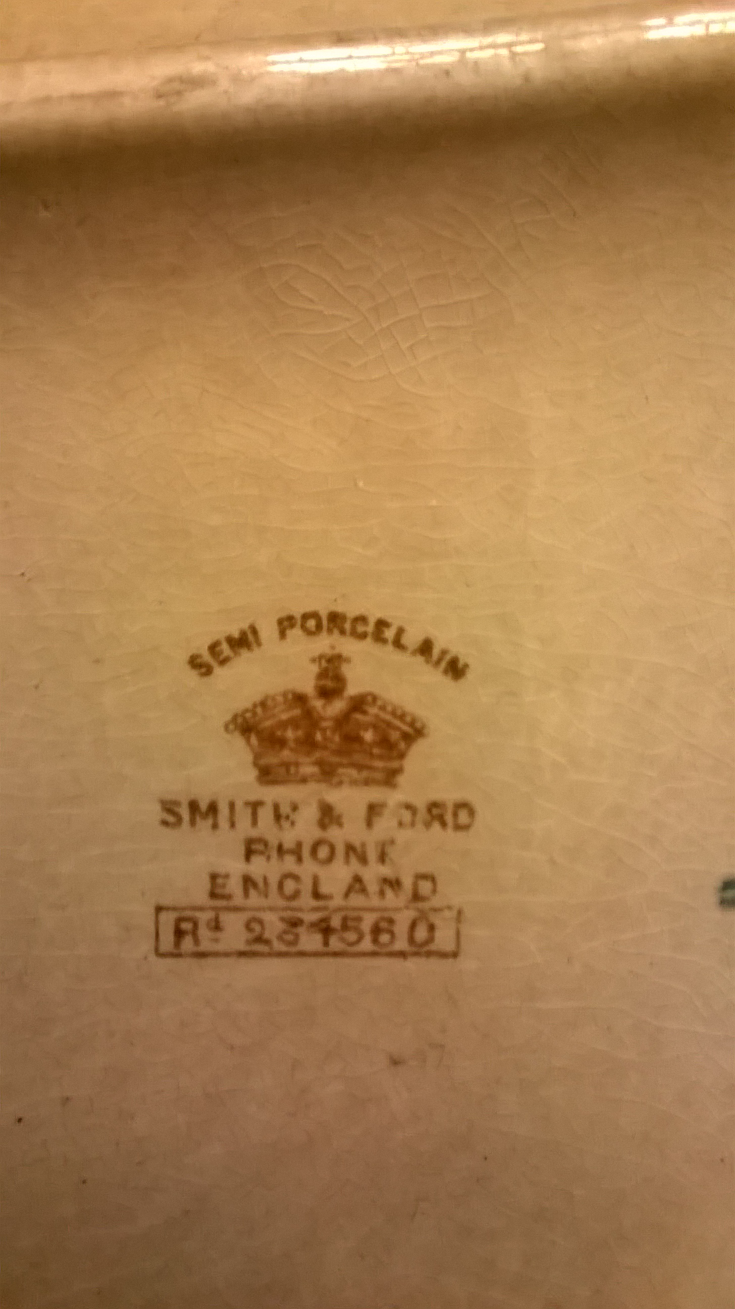 Semi porcelain serving dish. Cream colored, with flowers on lid, sides and handles. Smith and Ford Rhone England. R234560 on bottom.