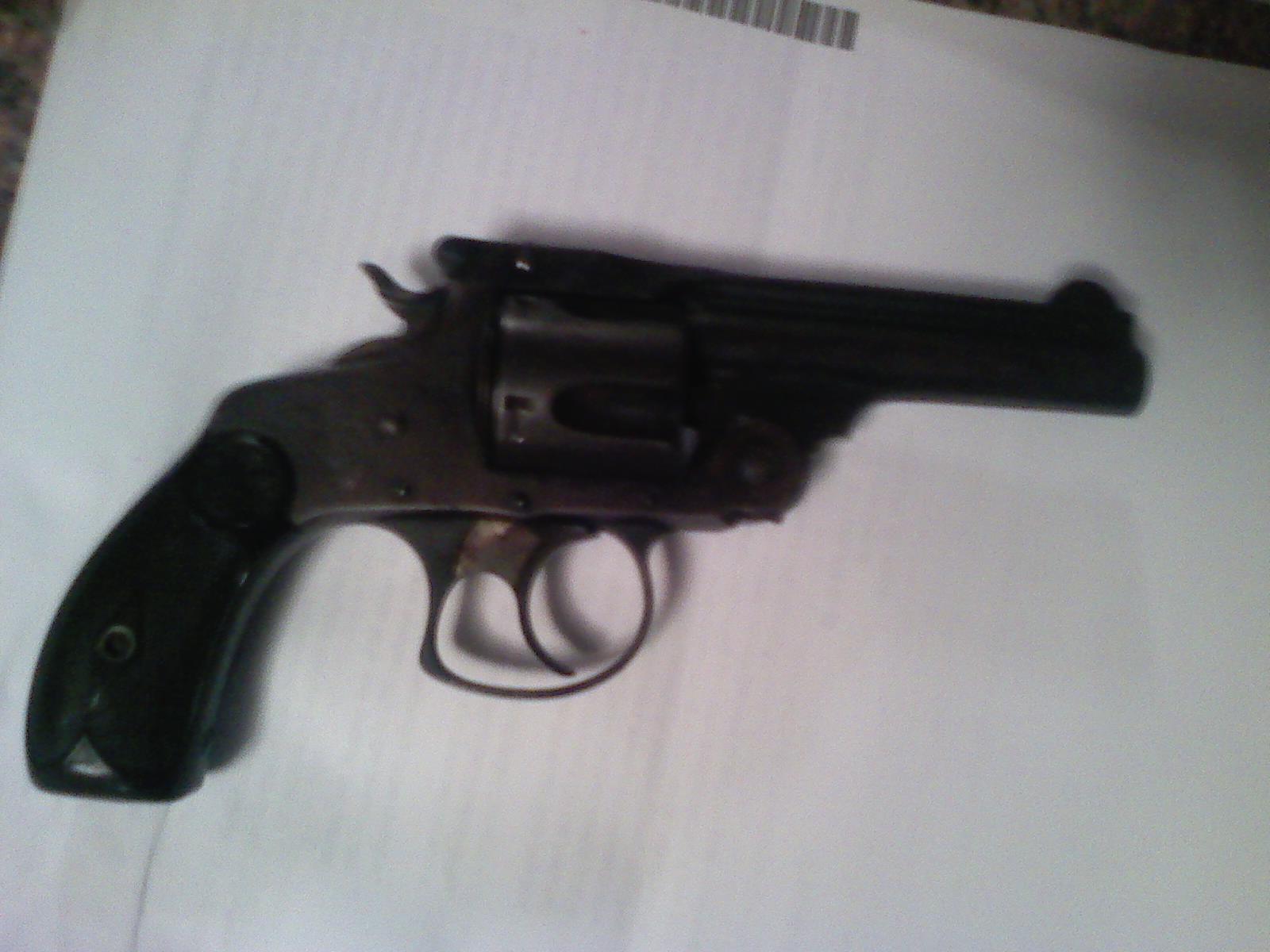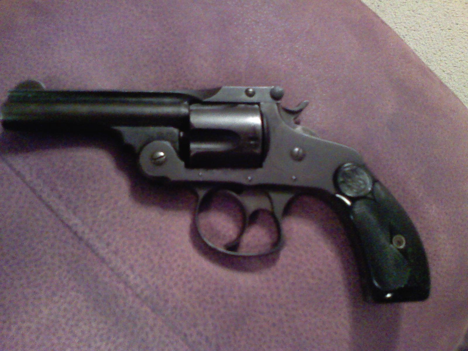 This gun has some surface rust on the outside and on the inside of the barrell. The rifling is still good and the mechanics of the gun are still tight. The handle is made of what looks like black plastic and it is in excellent condition. Across the top of the barrell, are the words Smith and Wesson, Springfield, Mass. and then patent dates of May 11, 1880, Jan. 3, 1882, and April 21, 1889. The serial number is 430098.