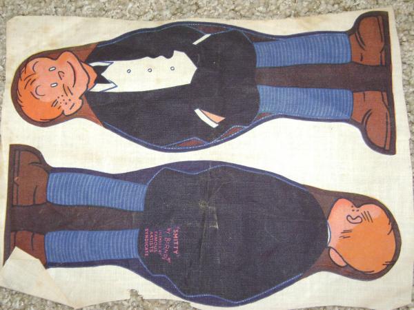 Fabric doll pattern front and backside image of comic strip character "Smitty". I don't know how to pronounce the maker. It says B Some symbol then RND! then followed by licensed by Famous Artists Syndicate. It is slightly yellowed around edges but the print is inexcellent shape.