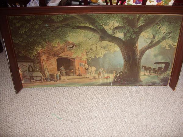 a picture of a black smith shop with horse an children standing out side with a big tree in front