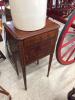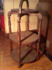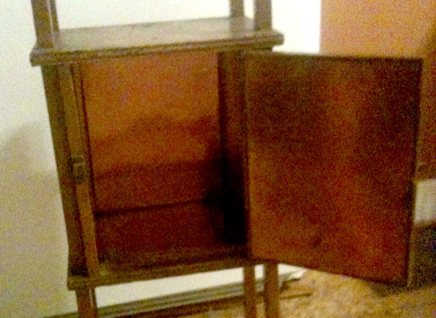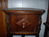 I believe this to be a smoking stand/tobacco table. The inside is lined with a copper looking metal. The piece is 31" tall x 12.5" wide x 9.5" deep. The wood has an interesting swirly pattern which is not very visible in the photo.