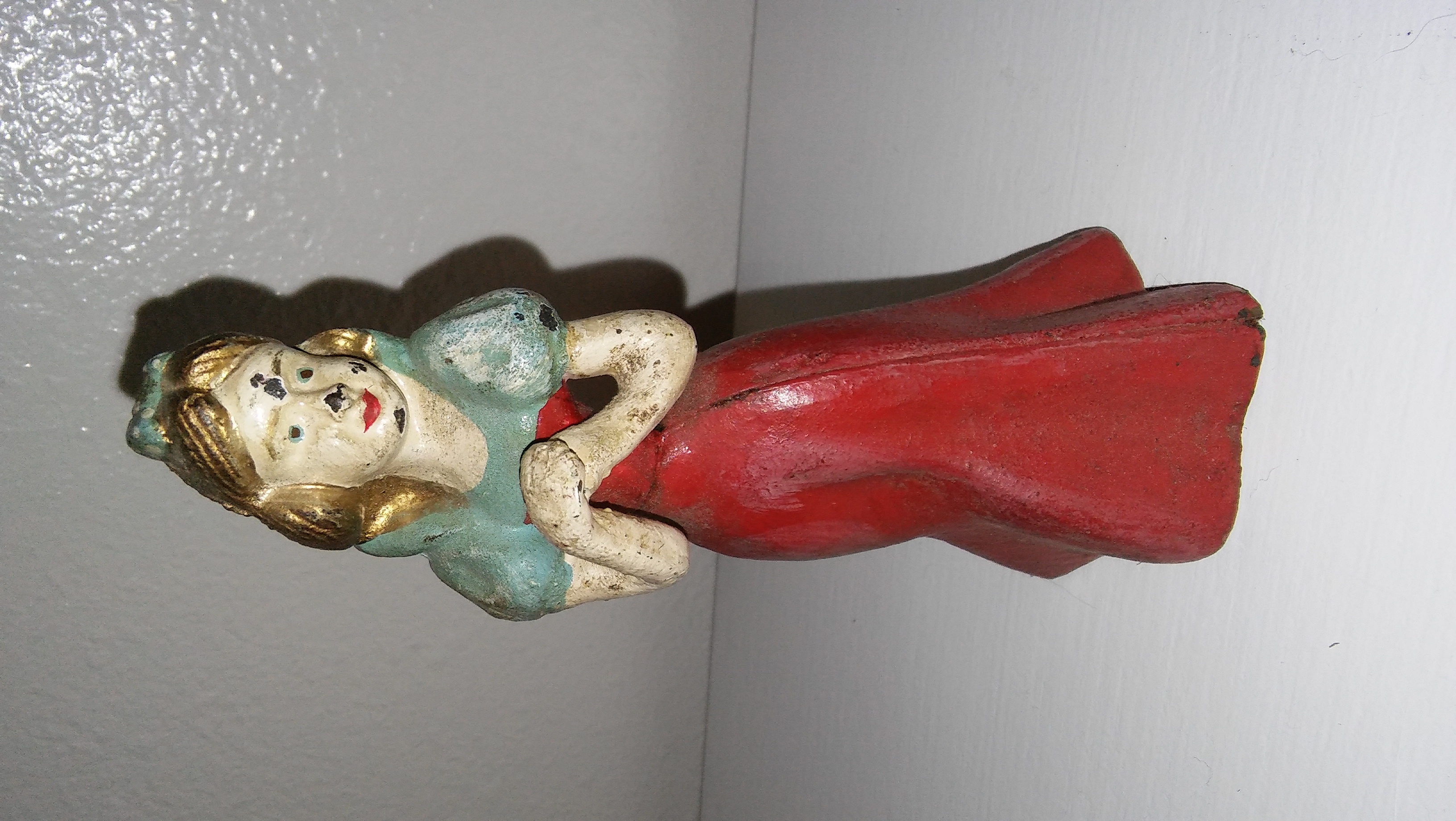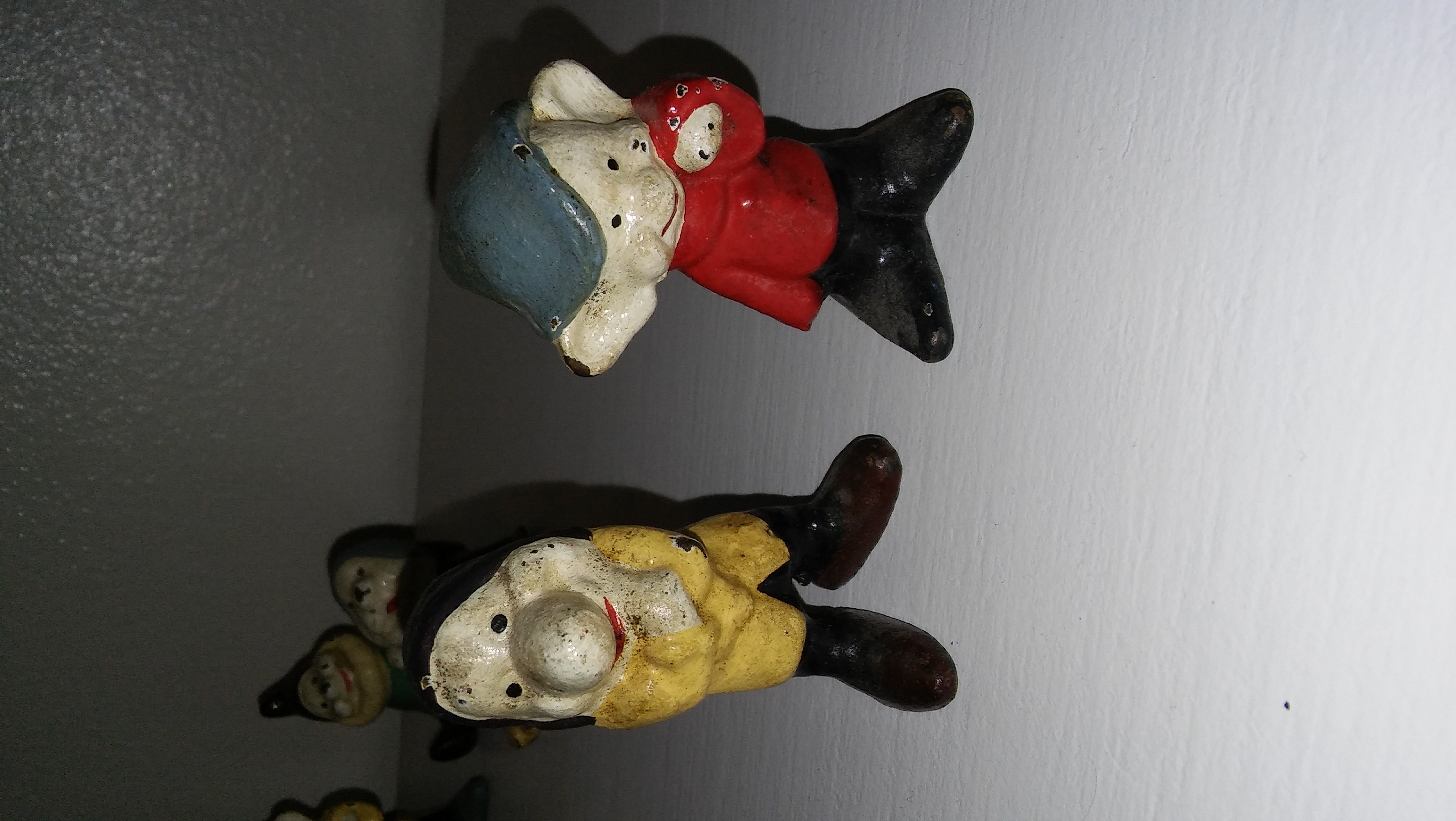 8pc cast iron set of snow white and seven dwarfs. Approximately 6in tall snow white. Gold painted hair. Hollow base dress. No repainting done. Small chips in paint on noses/extremities but complete set and good condition