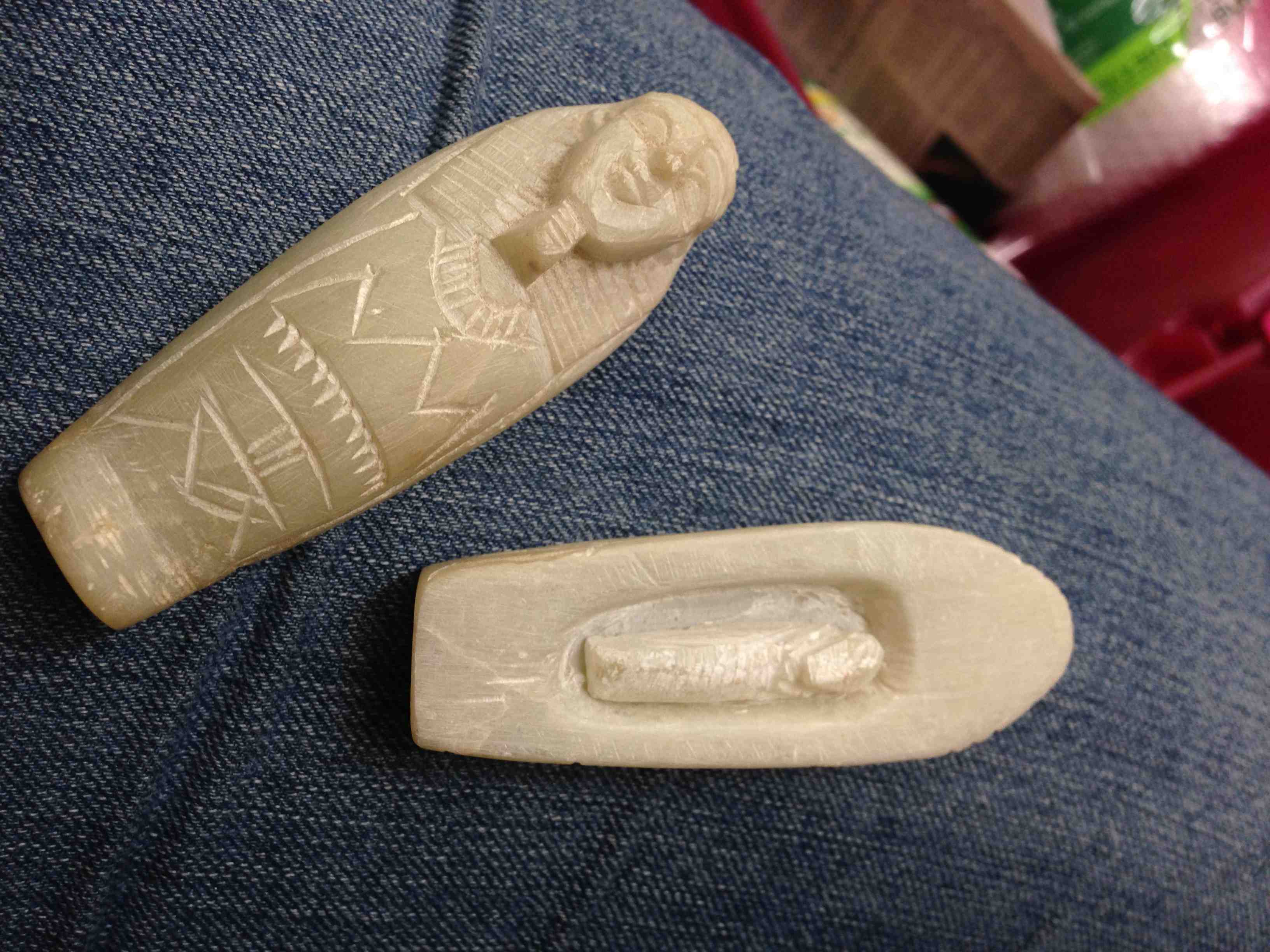 I have a Soapstone Sarcophagus, which comes apart to reveal a small soapstone mummy inside. It appears to be handcarved, and is in good condition with no chips or other markings. It is roughly 1 and 5/16 inches tall and 4 and 3/8 inches long. Only date I have is that it was create sometime before 1979 (it was found in a collection, wrapped in newspaper from that year).