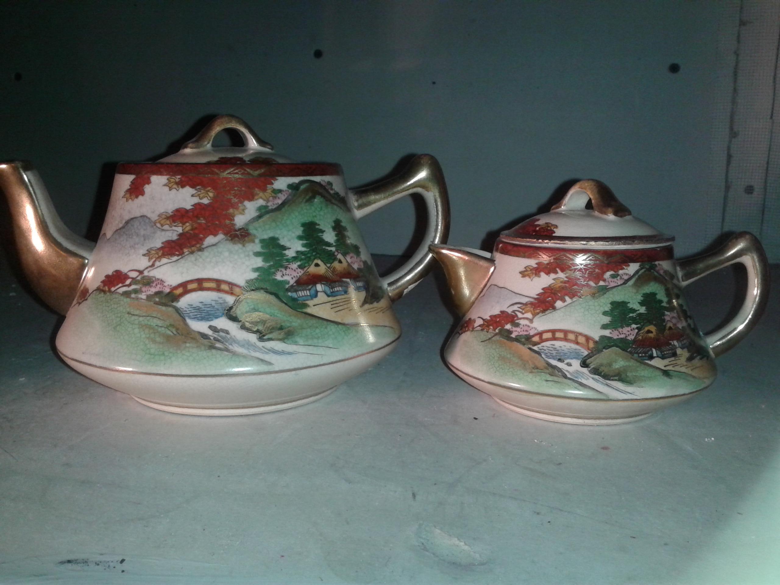 the teapot is 7 inches wide and 5 tall the smaller creamer is 5 wide 4 inches tall