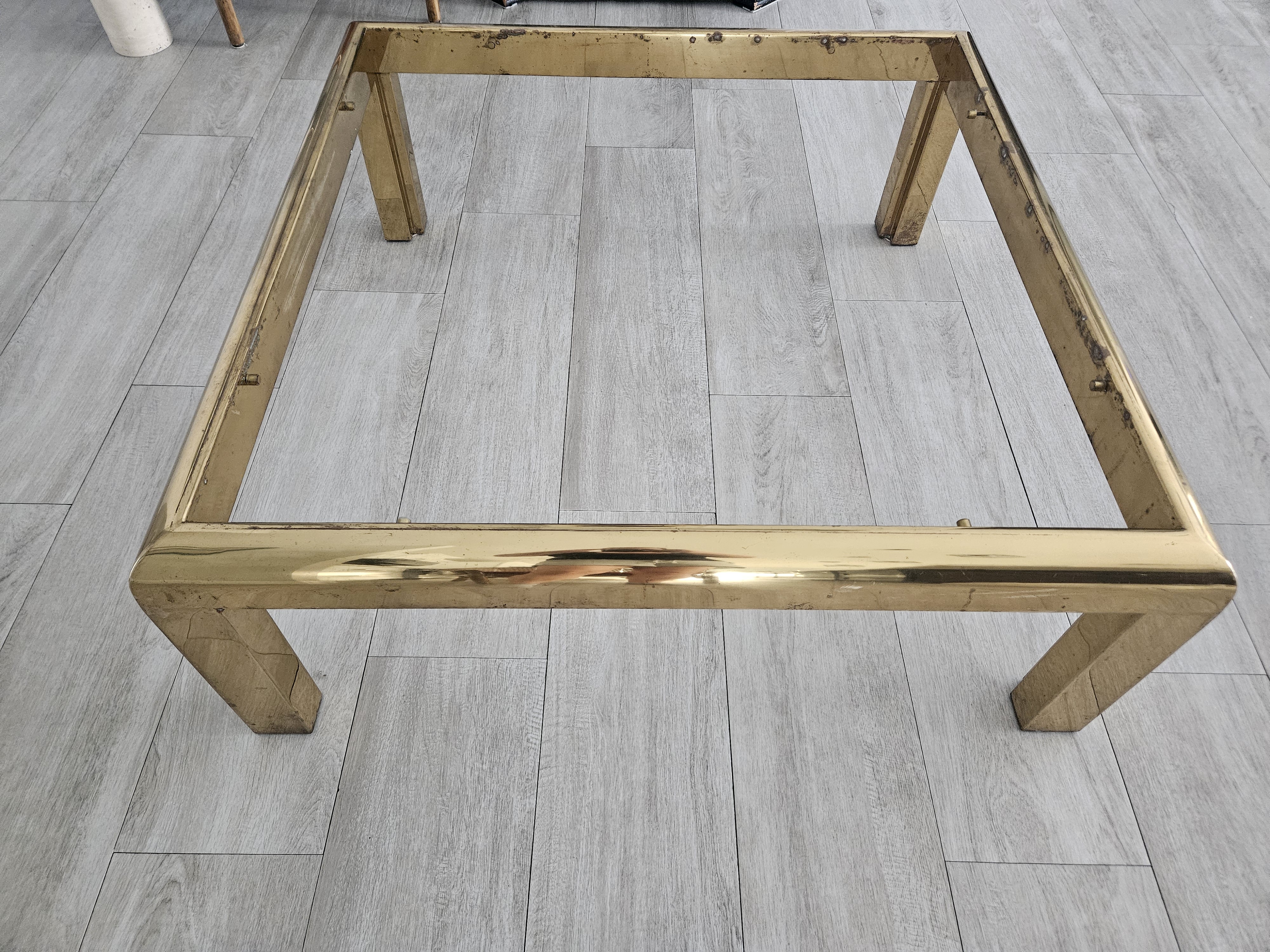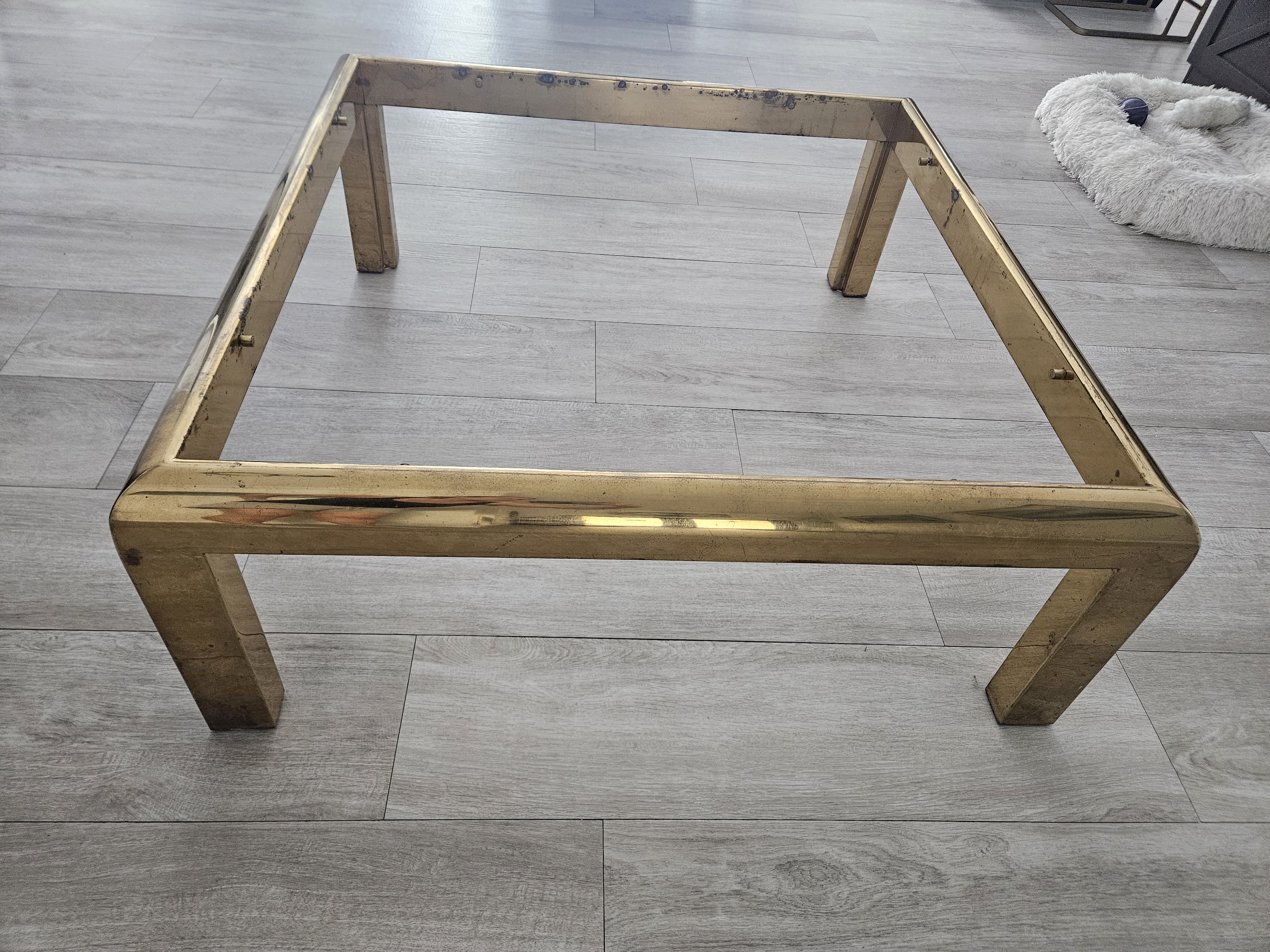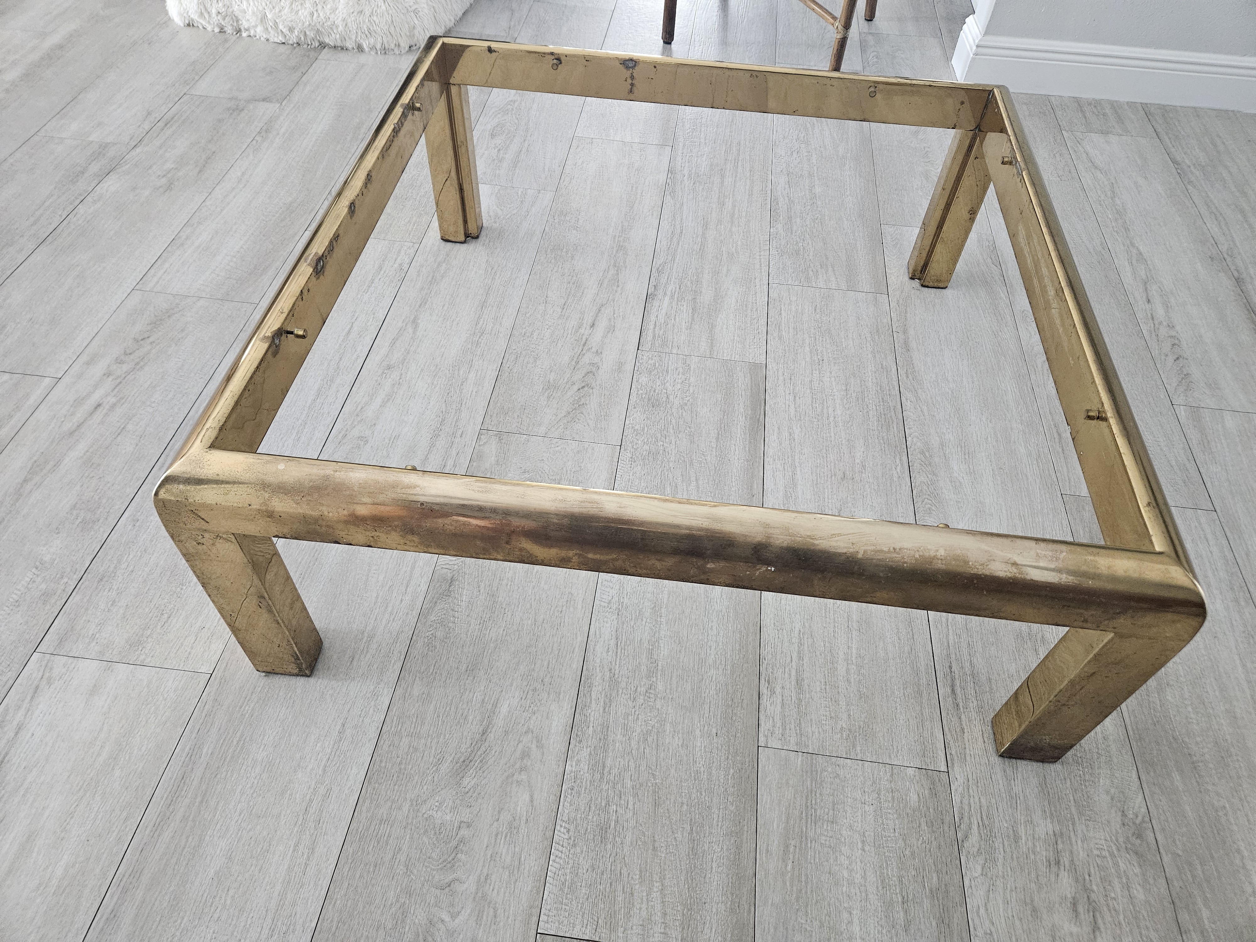 Solid Brass/Glass Luxury Coffee Table. Dating to c. 1968-2023. Materials: Brass, Glass. Estimated value: $100 – $250. Condition: Good. The market for mid-century modern furniture is currently stable, with moderate demand.