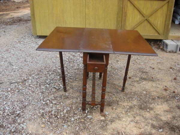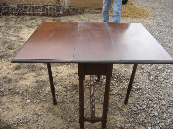table will fold to approx 15 inches wide. has 2 leafs held up by hidden legs, also has drawer in front for storing placemate or silverware