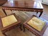 This beautiful antique solid oak wood bar set comes with 3 matching swivel bar stools. The bar has shelf storage in the back and detail lion carvings on the front with a copper finish on top. In very good condition for its age and the oak wood is great quality. The bar measures about 60" L x 38" H x 22" D.This bar is eye catching but not overwhelmingly large and is great for entertaining. The 3 bar stools are in good condition but the seats may need a little repair.