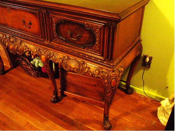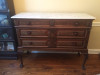 Made entirely of solid oak including the veneer. 3 smaller drawers across the top, 1 large drawer in the center spanning the length of the buffet, 3 cupboards below - centre cupboard opens up to 3 drawers. Mirror piece sits on the top back. A few water stains on the surface. Any ideas as to how much I could sell it for?