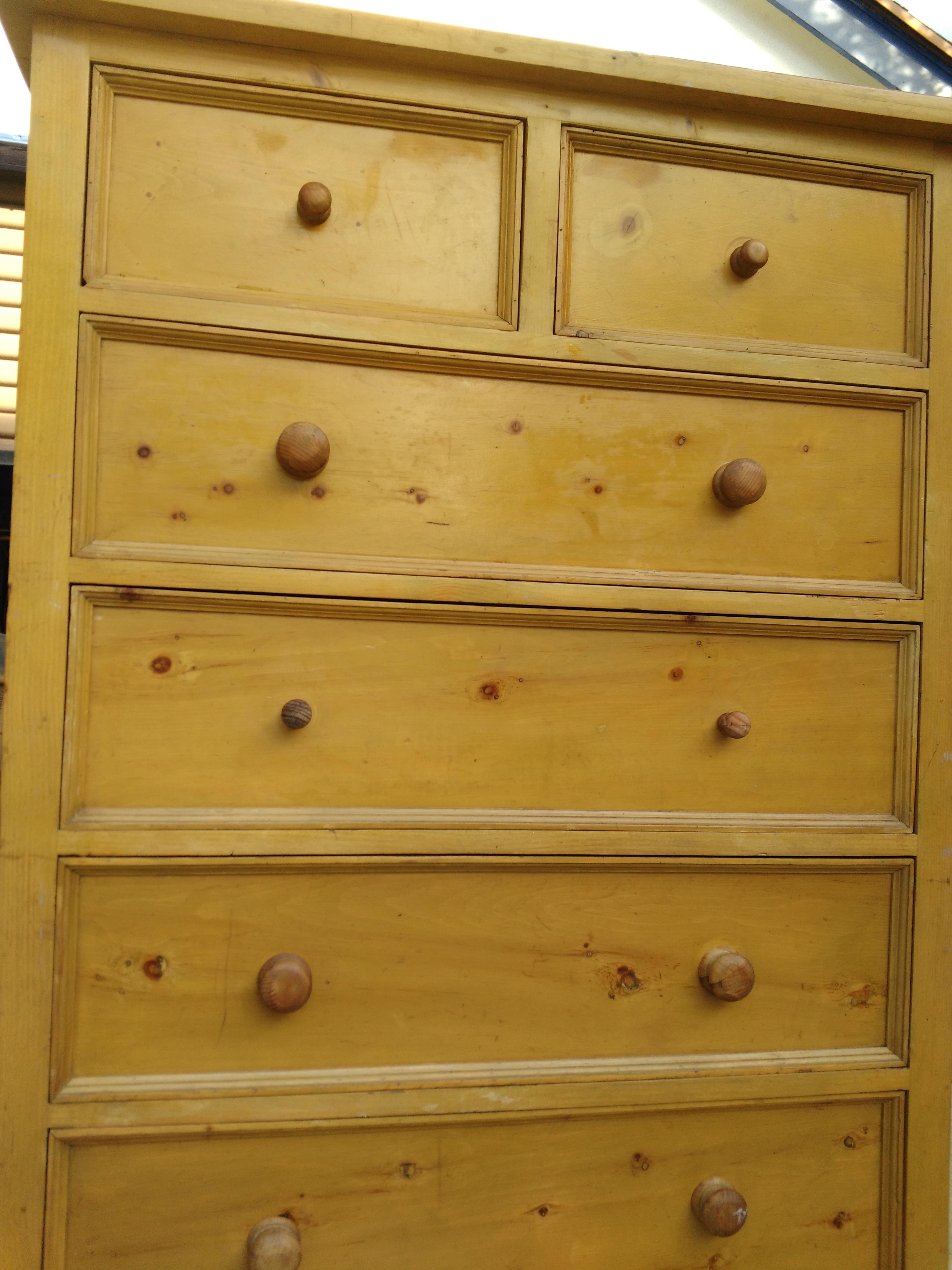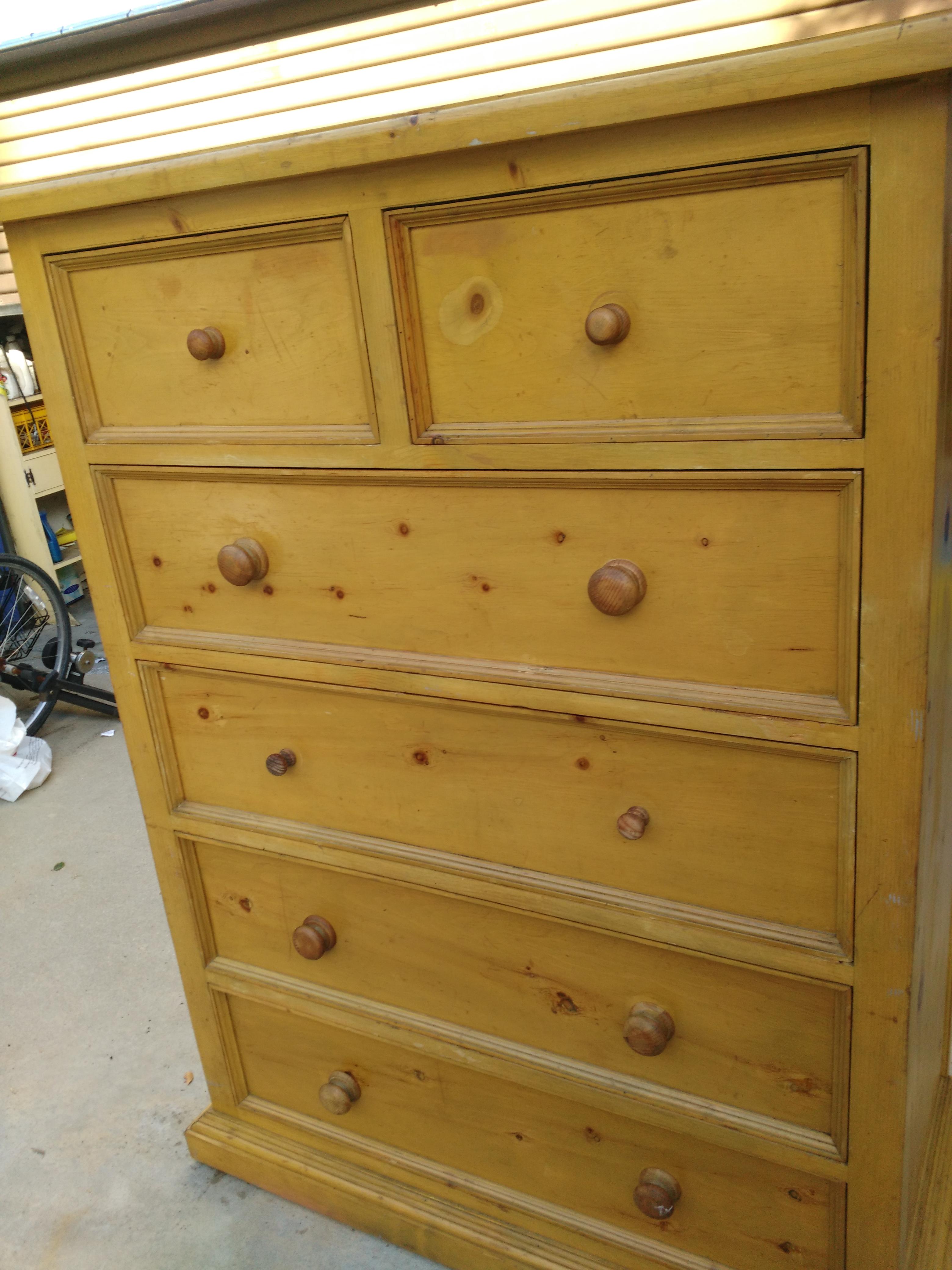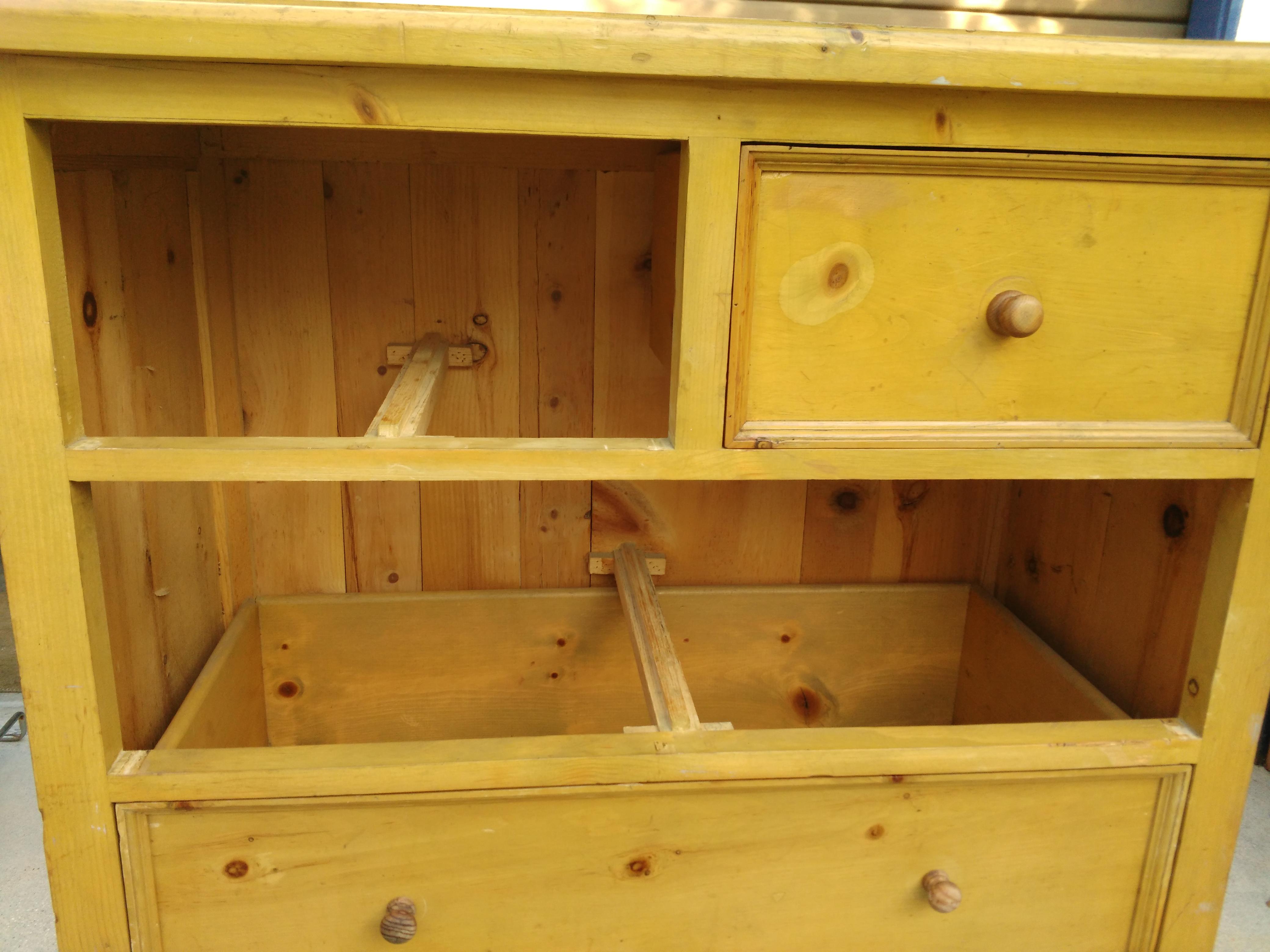 Tall and wide solid pine English style dresser. 6 drawers (2 small, 4 large). Peg and groove construction. Minor aesthetic wear and tear. Dresser dimensions: 42 inches wide, 5 feet tall (60 inches), 20 and 1/2 inches deep. Drawer dimensions: wide 35 and 3/4 inches wide, 8 and 1/2 inches shallow or tall, 16 and 1/2 inches deep. |