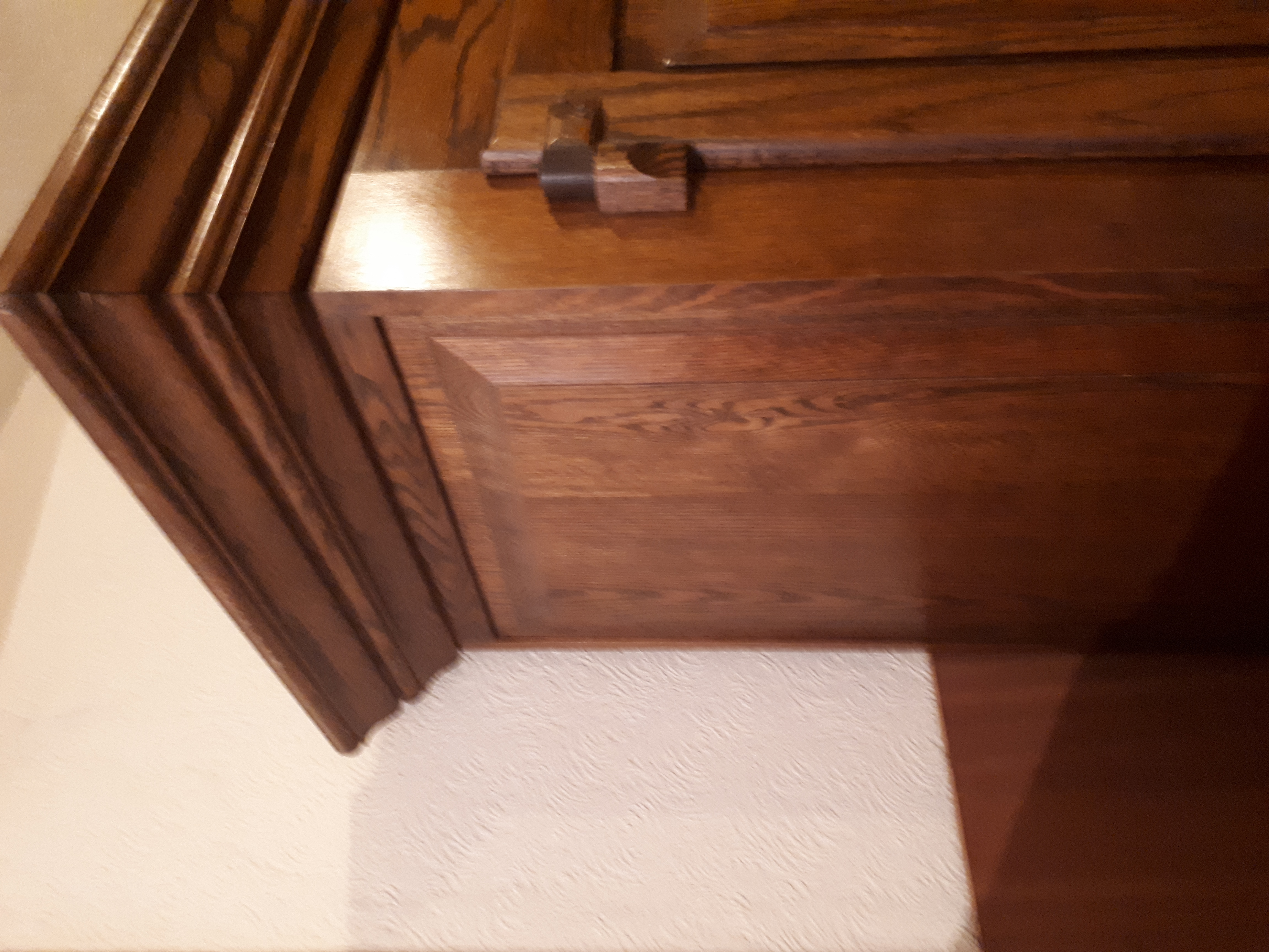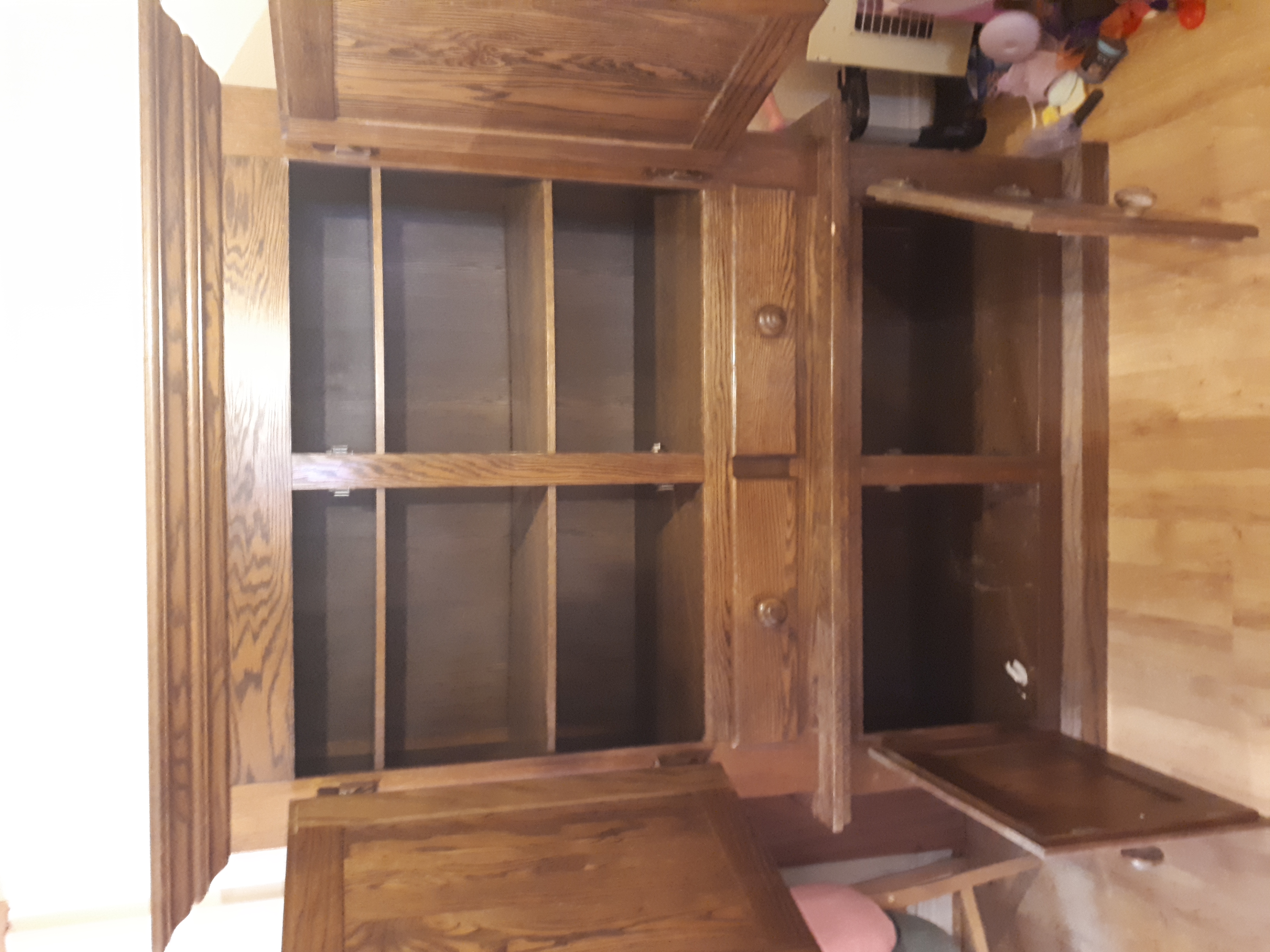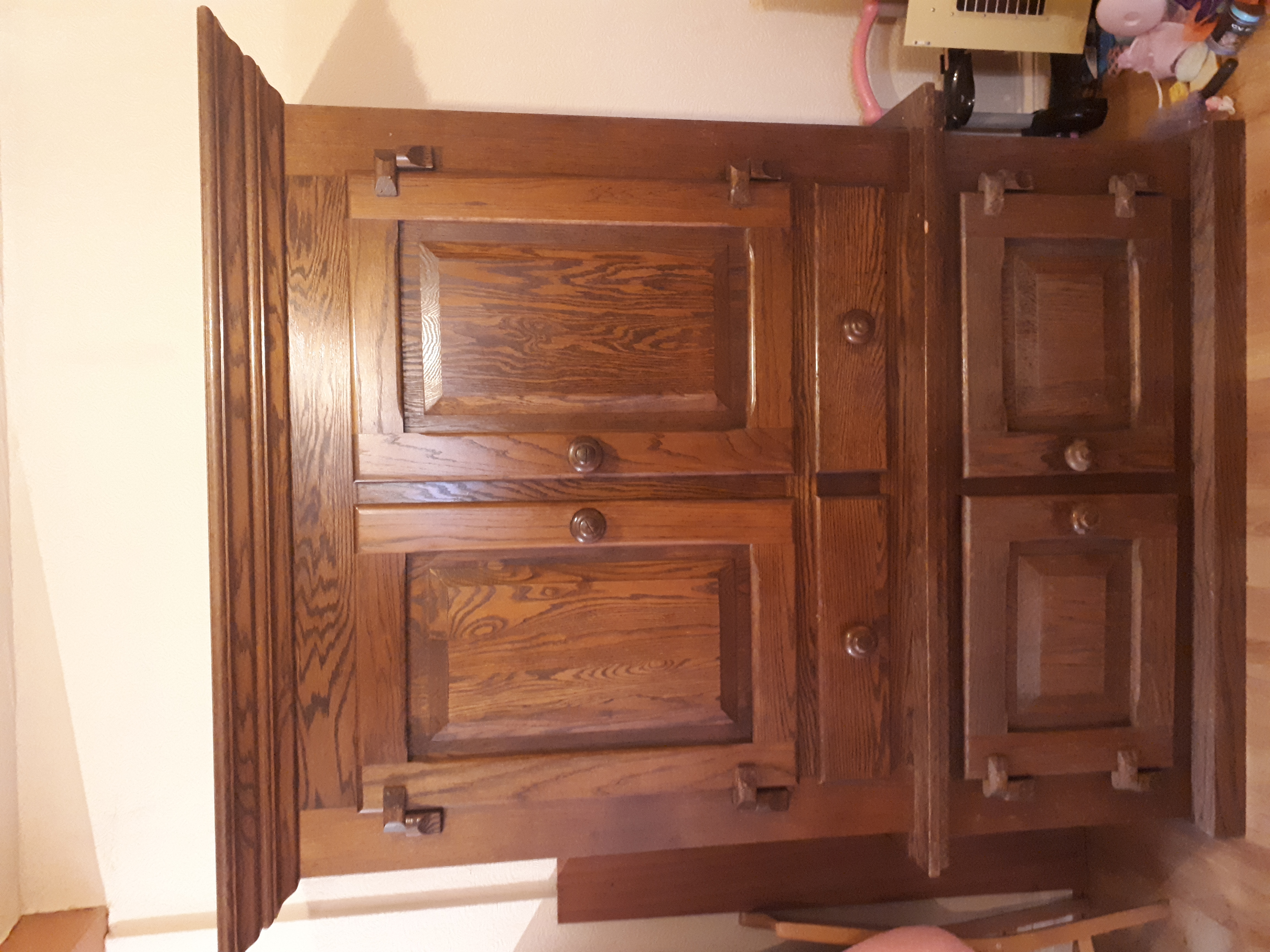 Description Very large, heavy dark solid wood antique cabinet. Comes in two parts so easier to move. Top half has two shelves and two draws, shelf width 50" depth 18". Draws width 19" depth 16". Doors have a twist and lock type handle as Well as magnetic catches (shown in photos) Bottom half has one shelf that measures the same. Over all measurements; Height 73" Width 60" Depth 24"