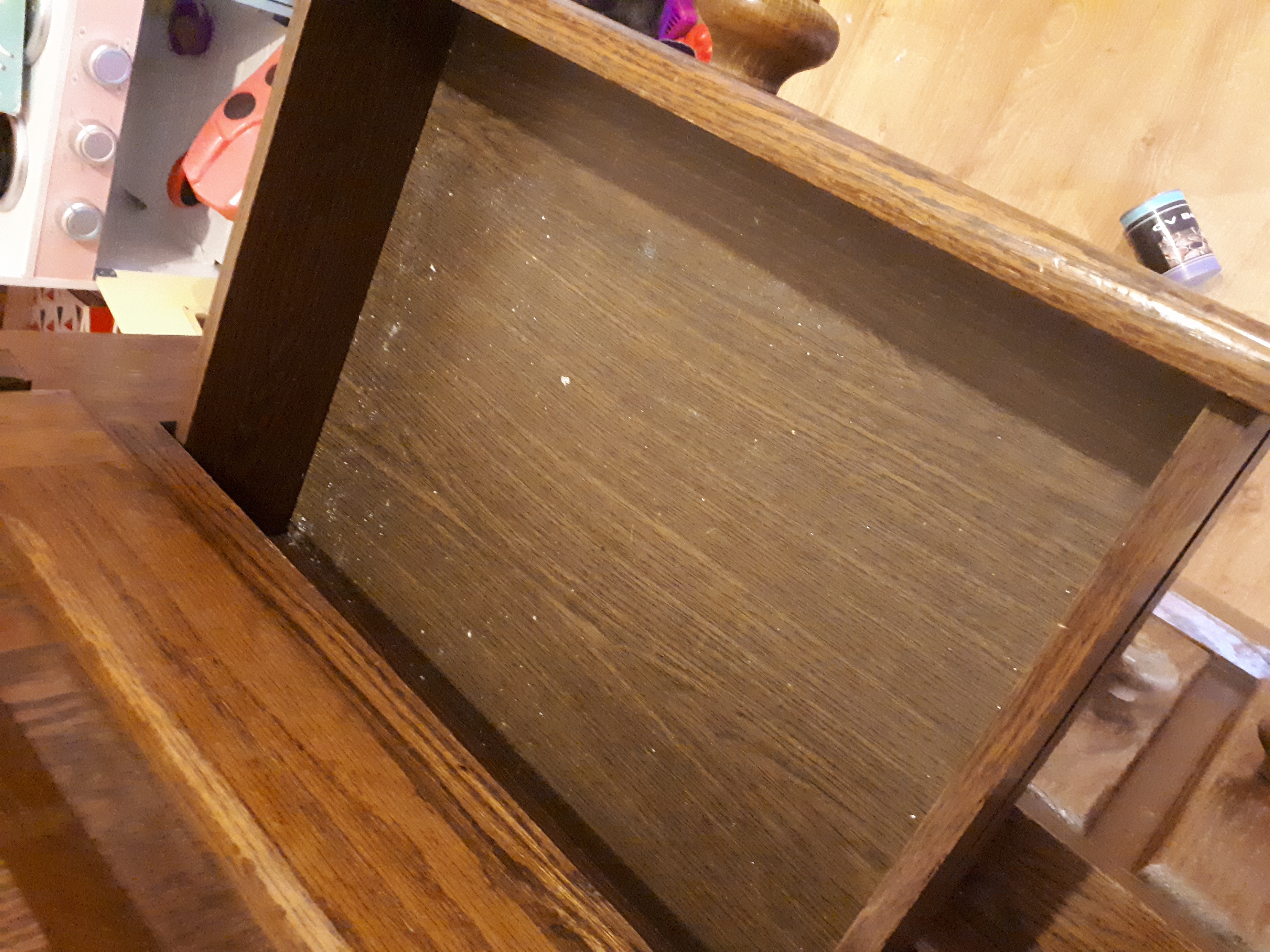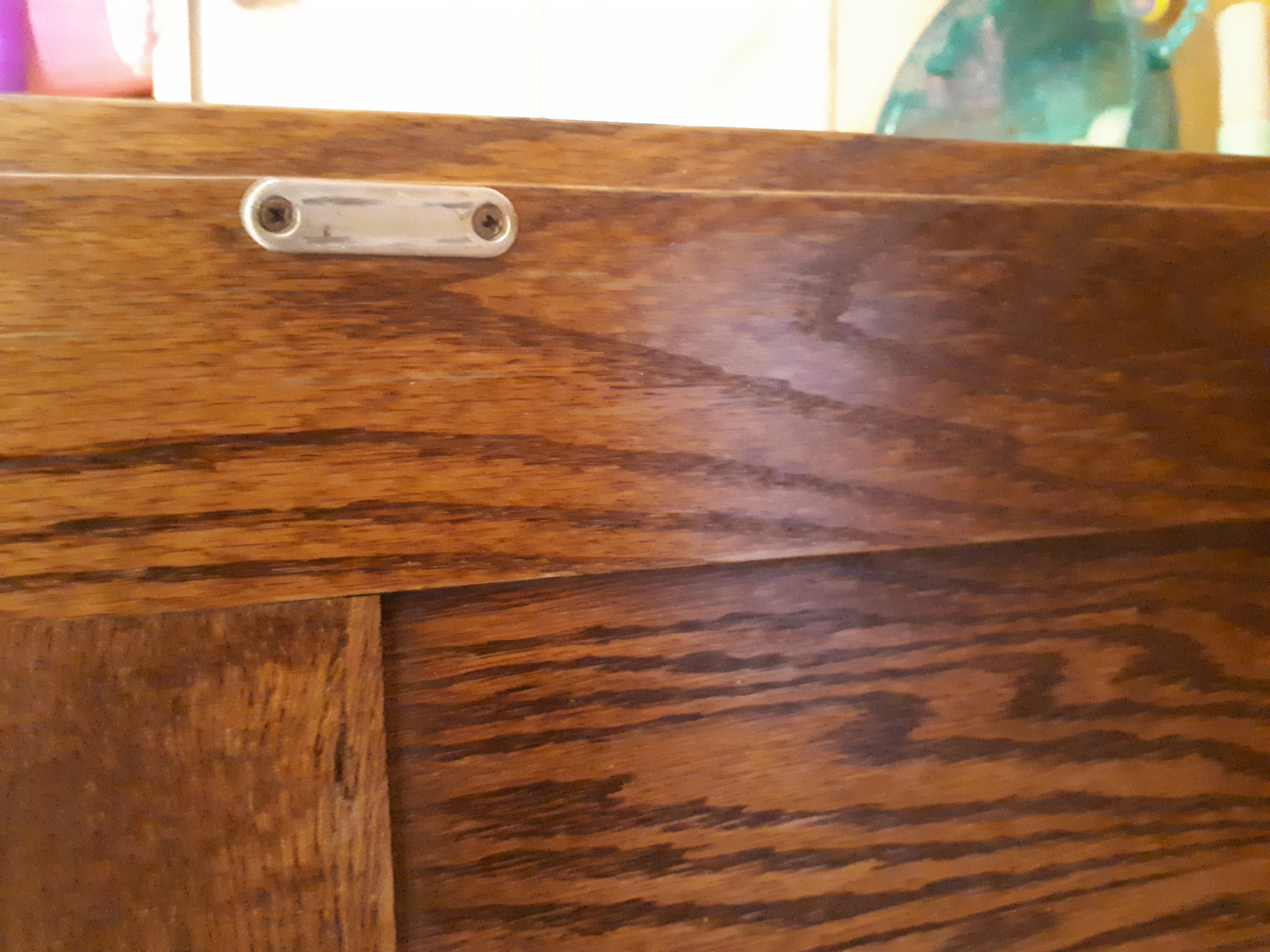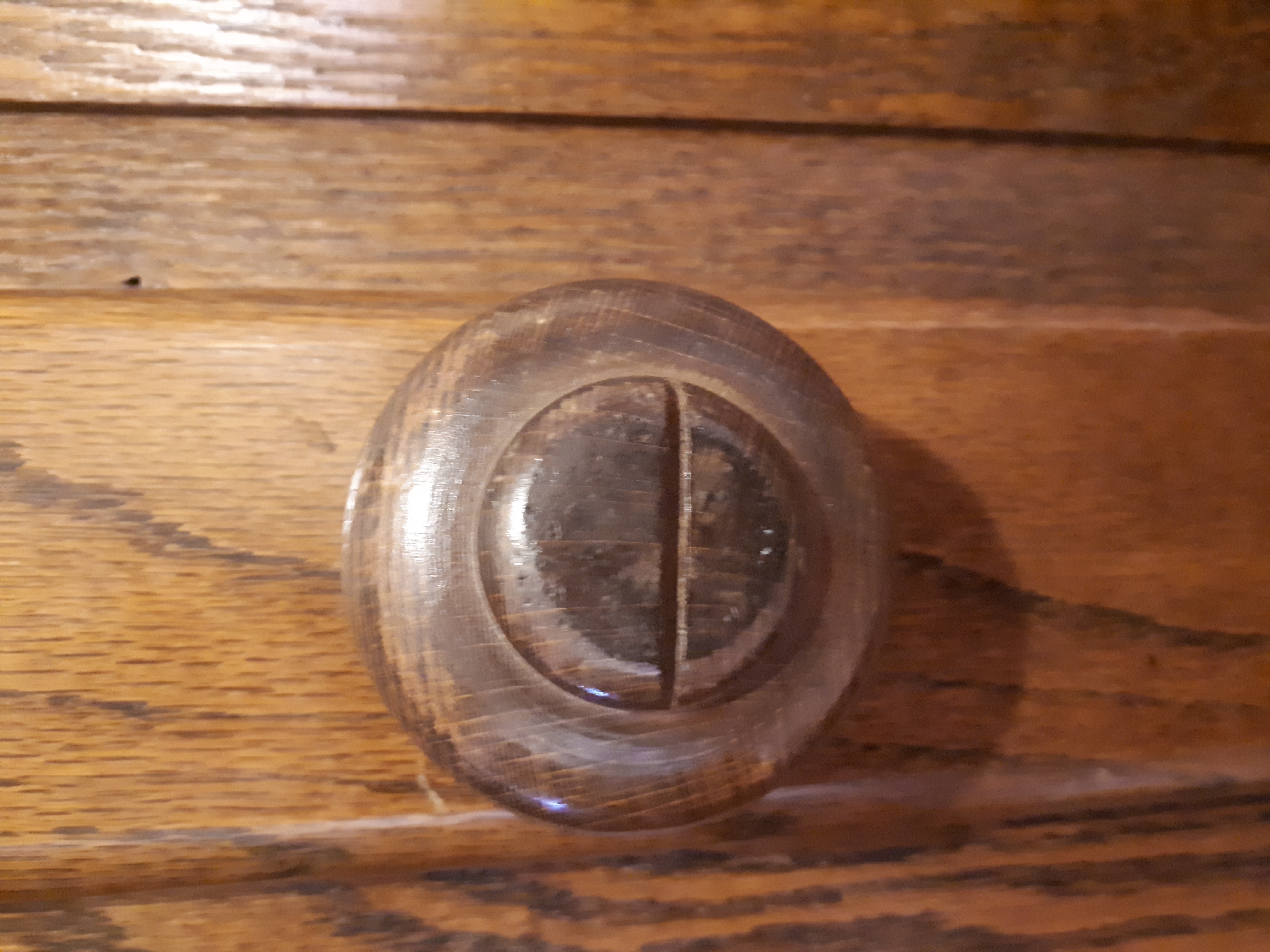 Description Very large, heavy dark solid wood antique cabinet. Comes in two parts so easier to move. Top half has two shelves and two draws, shelf width 50" depth 18". Draws width 19" depth 16". Doors have a twist and lock type handle as Well as magnetic catches (shown in photos) Bottom half has one shelf that measures the same. Over all measurements; Height 73" Width 60" Depth 24"