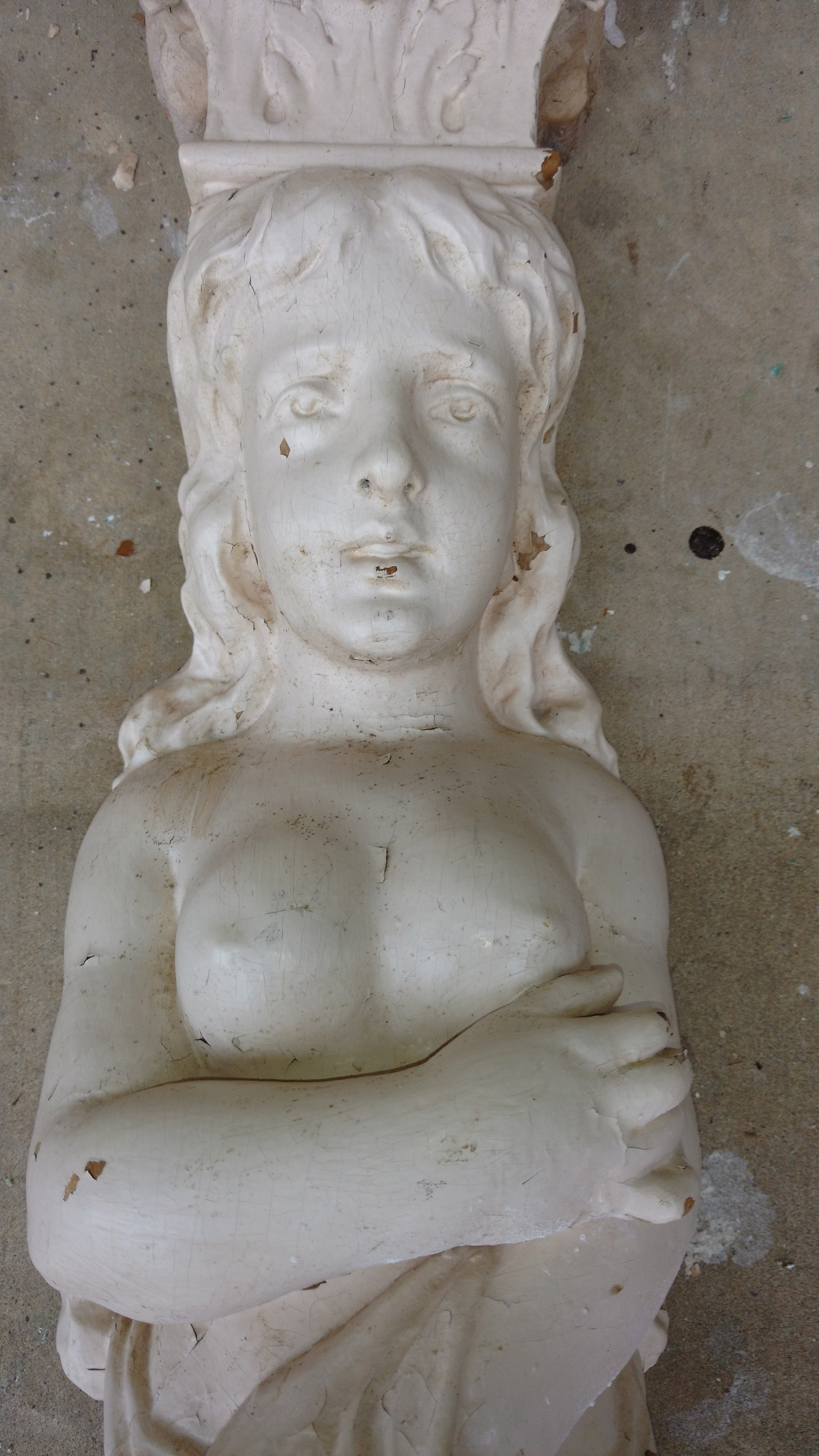 Prices for a pair caryatid architectural elements are all over the board unfortunately, everywhere from $300-$1,000. A professional restoration to remove the added board and paint without harming the finish (if it still exists underneath) may go a good way to increasing its sellability, perhaps combined with a good freshing of the finish and a nice wax polishing.