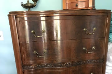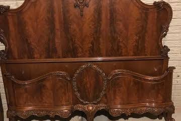 Circa 1930 solid wood cherry bedroom set intricatlly carved including; curved three drawer double dresser, separate mirror, curved five drawer bureau, nightstand, full size headboard and footboard.