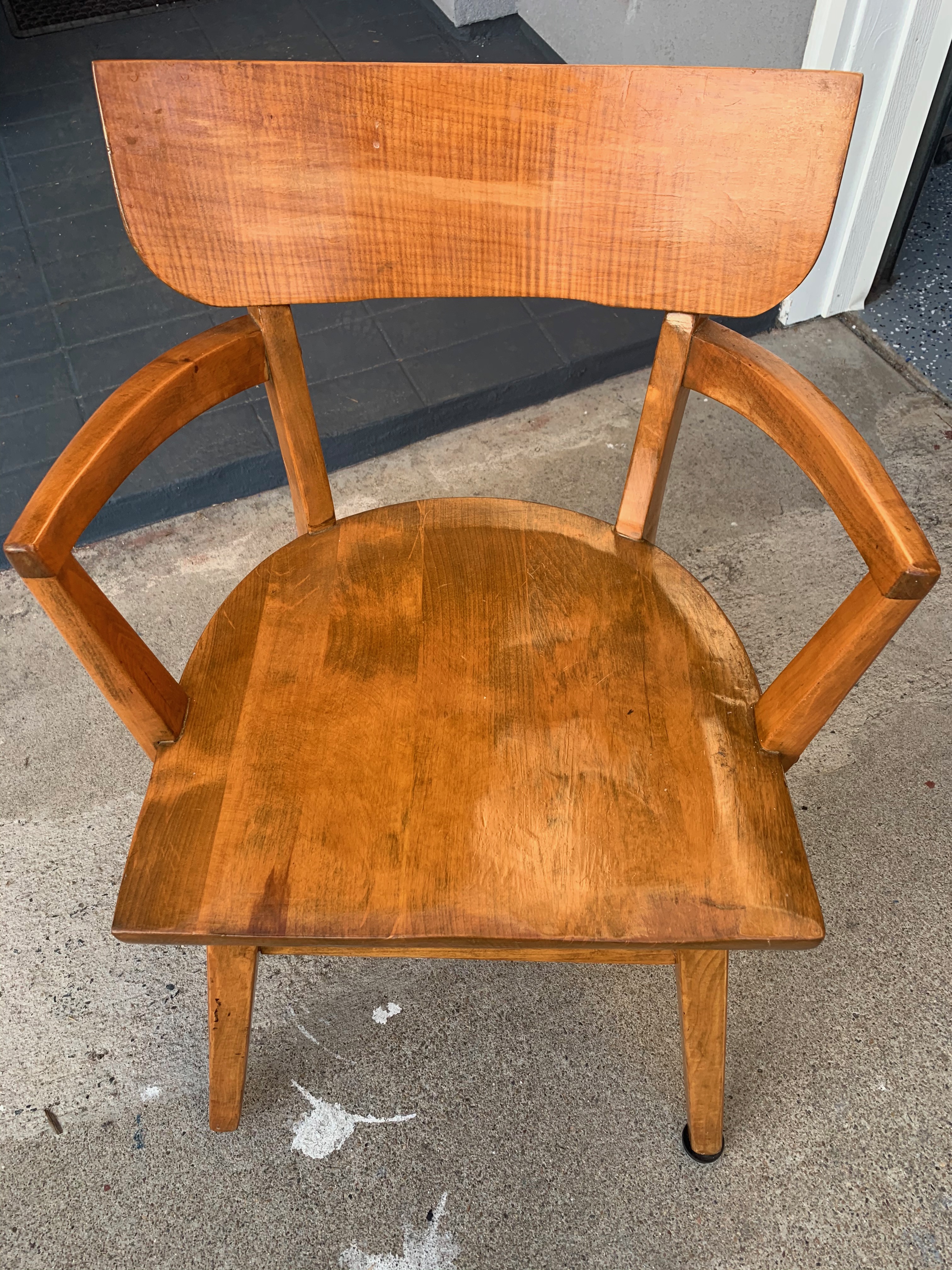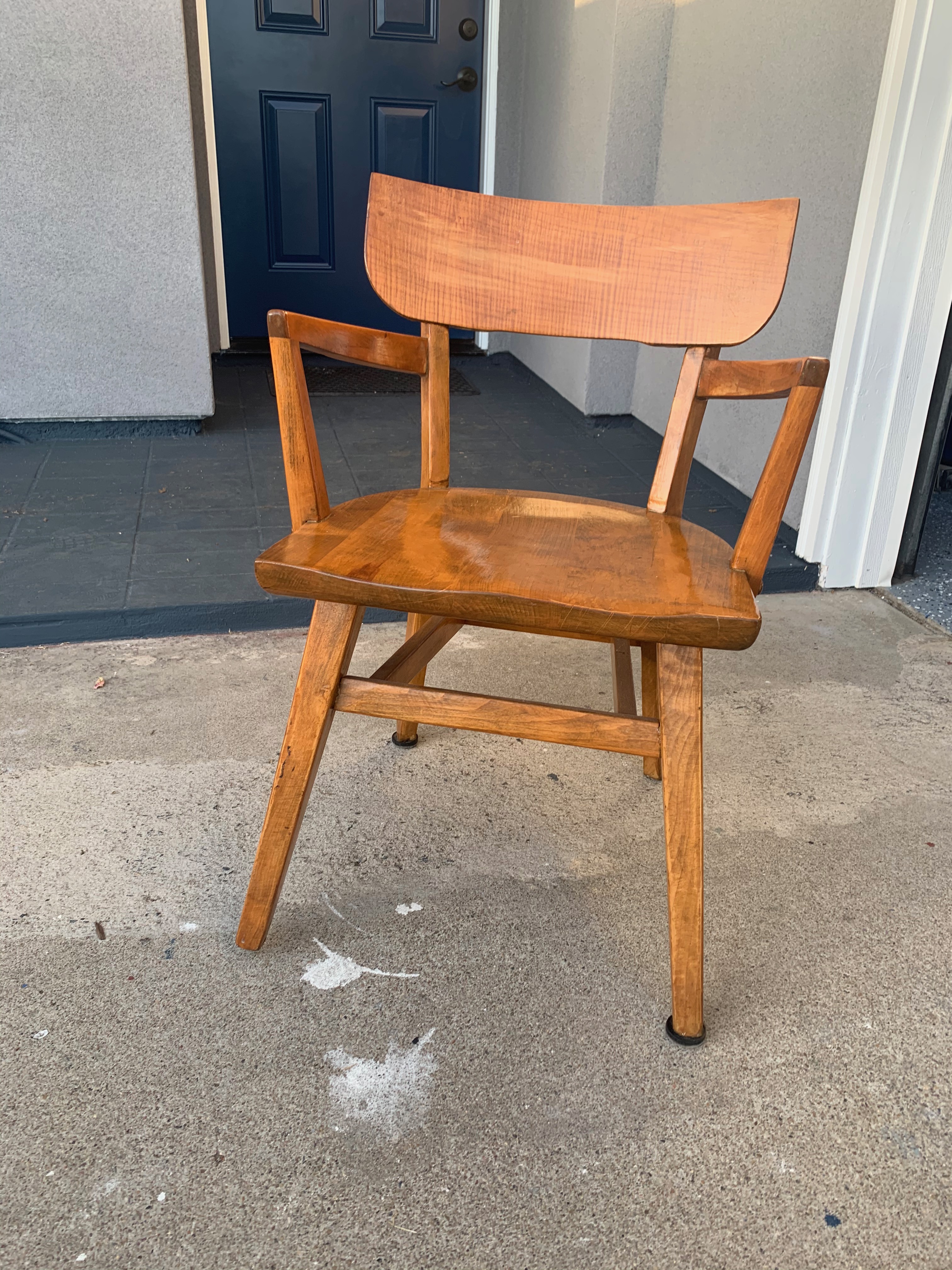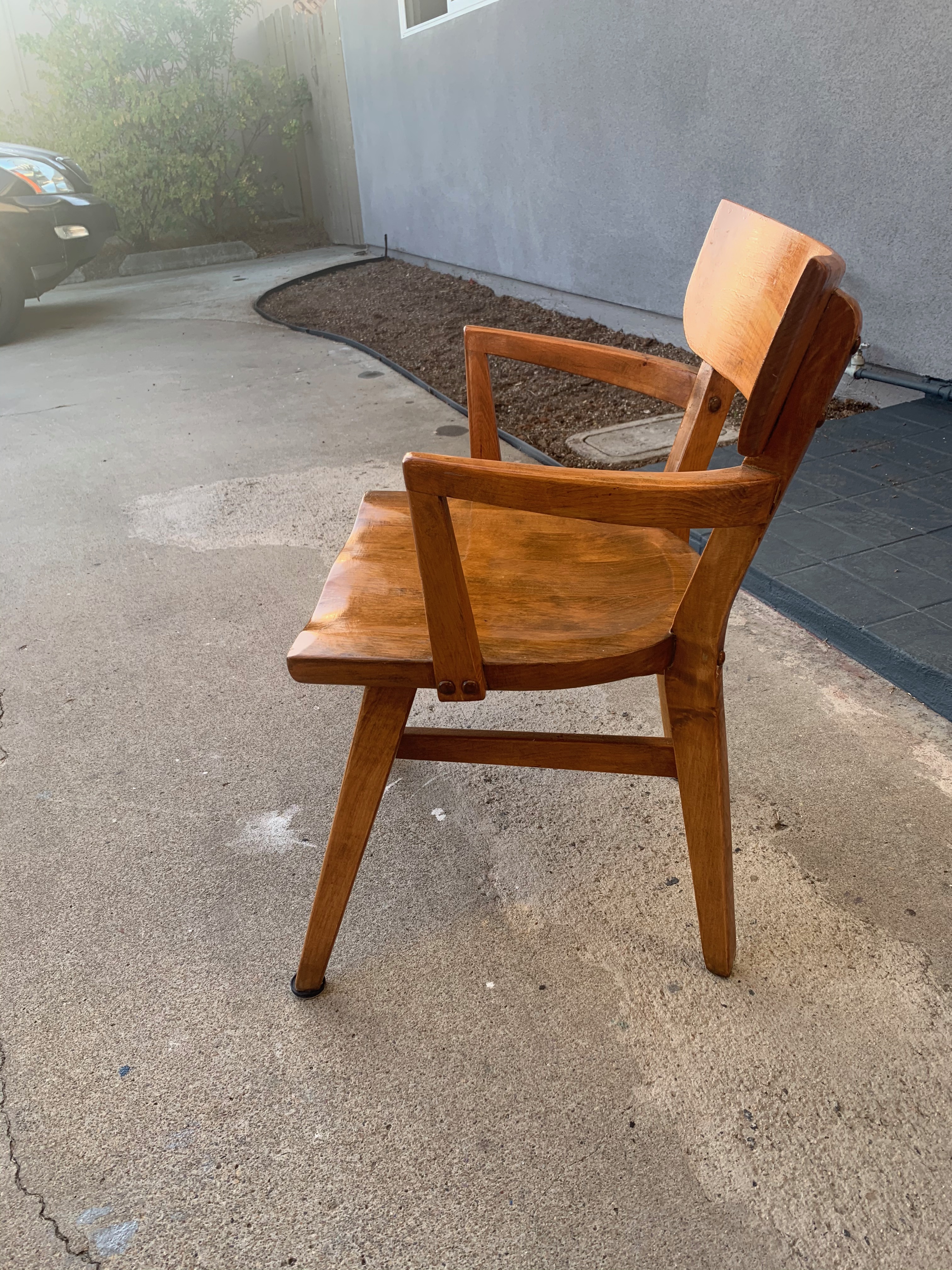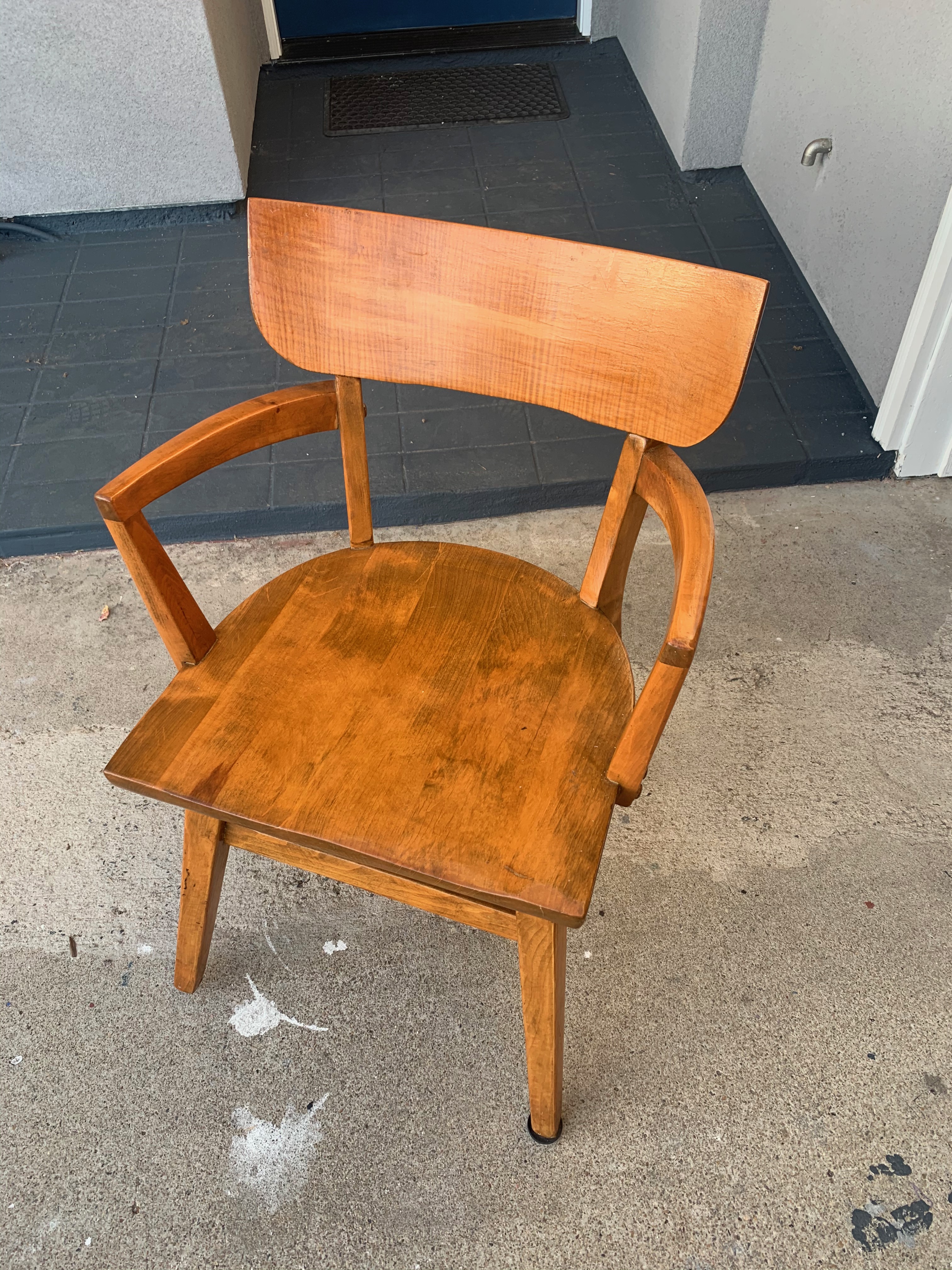I don't know too much about this chair except for the tag. It is solid steardy wood....possibly walnut or oak wood? Very nice curves and wider than a school chair. Any help is much appreciated! Era, style, type of wood, use......