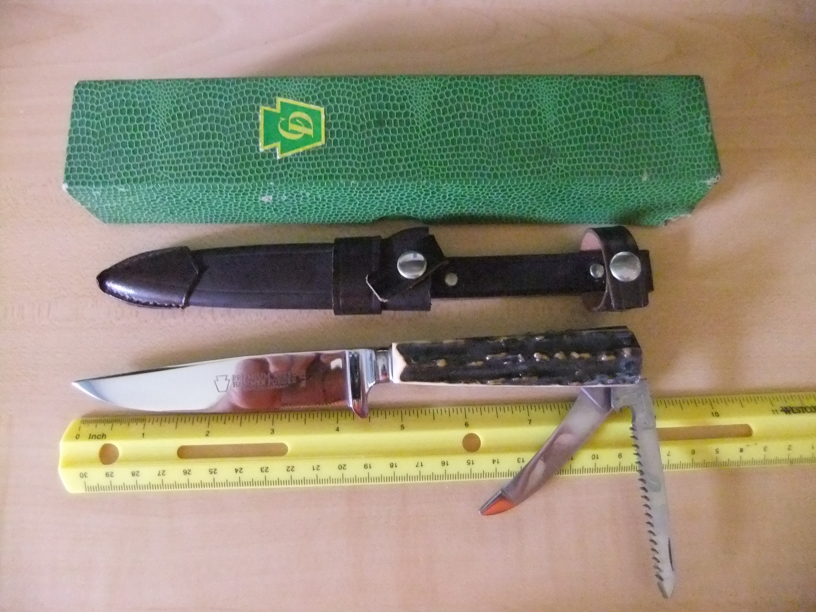 A Solingen - Germany No 231 Premium Steel Hammer Forged Knife in mint condition. This knife has a sheaf blade, and a "pocket-knife handle. The handle includes a pairing knife, saw blade and a cork screw. Antler handle. 8 3/4" in length with a 4 1/4" fixed blade. Includes the original sheaf, box, box insert and I have the sales receipt from the Point of sale dated April 16, 1966. Handle, blade, and box have a manufacturer's Mark that looks like a squared tipped arrow head with the letters CD in the emblem on the box.
