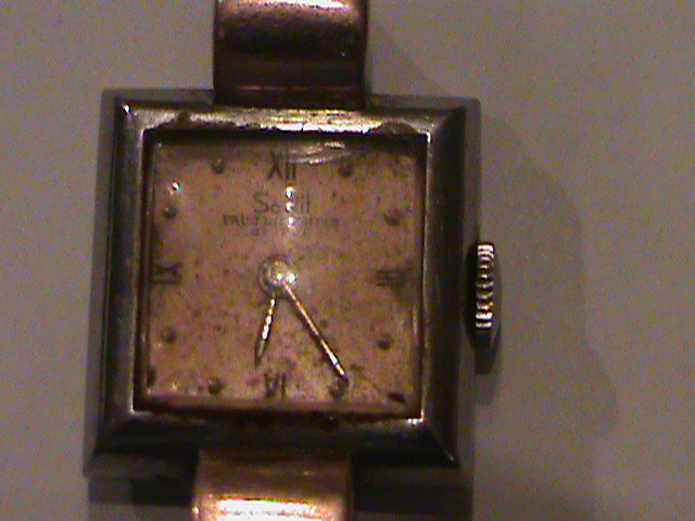 This watch looks to be a rose colored gold. frame around the face is silver in color. the inside face is a rose color, or light pink maybe with the numbers 3, 6, 9, and 12 in roman numerals. The rest of the numbers are just like gold dots. I haven't cleaned this item due to the fact that I'm not sure how to. The band has several marks on it as you can see from the pictures. On the face of the watch it says: Solvil, and under that it says Paul Ditisheim, and under that says Geneve. The watch is rose gold colored, and very beautiful.