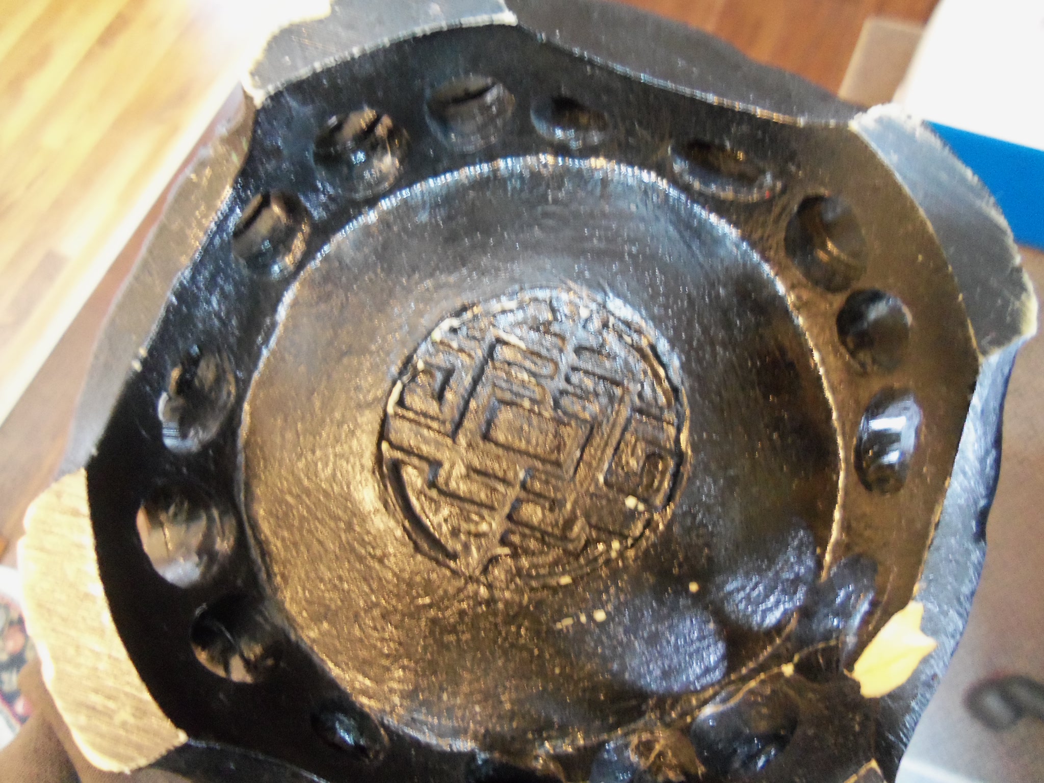 Been in the family for a few generations and we were curious as to what it is and how old it might be. There's some sort of Asian symbol on the bottom of it (at least i think it's Asian). Definitely looks hand crafted. Any help would be appreciated.