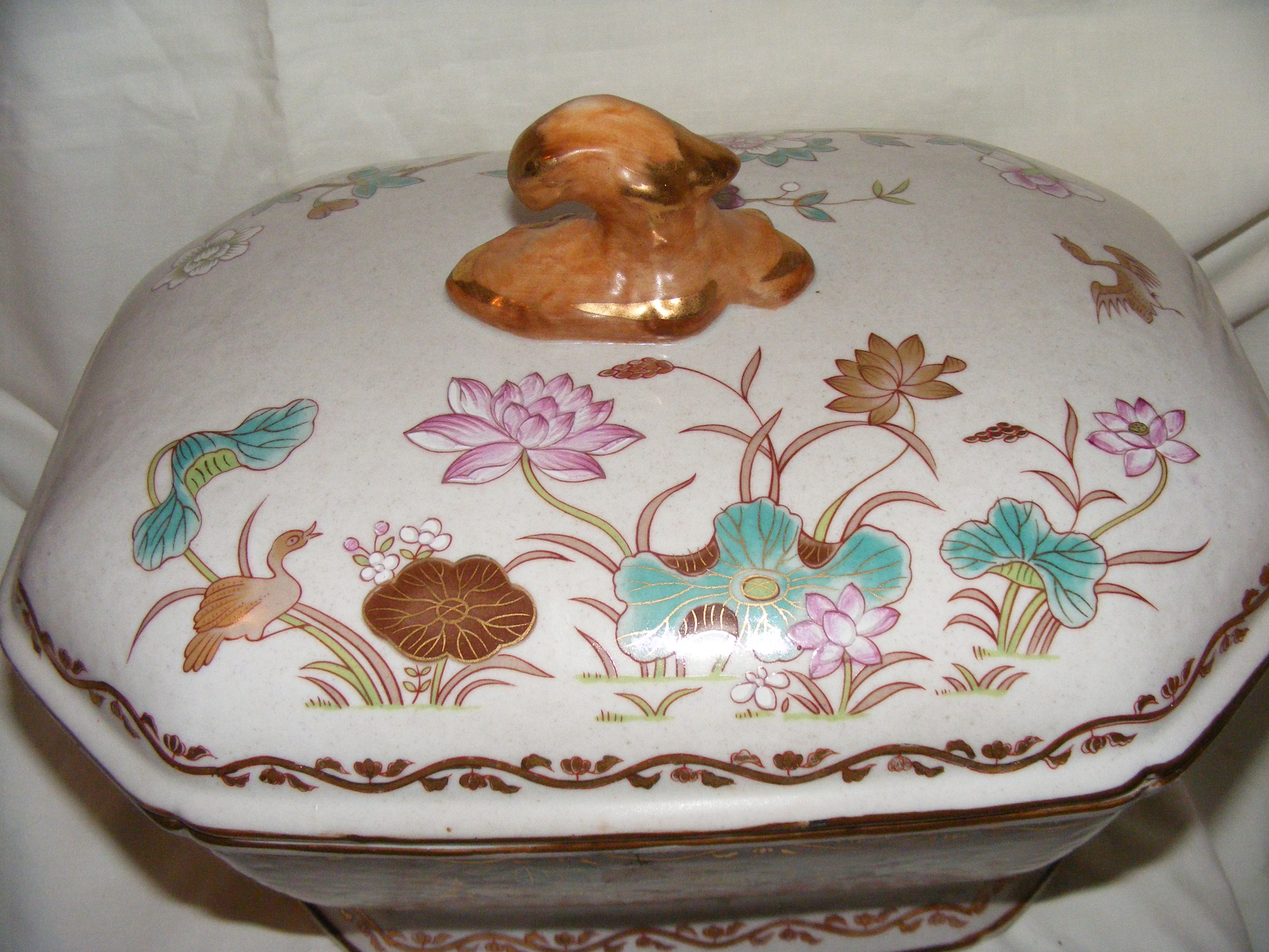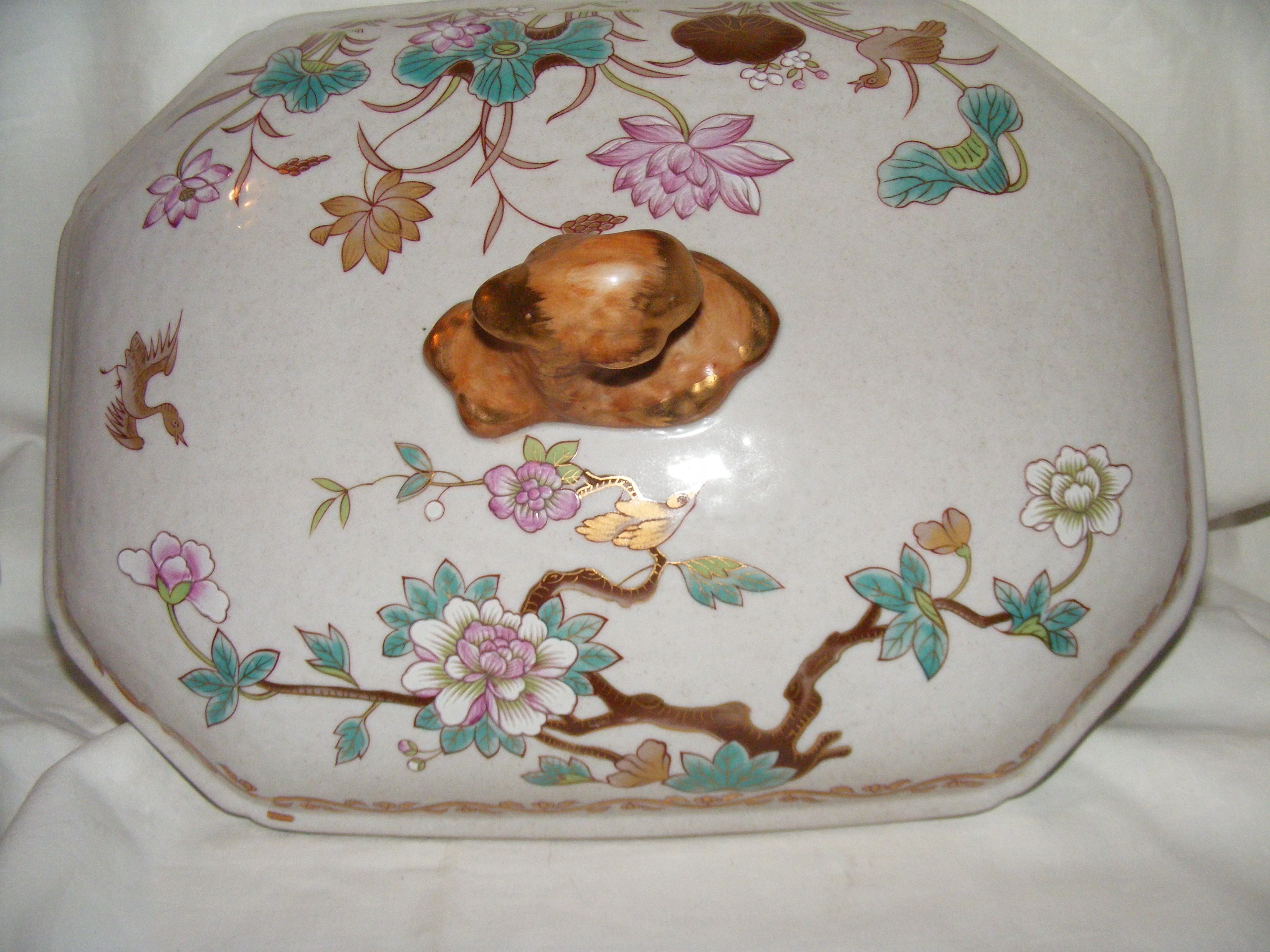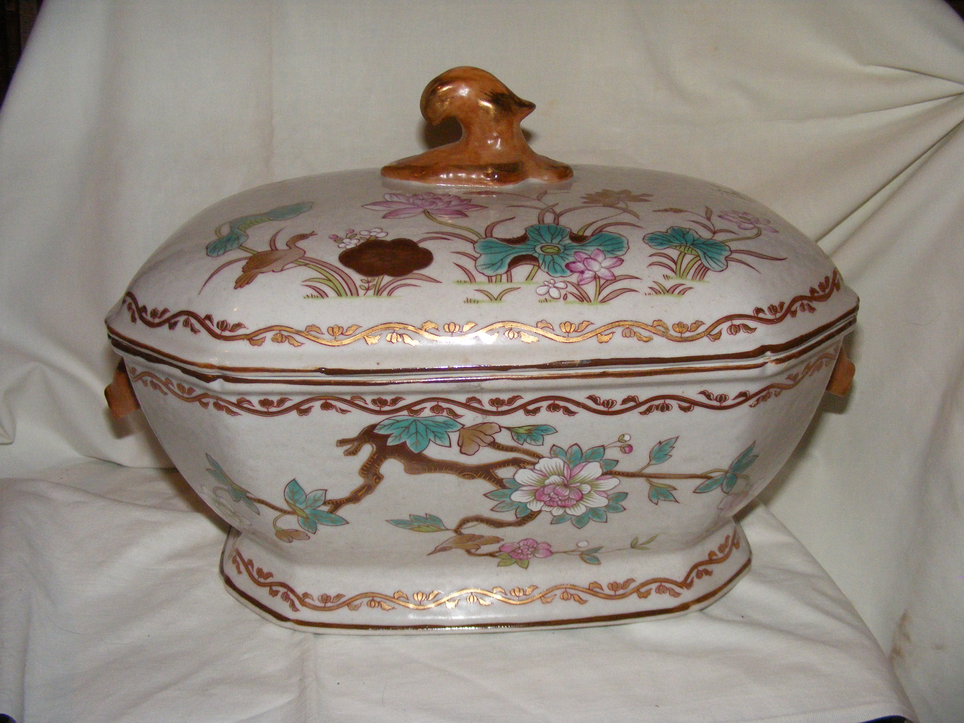 Soup tureen , possibly Chinese Export item. Octangular, accented with what appear to be lotus blossoms in white, pink and light jade green. A substantial piece weighing probably close to 8 lbs. Measures 112" length x 9" width x 8.25 tall. The inside of the bowl is 4.25" deep. Boar head handles.
