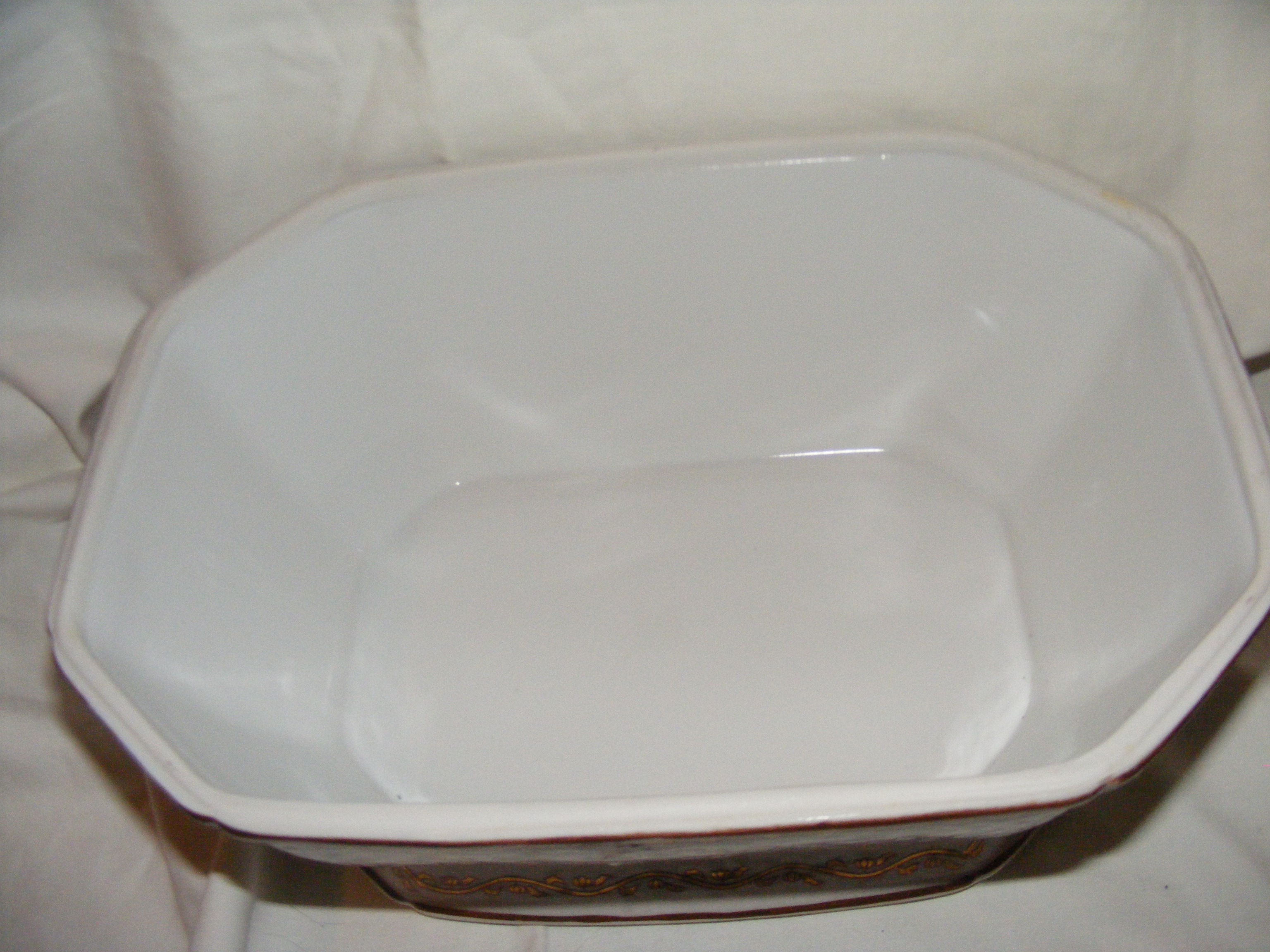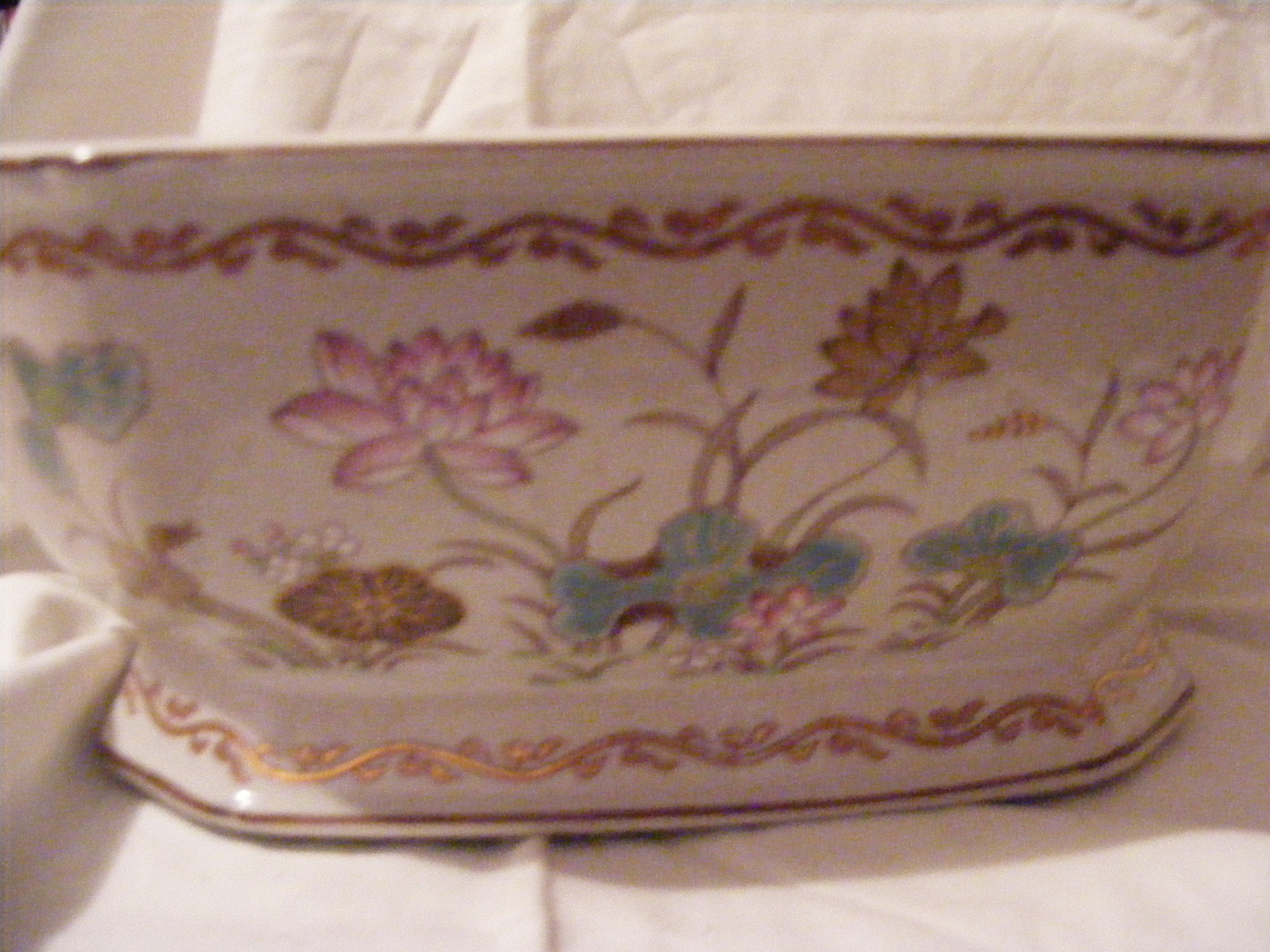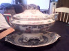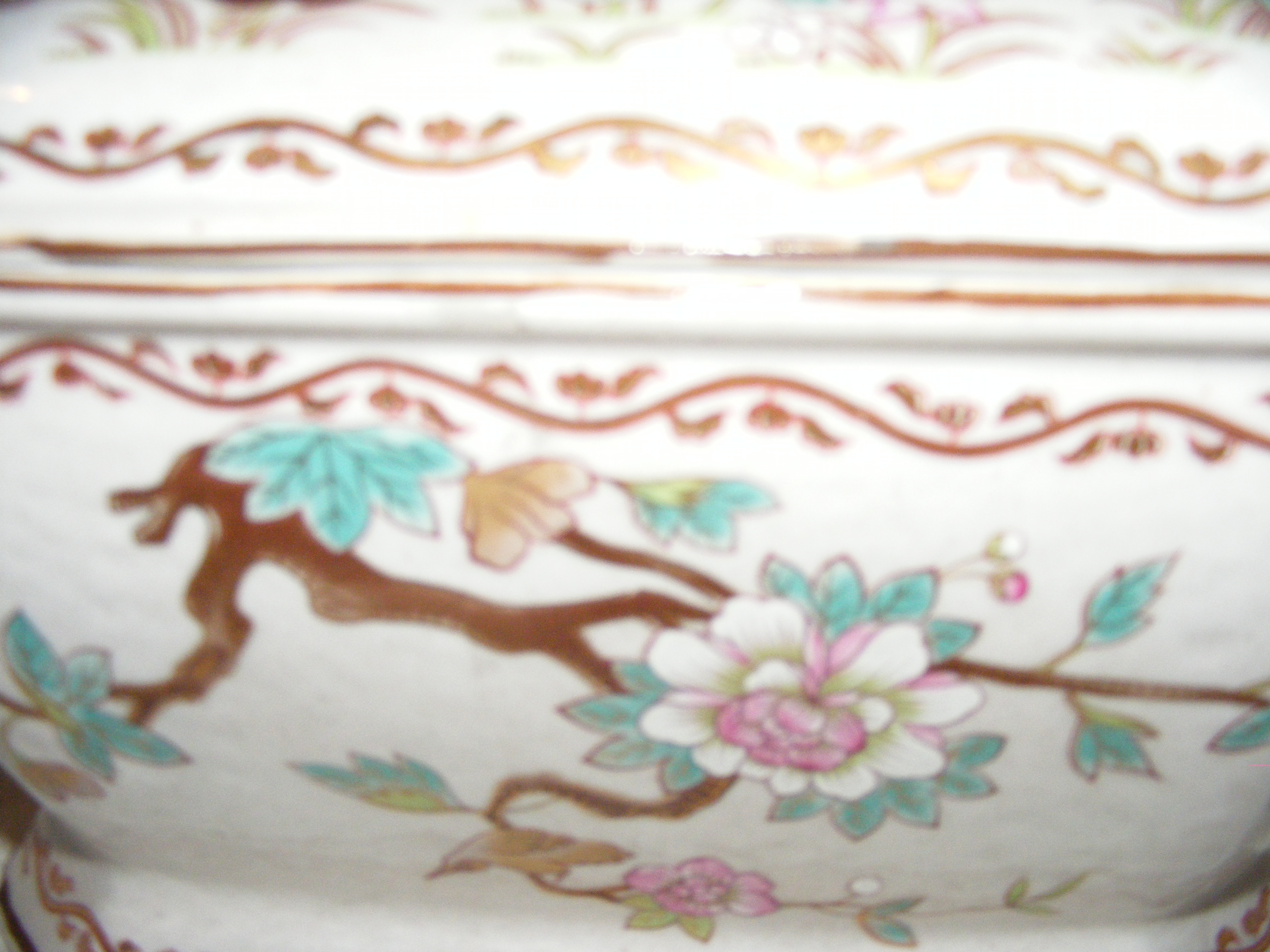 Soup tureen , possibly Chinese Export item. Octangular, accented with what appear to be lotus blossoms in white, pink and light jade green. A substantial piece weighing probably close to 8 lbs. Measures 112" length x 9" width x 8.25 tall. The inside of the bowl is 4.25" deep. Boar head handles.