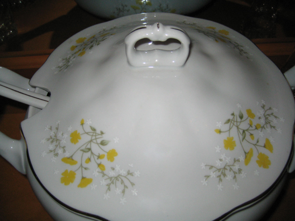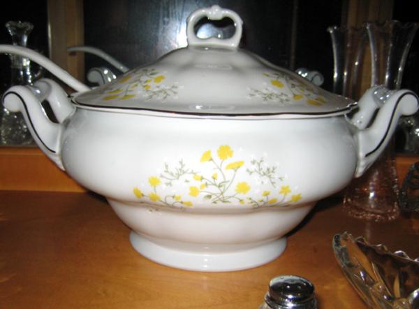 This is a porcelain soup tureen in excellent shape. It is white with images of yellow flowers (looks like a wild flower or dandelion ...) and small star shaped white flowers. There is gold trimming on the lid handle, outer rim of lid, on outer edges of bowl handle and on handle of the spoon. There is no wear of the edging that I can see.