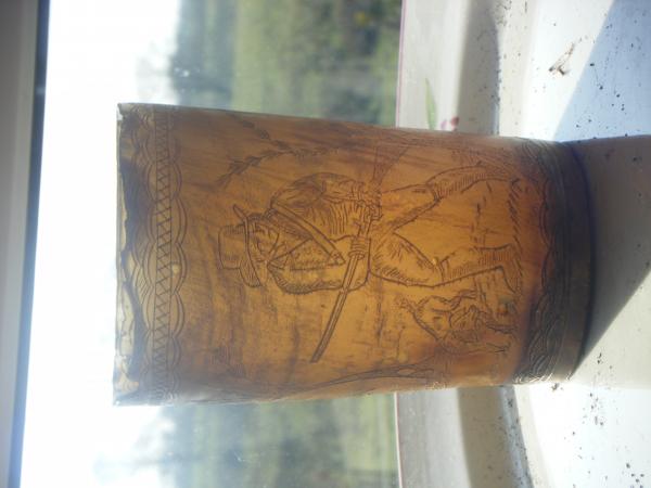 Rare southern english cider cup made from bulls horn ,etched with detailed hunting scenes of the period.