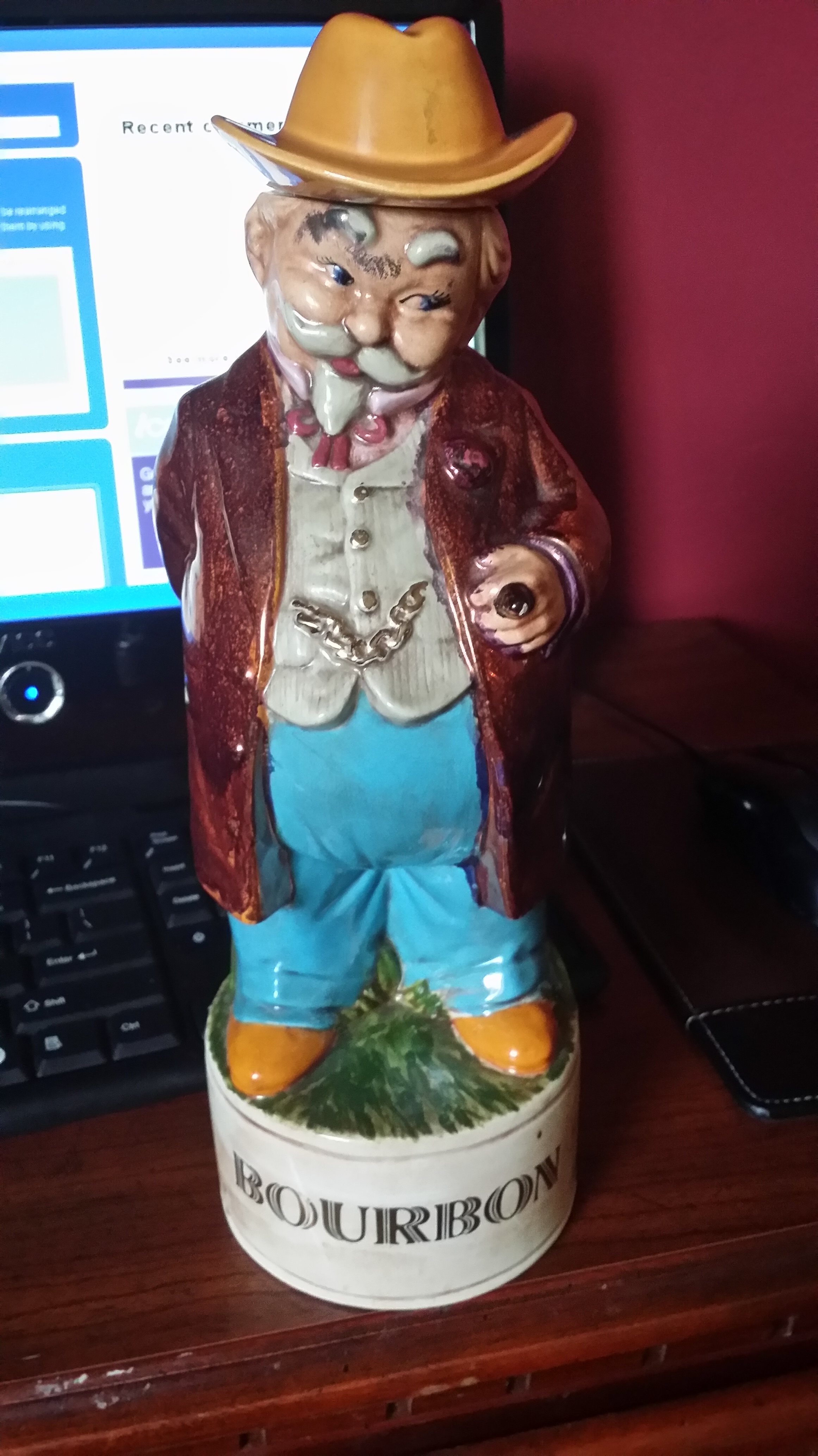 1970s Albertsons Southern Gentleman Bourbon bottle. It has CALLA 1970 hand inscribed on the bottom. his pants are baby blue and his jacket is copper. I have found some online, but none with these colors, or hand inscription. it also has ALBERTSONS machine inscribed on the bottom. His hat comes off as the lid.
