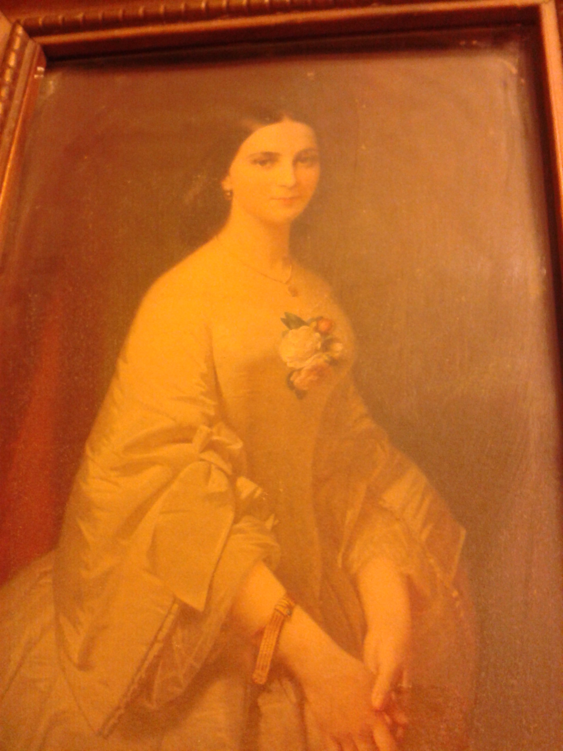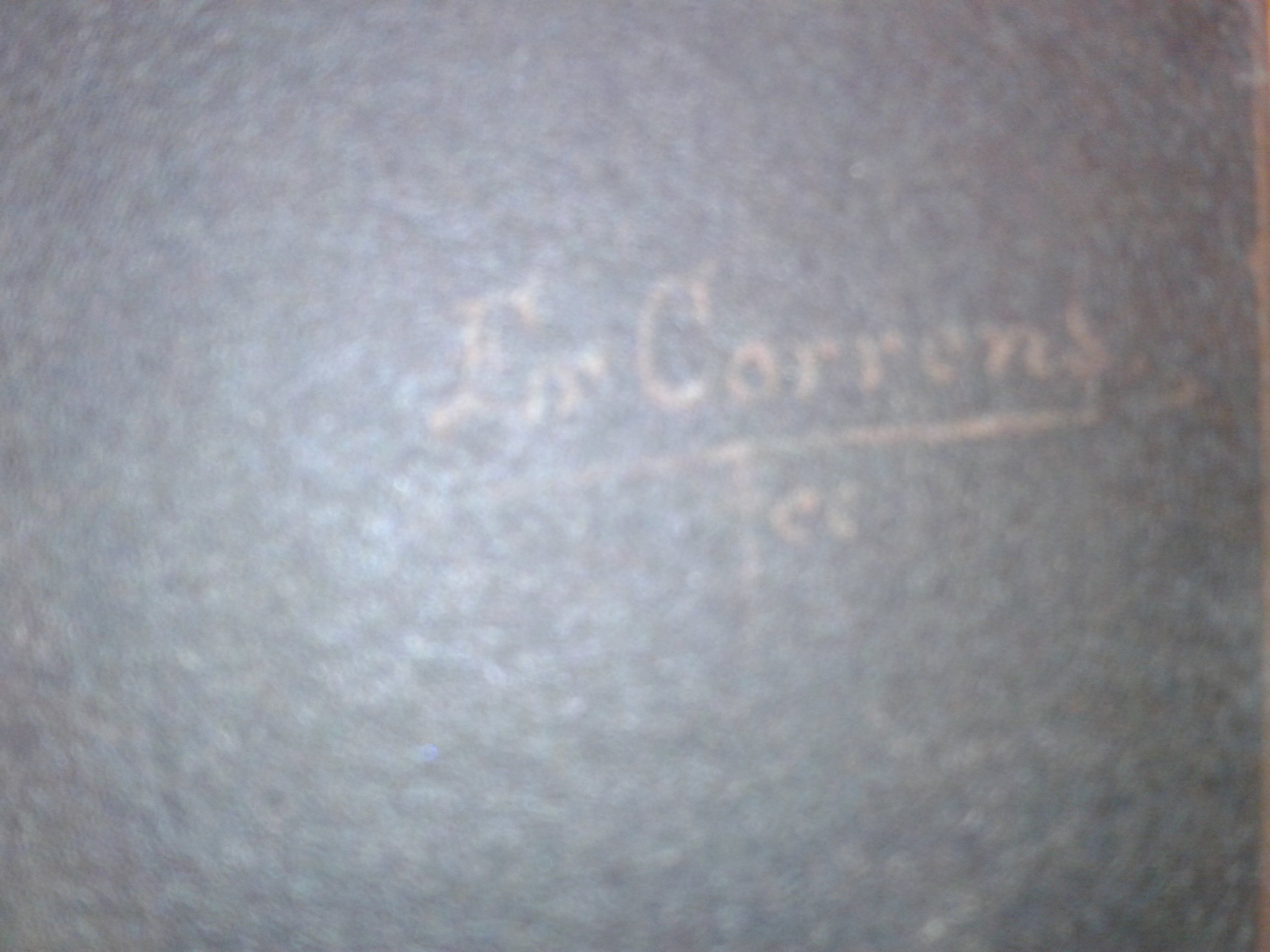 A picture of a lady in a cream gown with roses on chest necklace earring bracelet in wooden frame no date has er correns with fee under on bottom left corner and Morris and bendien Inc in bottom right corner condition is OK has yellowing on back looks about like a 10 by 12 size