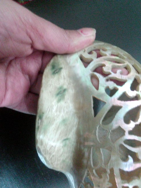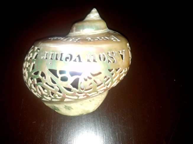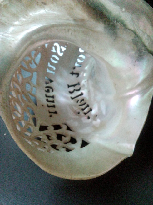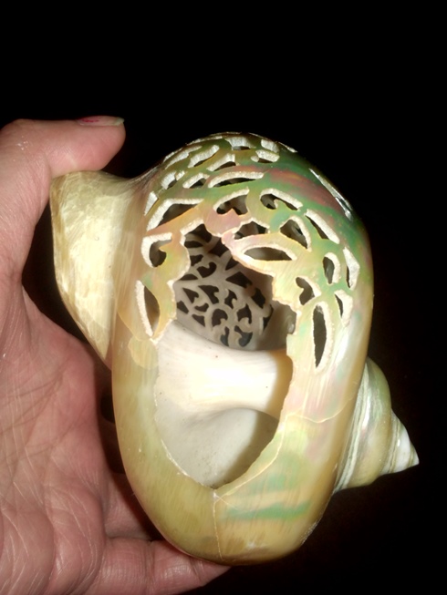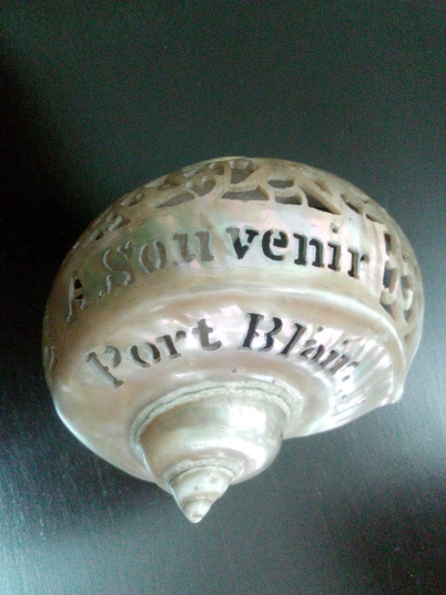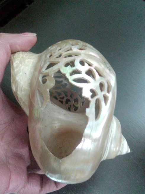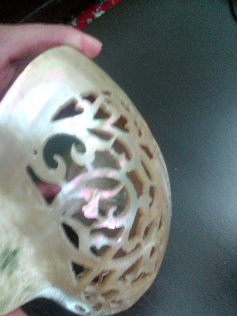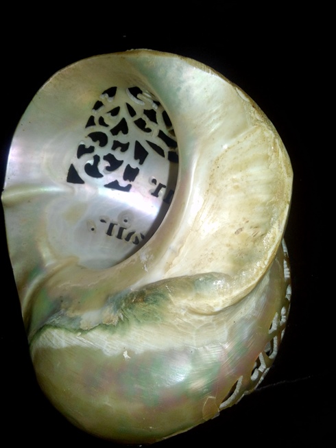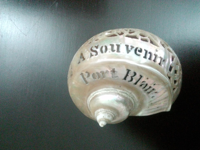 The shell is carved with a beautiful filigree and was coloured like a mother of pearl. But over the years, not only has a part of the filigree broken, the colour too looks worn and I'm not really quite sure of what material is it. It is well over 50 years old and the carving also says 'Souvenir Port Blair'. I tried to search the internet to find a similar item but was very unsuccessful.