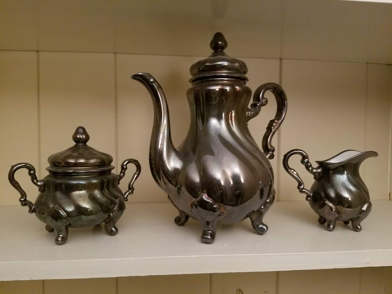 This is a silver plated tea set that I purchased at an antique store about 10 years ago. I just realized it was silver a couple of days ago when I Googled it. It is an excellent condition other than needing to be polished, with no chips, scratches, or cracks. The sticker on the bottom of each piece says Spahr 1000/1000 feinsilberauflage.