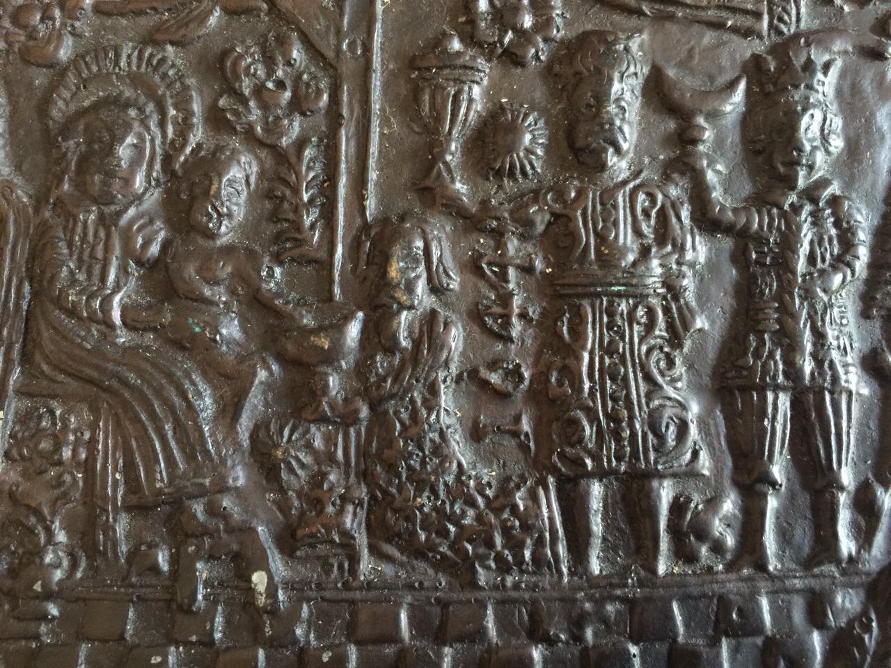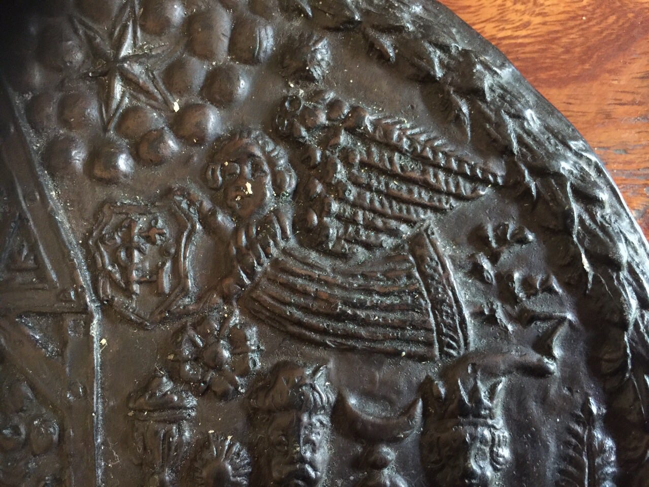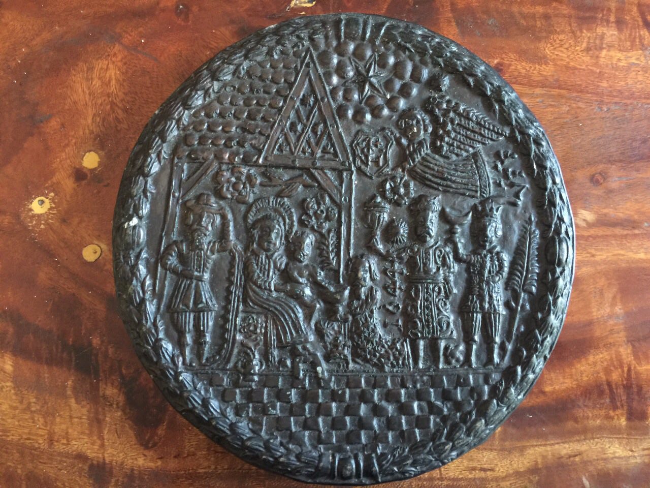 It appears to be made out of bronze and has the date 1644 inscribed on it. The diameter is roughly 22.5 cm., 19 mm. in thickness and the weight is around 1.6 kilograms. Signed by a VFF.