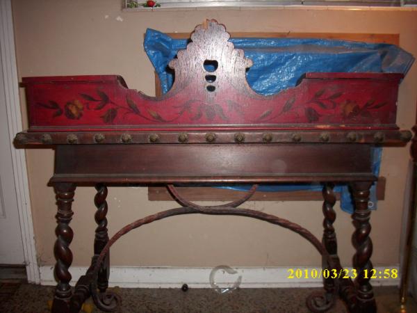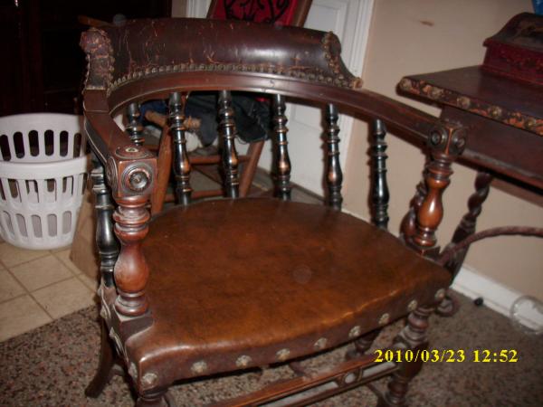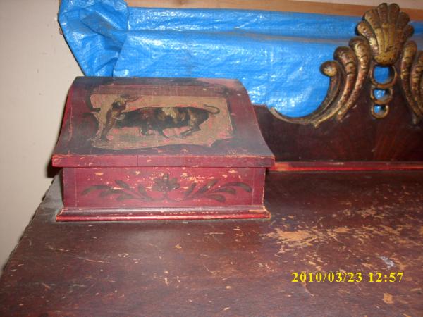 This spanish desk was purchased by my grandparents at around 1930 for $500.00 from an antique store. They lived in Tampa Fl, but unkown as to where it was purchased. It is a sturdy spanish hardwood desk with a leather worktop and wrought iron bracing underneath. The leather on the desk and the chair is anchored with metal(not sure what kind)caps 1" in diameter that look like ornate flowers. There are two compartments at the rear of the worktop at the corners. they have painted pictures of matadors and bulls on the sloped tops. There is a headboard at the rear between the compartments that slopes down and then rises up in the center what appears to be three waves on either side meeting into what looks like a sea shell with three semi-circle holes under the shell. there is a drawer under the worktop. The desk and chair are remarkably comfortable.